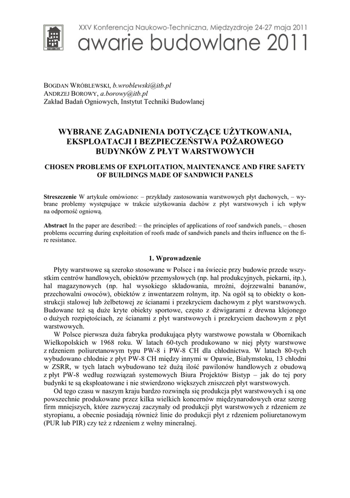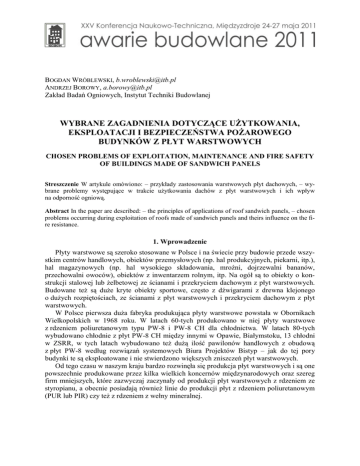 BOGDAN WRÓBLEWSKI, [email protected] ANDRZEJ BOROWY, [email protected] Zakład Badań Ogniowych, Instytut Techniki Budowlanej WYBRANE ZAGADNIENIA DOTYCZĄCE UśYTKOWANIA, EKSPLOATACJI I BEZPIECZEŃSTWA POśAROWEGO BUDYNKÓW Z PŁYT WARSTWOWYCH CHOSEN PROBLEMS OF EXPLOITATION, MAINTENANCE AND FIRE SAFETY OF BUILDINGS MADE OF SANDWICH PANELS Streszczenie W artykule omówiono: – przykłady zastosowania warstwowych płyt dachowych, – wybrane problemy występujące w trakcie uŜytkowania dachów z płyt warstwowych i ich wpływ na odporność ogniową. Abstract In the paper are described: – the principles of applications of roof sandwich panels, – chosen problems occurring during exploitation of roofs made of sandwich panels and theirs influence on the fire resistance. 1. Wprowadzenie Płyty warstwowe są szeroko stosowane w Polsce i na świecie przy budowie przede wszystkim centrów handlowych, obiektów przemysłowych (np. hal produkcyjnych, piekarni, itp.), hal magazynowych (np. hal wysokiego składowania, mroźni, dojrzewalni bananów, przechowalni owoców), obiektów z inwentarzem rolnym, itp. Na ogół są to obiekty o konstrukcji stalowej lub Ŝelbetowej ze ścianami i przekryciem dachowym z płyt warstwowych. Budowane teŜ są duŜe kryte obiekty sportowe, często z dźwigarami z drewna klejonego o duŜych rozpiętościach, ze ścianami z płyt warstwowych i przekryciem dachowym z płyt warstwowych. W Polsce pierwsza duŜa fabryka produkująca płyty warstwowe powstała w Obornikach Wielkopolskich w 1968 roku. W latach 60-tych produkowano w niej płyty warstwowe z rdzeniem poliuretanowym typu PW-8 i PW-8 CH dla chłodnictwa. W latach 80-tych wybudowano chłodnie z płyt PW-8 CH między innymi w Opawie, Białymstoku, 13 chłodni w ZSRR, w tych latach wybudowano teŜ duŜą ilość pawilonów handlowych z obudową z płyt PW-8 według rozwiązań systemowych Biura Projektów Bistyp – jak do tej pory budynki te są eksploatowane i nie stwierdzono większych zniszczeń płyt warstwowych. Od tego czasu w naszym kraju bardzo rozwinęła się produkcja płyt warstwowych i są one powszechnie produkowane przez kilka wielkich koncernów międzynarodowych oraz szereg firm mniejszych, które zazwyczaj zaczynały od produkcji płyt warstwowych z rdzeniem ze styropianu, a obecnie posiadają równieŜ linie do produkcji płyt z rdzeniem poliuretanowym (PUR lub PIR) czy teŜ z rdzeniem z wełny mineralnej. 544 Wróblewski B. i inni: Wybrane zagadnienia dotyczące uŜytkowania, eksploatacji i... W ostatnich latach wybudowano w naszym kraju duŜą liczbę obiektów handlowych, magazynowych, przemysłowych, sportowych i biurowych z lekką obudową z płyt warstwowych. Istnieją równieŜ w Polsce obiekty zrealizowane 20 i 30 lat temu i wcześniej, równieŜ w obudowie lekkiej z płyt warstwowych ściennych i dachowych. W tych budynkach niejednokrotnie przeprowadzano modernizacje, remonty i adaptacje dla innego przeznaczenia. Nie zawsze w takich sytuacjach w sposób wystarczający zwraca się uwagę na stan istniejących przegród, konsekwencje przeprowadzanych zmian i konsekwencje takiego stanu dla faktycznego, a nie tylko formalnego, spełnienia wymagań stawianych w zakresie bezpieczeństwa poŜarowego. 2. Odporność ogniowa elementów budynku wykonywanych z płyt warstwowych Wymagania i metody badań płyt warstwowych ściennych i dachowych produkowanych obecnie, takŜe w zakresie właściwości ogniowych, są określone w zharmonizowanej normie wyrobu PN-EN 14509:2010 [1]. W polskich przepisach techniczno-budowlanych wymaga się, aby, w przypadku poŜaru, ściany nienośne spełniały funkcję oddzielającą, a dach spełniał funkcję nośną i funkcję oddzielającą w budynku przez określony czas. W związku z tym ściany są klasyfikowane z uwagi na kryterium szczelności ogniowej i izolacyjności ogniowej (EI), natomiast dachy są klasyfikowane z uwagi na kryteria nośności ogniowej i szczelności ogniowej (RE) lub nośności ogniowej, szczelności ogniowej i izolacyjności ogniowej (REI). Znormalizowane warunki badań odporności ogniowej elementów budynku, dotyczące temperatury w piecu, warunków ciśnienia, sposobu obciąŜenia elementów, warunków zamocowania oraz sposobu wykonywania pomiarów decydujących o osiągnięciu wymienionych powyŜej kryteriów, zdefiniowano w normie podającej ogólne wymagania dotyczące badań odporności ogniowej PN-EN 1363-1:2001 [2], w normie określającej procedury alternatywne i dodatkowe PN-EN 1363-2:2001 [3] oraz w normach szczegółowych określających warunki badań odporności ogniowej poszczególnych rodzajów elementów budynku. W przypadku ścian nienośnych jest to norma PN-EN 1364-1:2001 [4], zaś w przypadku dachów – norma PN-EN 1365-2:2002 [5]. Wszystkie stosowane kryteria odporności ogniowej zdefiniowane są w normie klasyfikacyjnej PN-EN 13501-2+A1:2010 [6]. Na podstawie wyników przeprowadzonych badań odporności ogniowej opracowywana jest klasyfikacja w zakresie odporności ogniowej elementu w odniesieniu do określonych kryteriów. W badaniach odporności ogniowej ścian nienośnych zbudowanych z płyt warstwowych na ogół decydujące bywa kryterium szczelności ogniowej osiągane najczęściej w wyniku wystąpienia płomienia po stronie nienagrzewanej. Bardzo często jest to powodowane rozszczelnieniem złącza pomiędzy płytami. Kształt i dokładność wykonania zamka mają tu ogromne znaczenie. Zwiększenie liczby punktów mocowania pomiędzy płytami i punktów mocowania do konstrukcji moŜe paradoksalnie nie zawsze być dobrym rozwiązaniem. W niektórych przypadkach większe usztywnienie powoduje znacznie większe deformacje. MoŜe to doprowadzić do wcześniejszego rozwarcia połączenia pomiędzy płytami lub lokalnego oderwania się okładziny od konstrukcji mocującej. Takie zachowanie sprzyja zapaleniu palnego rdzenia lub wydobywających się gazów palnych po stronie nie nagrzewanej, co jest równoz