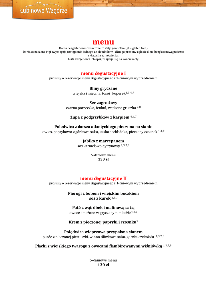 menu Dania bezglutenowe oznaczone zostały symbolem (gf – gluten free) Dania oznaczone (*gf )wymagają zastąpienia jednego ze składników i dlatego prosimy zgłosić dietę bezglutenową podczas składania zamówienia. Lista alergenów i ich opis, znajduje się na końcu karty. menu degustacyjne I prosimy o rezerwacje menu degustacyjnego z 1-dniowym wyprzedzeniem Bliny gryczane wiejska śmietana, łosoś, koperek1,3,4,7 Ser zagrodowy czarna porzeczka, fenkuł, wędzona gruszka 7,8 Zupa z podgrzybków z karpiem 4,6,7 Polędwica z dorsza atlantyckiego pieczona na sianie owies, paprykowo-ogórkowa salsa, suska sechlońska, pieczony czosnek 1,4,7 Jabłko z marcepanem sos karmelowo-cytrynowy 1,3,7,8 5-daniowe menu 130 zł menu degustacyjne II prosimy o rezerwacje menu degustacyjnego z 1-dniowym wyprzedzeniem Pierogi z bobem i wiejskim boczkiem sos z kurek 1,3,7 Paté z wątróbek i malinową salsą owoce smażone w gryczanym miodzie1,3,7 Krem z pieczonej papryki i czosnku7 Polędwica wieprzowa przypalona sianem purée z pieczonej pietruszki, winno-śliwkowa salsa, gorzka czekolada 1,3,7,8 Placki z wiejskiego twarogu z owocami flambirowanymi wiśniówką 1,3,7,8 5-daniowe menu 130 zł przystawki Pierogi z gęsiną na chrupko1,3,7 27 zł Grzanki z pastą z bakłażana i pomidorów oprószone parmezanem, podawane na kruchej sałacie 1,7,8,9 14 zł (gf*) Marynowany śledź w oleju lnianym z cytryną i ziołami1,3,4,7 20 zł (gf*) Carpaccio z wędzonej słoniny wiejski chleb, piórka czerwonej cebuli i kapka octu ziołowego1,3,7 10 zł (gf*) Talerz serów zagrodowych salsa: suszone pomidory, ogórek. miód1,3,7 25 zł Deska mięsiw z naszej wędzarni marynowane jabłka, chrzan, wiejski chleb1,3,7 32 zł (gf*) Panierowany camembert z żurawiną1,3,7 14 zł sałatki (gf) Łubinowe Wzgórze chrupiące sałaty, orzechy, gruszka, malinowy sos balsamiczny, sery zagrodowe, maliny7,8 23 zł Kuskus, ogórek i anchois cytryna, płatki chili1,4,7 26 zł zupy (gf*) (gf*) Barszcz Rosół z królika 1,3,7,9 12 zł czerwony na domowym zakwasie, z pielmieni 1,3,7,9 14 zł Zupa dnia 1,3,7,9 12 zł Flaki 1,7,9 14 zł makarony Czarny makaron pesto z bazylii, krewetki smażone w winie, parmezan 36 zł 1,2,3,7,8 Pasta Alfredo sos śmietanowy, oliwa truflowa, płatki parmezanu 1,3,7,8 26 zł Makaron z suszonymi pomidorami i szpinakiem nuta sera feta 1,3,7,8 25 zł (*gf) Pikantne spaghetti z sosem z pomidorów czosnek, zioła 18 zł 1,3,7,8 dania regionalne i jarskie (gf) Czenaki – baranina z warzywami zapiekane z ziołami w glinianym garnku i tak serwowane 7,9 Waga potrawy 750 g. Czas przygotowania około 1,5 godz. 39 zł Pielmieni – małe pierożki z mięsem1,3,7 25 zł Kartacze na skwarkach z boczku (czas oczekiwania 40 min.) 1,3,7 25 zł Siercioki – kluski z tartych ziemniaków wiejski ser, zrumienione masło 1,3,7 18 zł (*gf) Bliny ziemniaczane ekologiczny jogurt z nutą czosnku 1,3,7 16 zł 1. zawiera gluten 2. zawiera skorupiaki 3. zawiera jaja 4. zawiera rybę 5. zawiera orzeszki ziemne 6. zawiera soję 7. zawiera białko mleka i laktozę 8. zawiera orzechy 9. zawiera seler 10. zawiera gorczycę 11. zawiera nasiona sezamu 12. zawiera dwutlenek siarki 13. zawiera łubin 14. zawiera mięczaki dania mięsne (gf) Polędwica wołowa ziemniaki z pieca, chrupiące warzywa, kropla trufli 8 52 zł (gf*) Confit z koźlęciny kasza bulgur, marynowana cytryna, kapary, chrupiąca marchewka 45 zł (gf*) Polędwiczki 1,8 wieprzowe z kalafiorem na wędzonej słoninie 1,7 borowiki 36 zł (*gf) Kotlet schabowy w rozmiarze XXL frytki, surówka 1,3,6,7,8 35 zł dania rybne (gf*) Smażony jesiotr salsa z rzepy i jabłek, czarna soczewica, mus z buraka 1,3,4,6,7,8 46 zł (gf) Pstrąg pieczony gotowane warzywa z ziołami, ryż 1,3,4,7,8,9 29 zł (gf) Pstrąg z borowikami sos maślany, chrupiąca sałata (czas oczekiwania 40 min.)1,3,4,7,8 39 zł Karp w sosie śmietanowym ziołowa cebula, chrupiąca bułka 1,3,4,7,8 27 zł dania na zamówienie 24 h (gf*) Królik w sosie winno – śmietanowym smażone buraki, ziemniaki z pieca 1,,7,8 38 zł Piróg biłgorajski porcja dla 4 osób 1,3,7,8 80 zł desery do deserów polecamy kieliszek domowej nalewki Pieczone jabłko z marcepanem sos karmelowo – cytrynowy, wódka, rodzynki (czas oczekiwania 40 min.) 1,3,7,8 18 zł Crepes Suzette esencja z pomarańczy, likier cointreau 1,3,7,8 18 zł Owoce z pieca pod kruszonką gałka lodów waniliowych 1,3,7,8 18 zł Gruszka, sos pomarańczowo-limonkowy, lody orzechowe1,3,7,8 18 zł Lodowa fantazja 1,3,7,8 18 zł (gf) Placki bananowe z malinową konfiturą 3,8 12zł 1. zawiera gluten 2. zawiera skorupiaki 3. zawiera jaja 4. zawiera rybę 5. zawiera orzeszki ziemne 6. zawiera soję 7. zawiera białko mleka i laktozę 8. zawiera orzechy 9. zawiera seler 10. zawiera gorczycę 11. zawiera nasiona sezamu 12. zawiera dwutlenek siarki 13. zawiera łubin 14. zawiera mięczaki napoje (gf) Herbata liściasta, parzona w dzbanku: biały hibiskus; truskawki w czekoladzie; królewski early grey,; early grey orange; zielona; jaśminowa, herbata ziołowa,; miętowa; z ziela werbeny 9 zł (gf) Herbata zimowa z pomarańczą, goździkami, imbirem i goździkami 10 zł Herbata z cytryną, świeżym imbirem i miodem (dzbanek) 9 zł Espresso 5 zł Podwójne espresso 8 zł Kawa czarna 6 zł Cappuccino 7 zł Czekolada na gorąco 10 zł Kawa gotowana z kardamonem i miodem 9 zł Cytryna/sok malinowy 1 zł Świeżo wyciskany sok (2-4 składników) 10 zł Woda Perlage 0,7l 6 zł Woda niegazowana 0,3l 4 zł Coca-cola/Tonic 8 zł Cydr 8 zł napoje alkoholowe Kir (aperitif) 150 ml 10 zł Rozgrzewające bombardino likier jajeczny, bita śmietana 200 ml 14 zł Piwo Perła 0,5l 6 zł Piwo Nałęczowskie 0,33 l 6 zł Piwo grzane z miodem, korzeniami i pomarańczą 0,5 l 10 zł Wino grzane z korzeniami i pomarańczą 200 ml 10 zł Sangria pomarańcz, jabłko, lód 12 zł Mohito