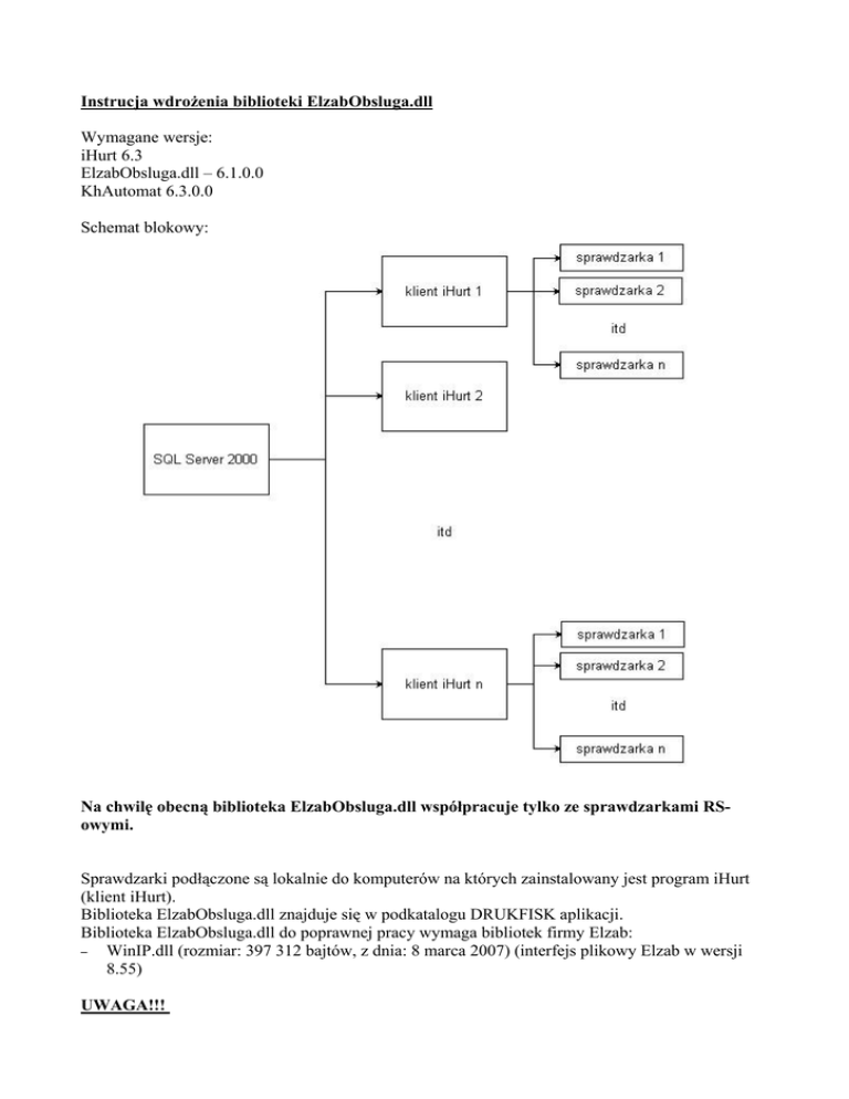 Instrucja wdrożenia biblioteki ElzabObsluga.dll Wymagane wersje: iHurt 6.3 ElzabObsluga.dll – 6.1.0.0 KhAutomat 6.3.0.0 Schemat blokowy: Na chwilę obecną biblioteka ElzabObsluga.dll współpracuje tylko ze sprawdzarkami RSowymi. Sprawdzarki podłączone są lokalnie do komputerów na których zainstalowany jest program iHurt (klient iHurt). Biblioteka ElzabObsluga.dll znajduje się w podkatalogu DRUKFISK aplikacji. Biblioteka ElzabObsluga.dll do poprawnej pracy wymaga bibliotek firmy Elzab: – WinIP.dll (rozmiar: 397 312 bajtów, z dnia: 8 marca 2007) (interfejs plikowy Elzab w wersji 8.55) UWAGA!!! 1. Biblioteka ta nie jest wersjonowana i prawdopodobnie trzeba ją podgrywać ręcznie. 2. Nie przetestowano poprawności działania tej wersji biblioteki WinIP.dll z drukarką etykiet Elzab Eta. Wszelkie pytania na ten temat – Krzysztof Gwiazda. Biblioteki WinIP.dll musi znajdować się w tym samym katalogu co biblioteka ElzabObsluga.dll – czyli w podkatalogu DRUKFISK. Konfiguracja. Na każdym stanowisku, gdzie są podłączone sprawdzarki musi być utworzony plik konfiguracyjny o nazwie ElzabObsluga.ini (w tym samym katalogu co biblioteka ElzabObsluga.dll) Przykładowy plik ElzabObsluga.ini dla stanowiska do którego podłączone są dwie sprawdzarki RS: [SprawdzarkaRS 1] NumerUrzadzenia = 1 NumerLaczaSzeregowego = 1 SzybkoscTransmisji = 9600 RodzajMultipleksera = 0 NumerKanaluMultipleksera = 1 Timeout = 3 [SprawdzarkaRS 2] NumerUrzadzenia = 2 NumerLaczaSzeregowego = 2 SzybkoscTransmisji = 19200 RodzajMultipleksera = 0 NumerKanaluMultipleksera = 1 Timeout = 4 Nazwy sekcji: SprawdzarkaRS 1 SprawdzarkaRS 2 muszą być unikalne (nie mogą wystąpić dwie sekcje o tej samej nazwie) z tym, że muszą rozpoczynać się od tekstu SprawdzarkaRS Pozostałe sekcje wyjaśnione zgodnie z instrukcją firmy Elzab (ogólna nazwa “kasa” tutaj czytaj “sprawdzarka” :)) Uwaga! Wspomniane łącze modemowe nie jest obsługiwane. • • • NumerUrzadzenia numer kasy w systemie kas w zakresie 1-99. Każda kasa powinna mieć jednoznacznie nadany numer, który będzie identyfikował ją podczas zapisów i odczytów przez programy narzędziowe. Poza jednoznacznością nie ma ograniczeń na numerację kas, tzn. nie musi być ciągła czy też zaczynać się od 1. NumerLaczaSzeregowego numer łącza szeregowego komputera w zakresie 1-4. Oznacza do którego łącza jest przyłączona kasa, multiplekser lub modem. SzybkoscTransmisji • • • 9600|19200|28800 - szybkość transmisji w bodach z jaką pracuje dana kasa. Należy w tym miejscu podać tylko jeden z parametrów. Wyższa szybkość oznacza mniej czasu potrzebnego na pracę programu narzędziowego, ale może w pewnych warunkach sprawiać kłopoty np. przy długich lub niewłaściwych kablach połączeniowych. Nie jest możliwe użycie szybkości 28800 poprzez łącze modemowe. RodzajMultipleksera oznacza, że do tego łącza szeregowego jest dołączony multiplekser typu określonego przez parametr RodzajMultipleksera: RodzajMultipleksera = 0 kasa podłączona bezpośrednio do portu szeregowego, RodzajMultipleksera = 1 multiplekser 4xRS232 lub 4xRS232/RJ, RodzajMultipleksera = 2 łącze modemowe. RodzajMultipleksera = 3 Przełącznik Multiplekserów 2MX RodzajMultipleksera = 4 multiplekser 8xRS232/RJ NumerKanaluMultipleksera numer kanału multipleksera. Dla kasy podłączonej bezpośrednio należy zawsze ustawiać NumerKanaluMultipleksera = 1. Dla multipleksera 4xRS232 (lub 4xRS232/RJ) parametr NumerKanaluMultipleksera jest liczbą z zakresu 1-4. Dla łącza modemowego NumerKanaluMultipleksera jest liczbą z zakresu 1-8 (dla modemów kasowych opartych o modem Prolink potrzebna jest przeróbka sprzętowa). Dla przełącznika multiplekserów 2MX NumerKanaluMultipleksera jest liczbą z zakresu 1-8 Dla multipleksera 8xRS232/RJ NumerKanaluMultipleksera jest liczbą z zakresu 1-8. Należy dodać, że poszczególne kasy podłączone przez multiplekser lub łącza modemowego mogą pracować z różnymi szybkościami transmisji. Timeout wielkość timeouta w sekundach dla danej kasy (każda kasa w systemie może pracować z innym timeoutem). Zalecany minimalny timeout wynosi 3s. Współpraca i-Hurtu ze sprawdzarkami wymaga określenia grupy cen sprzedaży jakie mają być wysyłane na sprawdzarkę (czwarta zakładka okna Aplikacja->Konfiguracja). Parametr ten musi być określony oddzielnie dla każdego stanowiska. Sposoby uruchomienia eksportu na sprawdzarkę: 1. Słowniki -> Towary -> Narzędzia -> Eksport towarów do sprawdzarek cen Opcja ta eksportuje całą bazę towarową. 2. Eksport z użyciem aplikacji KhAutomat – eksporty przyrostowe (towary zmienione od ostatniego eksportu) – opis poniżej UWAGA!!! Eksport towarów na sprawdzarki technicznie składa się z dwóch etapów: 1. Pobranie danych z bazy 2. Wysyłanie danych do sprawdzarek Pierwsze pobranie danych może trwać dość długi czas (nawet w granicach pół godziny w zależności od ilości towarów i obciążenia serwera; przykładowo: baza Mrowka_104 na serwerze ibm-szkolenia - 89 tysięcy towarów – pobranie danych od 2:50 do 28 minut w zależności od obciążenia serwera) z uwagi na to, że aplikacja musi przydzielić towarom identyfikatory potrzebne do późniejszego szybkiego przeprowadzania eksportów przyrostowych. Operacja nadawania identyfikatorów blokuje dostęp do tabeli towarów w związku z tym, przez ten moment nie będzie możliwe prowadzenie sprzedaży ani wykonywanie operacji na towarach i cennikach. Etap drugi – czyli wysyłanie danych do sprawdzarek również może trwać długo, w zależności od ilości towarów i ilości sprawdzarek na stanowisku – ale operacja ta nie powoduje blokowania tabeli towarów – inni użytkownicy mogą swobodnie pracować. Automatyczny eksport z wykorzystaniem apikacji KhAutomat Aby wykonywać automatyczne eksporty z udziałem KhAutomatu należy odpowiednio skofigurować tę aplikację na każdym stanowisku, do którego