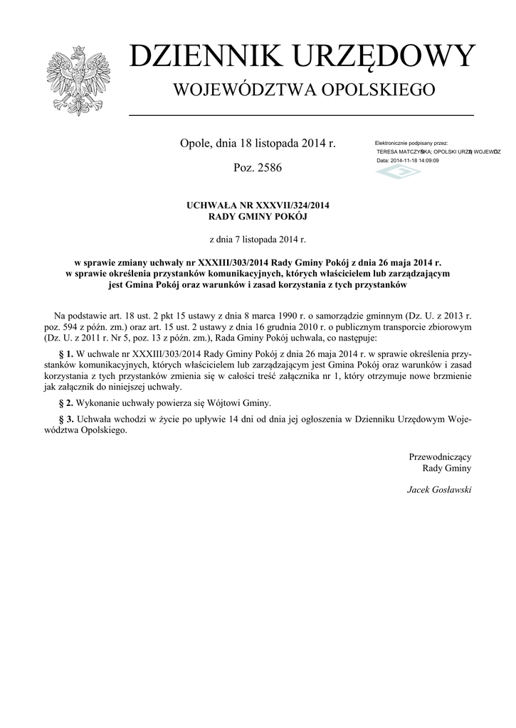 DZIENNIK URZĘDOWY WOJEWÓDZTWA OPOLSKIEGO Opole, dnia 18 listopada 2014 r. Elektronicznie podpisany przez: TERESA MATCZYŃSKA; OPOLSKI URZĄD WOJEWÓDZKI Poz. 2586 Data: 2014-11-18 14:09:09 UCHWAŁA NR XXXVII/324/2014 RADY GMINY POKÓJ z dnia 7 listopada 2014 r. w sprawie zmiany uchwały nr XXXIII/303/2014 Rady Gminy Pokój z dnia 26 maja 2014 r. w sprawie określenia przystanków komunikacyjnych, których właścicielem lub zarządzającym jest Gmina Pokój oraz warunków i zasad korzystania z tych przystanków Na podstawie art. 18 ust. 2 pkt 15 ustawy z dnia 8 marca 1990 r. o samorządzie gminnym (Dz. U. z 2013 r. poz. 594 z późn. zm.) oraz art. 15 ust. 2 ustawy z dnia 16 grudnia 2010 r. o publicznym transporcie zbiorowym (Dz. U. z 2011 r. Nr 5, poz. 13 z późn. zm.), Rada Gminy Pokój uchwala, co następuje: § 1. W uchwale nr XXXIII/303/2014 Rady Gminy Pokój z dnia 26 maja 2014 r. w sprawie określenia przystanków komunikacyjnych, których właścicielem lub zarządzającym jest Gmina Pokój oraz warunków i zasad korzystania z tych przystanków zmienia się w całości treść załącznika nr 1, który otrzymuje nowe brzmienie jak załącznik do niniejszej uchwały. § 2. Wykonanie uchwały powierza się Wójtowi Gminy. § 3. Uchwała wchodzi w życie po upływie 14 dni od dnia jej ogłoszenia w Dzienniku Urzędowym Województwa Opolskiego. Przewodniczący Rady Gminy Jacek Gosławski Dziennik Urzędowy Województwa Opolskiego –2– Poz. 2586 Załącznik do uchwały Nr XXXVII/324/2014 Rady Gminy Pokój z dnia 7 listopada 2014 r. Przystanki komunikacyjne, których właścicielem lub zarządzającym jest Gmina Pokój, udostępnione dla operatorów publicznego transportu zbiorowego i przewoźników drogowych Lp. Nr drogi Miejscowość Ulica 1 1352 O -powiatowa Krzywa Góra bez nazwy w centrum wsi 2 1352 O -powiatowa Krzywa Góra bez nazwy kierunek Okoły 3 101623 O - gminna Pokój 1 Maja przy Publicznym Gimnazjum i Szkole Podstawowej 4 101621 O - gminna Pokój Sienkiewicza przy Publicznym Przedszkolu 5 okolice drogi wojewódzkiej Pokój 1 Maja zatoczka autobusowa przy rondzie 6 101623 O - gminna Pokój 1 Maja przy Banku Spółdzielczym 7 454 - wojewódzka Pokój Opolska przy wjeździe w ul. Winna Góra 8 454 - wojewódzka Pokój Namysłowska przy stacji PKP 9 454 - wojewódzka Zieleniec bez nazwy w centrum wsi Lokalizacja 10 454 - wojewódzka Zieleniec bez nazwy przy byłej Szkole Podstawowej 11 1016120 O - gminna Krogulna Średnia przy sklepie 12 454 - wojewódzka Krogulna Namysłowska przy Gospodarstwie Rybackim 13 454 - wojewódzka Krogulna Namysłowska przy Gospodarstwie Rybackim 14 454 - wojewódzka Krogulna Namysłowska przy wyjeździe w kierunku Namysłowa 15 101613 O - gminna Siedlice bez nazwy przy wjeździe do Siedlic 16 1348 O - powiatowa Jagienna bez nazwy w centrum wsi 17 1132 O - powiatowa Jagienna bez nazwy przy wyjeździe w kierunku Domaradza 18 1132 O - powiatowa Kozuby bez nazwy przy wyjeździe w kierunku Domaradza 19 1348 O - powiatowa Kozuby bez nazwy przy wyjeździe w kierunku Paryża 20 1348 O - powiatowa Paryż bez nazwy przy wjeździe od strony Kozub 21 1348 O - powiatowa Paryż bez nazwy przy wyjeździe w kierunku Domaradzkiej Kuźni 22 101619 O - gminna Świercowskie bez nazwy w centrum wsi 23 1348 O - powiatowa Domaradz bez nazwy w centrum wsi 24 1348 O - powiatowa Domaradz bez nazwy przy Szkole Podstawowej 25 1349 O - powiatowa Fałkowice bez nazwy przy remizie OSP 26 1349 O - powiatowa Fałkowice bez nazwy przy wyjeździe w kierunku Lubnowa 27 1349 O - powiatowa Lubnów Szkolna w centrum wsi 28 1348 O - powiatowa Lubnów Opolska przy wyjeździe w kierunku Kopaliny 29 1348 O - powiatowa Kopalina Opolska w centrum wsi 30 1325 O - powiatowa Zawiść Odrodzenia Polski przy świetlicy wiejskiej 31 1325 O - powiatowa Zawiść Odrodzenia Polski za rzeką 32 1353 O - powiatowa Dąbrówka Dolna Święcińska przy wyjeździe w kierunku Święcin 33 1353 O - powiatowa Dąbrówka Dolna Szkolna przy OHP 34 1348 O - powiatowa Domaradzka Kuźnia Opolska przy wjeździe od strony Lubnowa 35 1348 O - powiatowa Domaradzka Kuźnia Opolska przy sklepie 36 454 - wojewódzka Ładza Powstańców przy skrzyżowaniu w kierunku Popielowa 37 1150 O - powiatowa Ładza Wolności w centrum wsi 38 1150 O - powiatowa Ładza Wolności przy leśniczówce 39 101619 O - gminna Świercowskie bez nazwy przy wjeździe do posesji P. Zązel 40 1349 O - powiatowa Fałkowice bez nazwy przy dwóch ostatnich posesjach, przy wyjeździe z Fałkowic Dziennik Urzędowy Województwa Opolskiego –3– Poz. 2586 41 1348 O - powiatowa Domaradzka Kuźnia Opolska przy wyjeździe w kierunku Paryża 42 1348 O - powiatowa Kopalina Opolska przy wjeździe od strony Zawiści, wjazd do posesji P. Lisonia 43 1348 O - powiatowa Kopalina Opolska przy wjeździe na ul. Wiejską 44 101605 O - gminna Paryż bez nazwy przy wjeździe od strony Domaradza