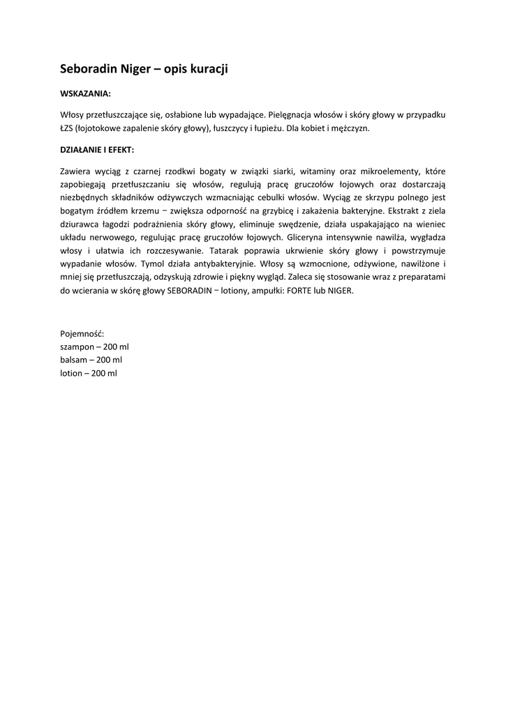 Seboradin Niger – opis kuracji WSKAZANIA: Włosy przetłuszczające się, osłabione lub wypadające. Pielęgnacja włosów i skóry głowy w przypadku ŁZS (łojotokowe zapalenie skóry głowy), łuszczycy i łupieżu. Dla kobiet i mężczyzn. DZIAŁANIE I EFEKT: Zawiera wyciąg z czarnej rzodkwi bogaty w związki siarki, witaminy oraz mikroelementy, które zapobiegają przetłuszczaniu się włosów, regulują pracę gruczołów łojowych oraz dostarczają niezbędnych składników odżywczych wzmacniając cebulki włosów. Wyciąg ze skrzypu polnego jest bogatym źródłem krzemu – zwiększa odporność na grzybicę i zakażenia bakteryjne. Ekstrakt z ziela dziurawca łagodzi podrażnienia skóry głowy, eliminuje swędzenie, działa uspakajająco na wieniec układu nerwowego, regulując pracę gruczołów łojowych. Gliceryna intensywnie nawilża, wygładza włosy i ułatwia ich rozczesywanie. Tatarak poprawia ukrwienie skóry głowy i powstrzymuje wypadanie włosów. Tymol działa antybakteryjnie. Włosy są wzmocnione, odżywione, nawilżone i mniej się przetłuszczają, odzyskują zdrowie i piękny wygląd. Zaleca się stosowanie wraz z preparatami do wcierania w skórę głowy SEBORADIN – lotiony, ampułki: FORTE lub NIGER. Pojemność: szampon – 200 ml balsam – 200 ml lotion – 200 ml