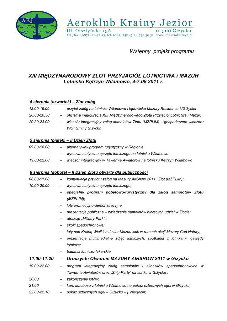 Aeroklub Krainy Jezior Ul. Olsztyńska 15A 11-500 Giżycko tel./fax. (087) 428 42 93, tel. (089) 752 45 21, 752 30 31 www.lotniskoketrzyn.pl Wstępny projekt programu XIII MIĘDZYNARODOWY ZLOT PRZYJACIÓŁ LOTNICTWA i MAZUR Lotnisko Kętrzyn Wilamowo, 4-7.08.2011 r. 4 sierpnia (czwartek) – Zlot załóg 13.00-19.00 – przylot załóg na lotnisko Wilamowo i lądowisko Mazury Residence k/Giżycka 20.00-20.30 – oficjalna inauguracja XIII Międzynarodowego Zlotu Przyjaciół Lotnictwa i Mazur. 20.30-23.00 – wieczór integracyjny załóg samolotów Zlotu (MZPLiM) – gospodarzem wieczoru Wójt Gminy Giżycko 5 sierpnia (piątek) – II Dzień Zlotu 09.00-18.00 19.00-22.00 – alternatywny program turystyczny w Regionie – wystawa statyczna sprzętu lotniczego na lotnisku Wilamowo – wieczór integracyjny w Tawernie Awiatorów na lotnisku Kętrzyn Wilamowo 6 sierpnia (sobota) – II Dzień Zlotu otwarty dla publiczności 08.00-11.00 – kontynuacja przylotu załóg na Mazury AirShow 2011 i Zlot (MZPLiM); 10.00-20.00 – wystawa statyczna sprzętu lotniczego; – specjalny program pobytowo-turystyczny dla załóg samolotów Zlotu (MZPLiM); – loty promocyjno-demonstracyjne; – prezentacja publiczna – zwiedzanie samolotów biorących udział w Zlocie; – atrakcje „Military Park” ; – skoki spadochronowe; – loty nad Krainą Wielkich Jezior Mazurskich w ramach akcji Mazury Cud Natury; – prezentacje multimedialne zdjęć lotniczych, spotkania z lotnikami, gawędy lotnicze; – badania lotniczo-lekarskie; 11.00-11.20 – Uroczyste Otwarcie MAZURY AIRSHOW 2011 w Giżycku 19.00-22.00 – program integracyjny załóg samolotów i skoczków spadochronowych w Tawernie Awiatorów oraz „Ship-Party” na statku w Giżycku ; 20.00 – zakończenie lotów; 21.00 – kurs autobusu z lotniska Wilamowo na pokaz sztucznych ogni w Giżycku; 22.00-22.10 – pokaz sztucznych ogni – Giżycko – j. Niegocin; 7 sierpnia (niedziela) – III Dzień Zlotu otwarty dla publiczności 09.00-18.00 – ciąg dalszy Zlotu, loty widokowe, prezentacja statyczna sprzętu; – kontynuacja specjalnego programu pobytowo-turystycznego dla załóg samolotów Zlotu (MZPLiM); 14.30-15.00 – atrakcje „Military Park”; – skoki spadochronowe; – badania lotniczo-lekarskie ; – Uroczyste zakończenie Mazury AirShow 2011 oraz MZPLiM w Giżycku 17.00-18.30 – odloty samolotów uczestniczących w Zlocie (MZPLiM) i Mazury AirShow – pożegnalna parada nad lotniskiem i Mazurami; 20.00 – zakończenie lotów promocyjnych ; Stanisław Tołwiński Prezes AKJ Mazury,08 .07 .2011 r.