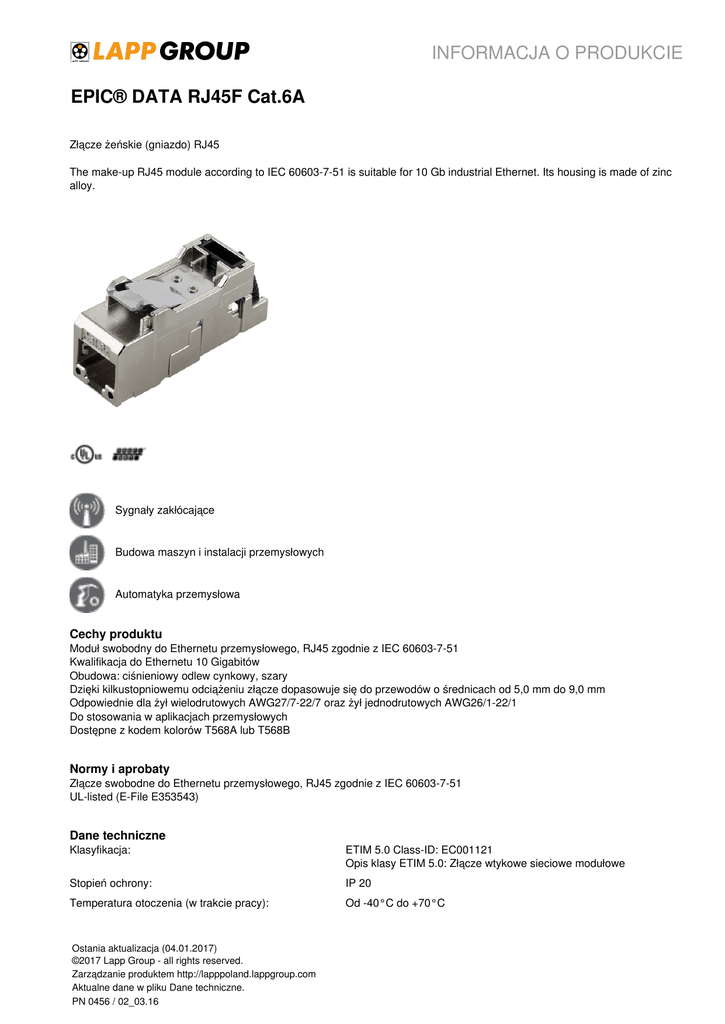 INFORMACJA O PRODUKCIE EPIC® DATA RJ45F Cat.6A Złącze żeńskie (gniazdo) RJ45 The make-up RJ45 module according to IEC 60603-7-51 is suitable for 10 Gb industrial Ethernet. Its housing is made of zinc alloy. Sygnały zakłócające Budowa maszyn i instalacji przemysłowych Automatyka przemysłowa Cechy produktu Moduł swobodny do Ethernetu przemysłowego, RJ45 zgodnie z IEC 60603-7-51 Kwalifikacja do Ethernetu 10 Gigabitów Obudowa: ciśnieniowy odlew cynkowy, szary Dzięki kilkustopniowemu odciążeniu złącze dopasowuje się do przewodów o średnicach od 5,0 mm do 9,0 mm Odpowiednie dla żył wielodrutowych AWG27/7-22/7 oraz żył jednodrutowych AWG26/1-22/1 Do stosowania w aplikacjach przemysłowych Dostępne z kodem kolorów T568A lub T568B Normy i aprobaty Złącze swobodne do Ethernetu przemysłowego, RJ45 zgodnie z IEC 60603-7-51 UL-listed (E-File E353543) Dane techniczne Klasyfikacja: ETIM 5.0 Class-ID: EC001121 Opis klasy ETIM 5.0: Złącze wtykowe sieciowe modułowe Stopień ochrony: IP 20 Temperatura otoczenia (w trakcie pracy): Od -40°C do +70°C Ostania aktualizacja (04.01.2017) ©2017 Lapp Group - all rights reserved. Zarządzanie produktem http://lapppoland.lappgroup.com Aktualne dane w pliku Dane techniczne. PN 0456 / 02_03.16 INFORMACJA O PRODUKCIE EPIC® DATA RJ45F Cat.6A Wskazówka Fotografie nie mogą być używane do wymiarowania oraz nie stanowią szczegółowego odwzorowania przedstawionych produktów. * Podane ceny to ceny netto bez podatku VAT i dodatkowych opłat. Sprzedaż klientom biznesowym. Ostania aktualizacja (04.01.2017) ©2017 Lapp Group - all rights reserved. Zarządzanie produktem http://lapppoland.lappgroup.com Aktualne dane w pliku Dane techniczne. PN 0456 / 02_03.16 Powered by TCPDF (www.tcpdf.org) Moduł żeński RJ45 zgodny z T568B EPIC® DATA RJ45F Cat.6A Moduł żeński RJ45 zgodny z T568A Ostania aktualizacja (04.01.2017) ©2017 Lapp Group - all rights reserved. Zarządzanie produktem http://lapppoland.lappgroup.com Aktualne dane w pliku Dane techniczne. PN 0456 / 02_03.16 INFORMACJA O PRODUKCIE Powered by TCPDF (www.tcpdf.org) ED-IE-AX-RJ45F-6A-B-FC 21700612 ED-IE-AX-RJ45F-6A-A-FC 21700611 Oznaczenie wyrobu Numer katalogowy