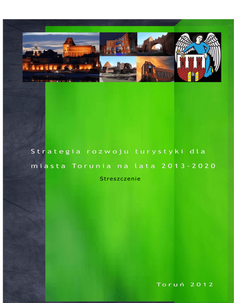 S t res zc zeni e Strategia rozwoju turystyki dla miasta Torunia na lata 2013-2020 1. CEL I ZAKRES STRATEGII Strategia rozwoju turystyki dla miasta Torunia dotyczy obszarów oraz zagadnień, które są przedmiotem interwencji publicznej i formułuje, przede wszystkim dla podmiotów publicznych, zadania, których realizacja zależy od aktywności wszystkich jednostek zaangażowanych w rozwój turystyki w mieście. Dokument określa misję, wizję, priorytety oraz cele rozwoju turystyki w Toruniu, dzięki czemu zapewniona zostaje spójność pomiędzy działaniami lokalnego samorządu oraz jednostek powiązanych z turystyką w mieście. Takie podejście umożliwi koordynację oraz wzajemne wspieranie i uzupełnianie działań podejmowanych przez powyższe podmioty. Strategia jest podstawowym dokumentem w procesie planowania i prognozowania kierunków rozwoju turystyki w Toruniu. Ponadto dla podmiotów zewnętrznych stanowi niejako kompendium wiedzy na temat obszaru, wskazując jego mocne strony i szanse, lecz także identyfikując problemy i zagrożenia. Dokument dostarcza przesłanek do formułowania decyzji, wyznaczania konkretnych zadań oraz zabezpieczania lub poszukiwania środków na realizację tych zadań. Poprzez jasne wytyczenie celów i priorytetów w kierunkach rozwoju, Strategia ułatwia również pozyskania źródeł finansowania konkretnych przedsięwzięć. Rezultatem wdrażania Strategii ma być podniesienie atrakcyjności turystycznej miasta Torunia. Przekładać się to będzie na wzrost liczby turystów odwiedzających miasto oraz wydłużenie ich pobytu w Toruniu. Pozytywne efekty turystyki będą miały wpływ na takie dziedziny jak zatrudnienie, rozwój regionalny, edukacja, środowisko, transport czy kultura. Jednocześnie rozwój turystyki zależeć będzie od wielu działań w innych gałęziach gospodarki. Wystąpi więc tutaj sprzężenie zwrotne. Rozwój funkcji turystycznej miasta szczególnie istotny będzie więc z punktu widzenia mieszkańców i lokalnych przedsiębiorców, którzy będą głównymi beneficjentami tego procesu. Zakres strategii obejmuje lata 2013-2020, przy czym jej bezpośrednie skutki odczuwalne będą również w latach kolejnych. Przy zakreślaniu horyzontu czasowego wdrażania Strategii brano pod uwagę przede wszystkim perspektywę czasową wdrażania innych programów rozwoju, zwłaszcza zaś Strategii rozwoju miasta Torunia do 2020 r. oraz przyszłego okresu programowania funduszy europejskich. Strategia rozwoju turystyki dla miasta Torunia na lata 2013-2020 2. MISJA I WIZJA TURYSTYCZNA TORUNIA Misja – deklaracje i dążenia Torunia w zakresie turystyki Podejmowanie zintegrowanych działań w procesie rozwoju turystyki i promocji produktów turystycznych będących siłą napędową rozwoju społeczno-gospodarczego miasta Torunia. Stała i aktywna współpraca lokalnych władz z instytucjami i organizacjami turystycznymi w zakresie wzbogacenia oferty turystycznej sprawiająca, że miasto Toruń będzie chętnie odwiedzanym miejscem przez turystów krajowych i zagranicznych. Wizja – projekcja stanu docelowego Miasto Toruń – nowoczesne europejskie centrum turystyki i kultury 3. PRIORYTETY I CELE ROZWOJU TURYSTYKI W TORUNIU Strategia rozwoju turystyki dla miasta Torunia na lata 2013-2020 pozwolić ma, w oparciu o potencjał miasta w dziedzinie turystyki, na skuteczne osiąganie określonych celów, dzięki racjonalnemu wykorzystywaniu i umacnianiu tego potencjału. Prezentowana koncepcja dotyczy zarówno procesów rozwoju, jak i budowy spójnej, konkurencyjnej oferty turystycznej dostosowanej do trendów rynkowych i obecnych wiodących segmentów turystów odwiedzających Toruń oraz ma za zadania poszerzenie oferty, tak aby była atrakcyjna dla szerszej grupy odbiorców. Planowanym rezultatem wdrożenia działań jest nie tylko podniesienie liczby turystów odwiedzających Toruń, lecz przede wszystkim wydłużenie ich pobytu w mieście poprzez zaproponowanie im konkretnych atrakcji i produktów. Zagadnienie dalszego rozwoju turystyki w Toruniu potraktowane zostało wielopłaszczyznowo. Obok umacniania tradycyjnie kojarzonych z miastem produktów turystycznych i atrakcji Torunia skoncentrowano się również na obszarach do tej pory pomijanych, a odznaczających się znacznym potencjałem rozwojowym oraz tworzeniu nowych unikatowych możliwości poznawania i doświadczania miasta. Podejście to pozwoliło na zidentyfikowanie pięciu obszarów priorytetowych kompleksowo ujmujących możliwości i kierunki rozwoju turystyki w Toruniu. W ramach każdego z priorytetów zdefiniowane zostały cele oraz działania mające w założeniu prowadzić do osiągnięcia wyznaczonych celów. Całościowe podejście do zagadnienia sprawiło, iż cele i działania w ramach poszczególnych priorytetów niejednokrotnie zazębiają się tworząc rozwiązania systemowe. Przy doborze proponowanych działań kierowano się przede wszystkim bieżącymi potrzebami i brakami w usługach oraz infrastrukturze turystycznej i okołoturystycznej miasta, potrzebą dalszego umacniania pozytywnego wizerunku Torunia, lecz także obecnymi możliwościami miasta w zakresie finansowania nowych przedsięwzięć. Strategia rozwoju turystyki dla miasta Torunia na lata 2013-2020 PRIORYTET I – TORUŃ PRZYJAZNY Cel I.1 – Podniesienie poziomu dostępności usług okołoturystycznych w Toruniu Wprowadzenie biletów weekendowych na komunikację miejską tzw. turystycznej karty miejskiej Wprowadzenie wspólnego biletu do obiektów zabytkowych, muzeów i galerii Cel I.2 – Ułatwienie turystom dostępu do informacji poprzez wykorzystanie narzędzi interaktywnych Umożliwienie turystom mobilnego dostępu do informacji Zbudowanie sieci publicznych punktów bezpłatnego dostępu do Internetu tzw. hot spotów Cel I.3 – Wzmocnienie wizerunku Torunia jako miasta przyjaznego rodzinom Wprowadzenie systemu zniżek dla rodzin Cel I.4 – Wzmocnienie rozpoznawalności miasta Toru
