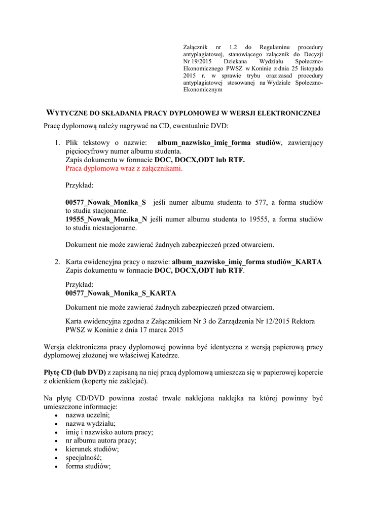 Załącznik nr 1.2 do Regulaminu procedury antyplagiatowej, stanowiącego załącznik do Decyzji Nr 19/2015 Dziekana Wydziału SpołecznoEkonomicznego PWSZ w Koninie z dnia 25 listopada 2015 r. w sprawie trybu oraz zasad procedury antyplagiatowej stosowanej na Wydziale SpołecznoEkonomicznym WYTYCZNE DO SKŁADANIA PRACY DYPLOMOWEJ W WERSJI ELEKTRONICZNEJ Pracę dyplomową należy nagrywać na CD, ewentualnie DVD: 1. Plik tekstowy o nazwie: album_nazwisko_imię_forma studiów, zawierający pięciocyfrowy numer albumu studenta. Zapis dokumentu w formacie DOC, DOCX,ODT lub RTF. Praca dyplomowa wraz z załącznikami. Przykład: 00577_Nowak_Monika_S jeśli numer albumu studenta to 577, a forma studiów to studia stacjonarne. 19555_Nowak_Monika_N jeśli numer albumu studenta to 19555, a forma studiów to studia niestacjonarne. Dokument nie może zawierać żadnych zabezpieczeń przed otwarciem. 2. Karta ewidencyjna pracy o nazwie: album_nazwisko_imię_forma studiów_KARTA Zapis dokumentu w formacie DOC, DOCX,ODT lub RTF. Przykład: 00577_Nowak_Monika_S_KARTA Dokument nie może zawierać żadnych zabezpieczeń przed otwarciem. Karta ewidencyjna zgodna z Załącznikiem Nr 3 do Zarządzenia Nr 12/2015 Rektora PWSZ w Koninie z dnia 17 marca 2015 Wersja elektroniczna pracy dyplomowej powinna być identyczna z wersją papierową pracy dyplomowej złożonej we właściwej Katedrze. Płytę CD (lub DVD) z zapisaną na niej pracą dyplomową umieszcza się w papierowej kopercie z okienkiem (koperty nie zaklejać). Na płytę CD/DVD powinna zostać trwale naklejona naklejka na której powinny być umieszczone informacje:  nazwa uczelni;  nazwa wydziału;  imię i nazwisko autora pracy;  nr albumu autora pracy;  kierunek studiów;  specjalność;  forma studiów;    tytuł pracy; praca dyplomowa: licencjacka/inżynierska/magisterska; nazwisko i imię oraz stopień naukowy promotora.