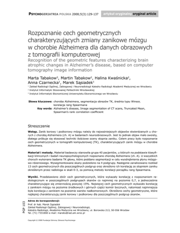 PSYCHOGERIATRIA POLSKA 2008;5(3):129-137 artykuł oryginalny oryginal article Rozpoznanie cech geometrycznych charakteryzujących zmiany zanikowe mózgu w chorobie Alzheimera dla danych obrazowych z tomografii komputerowej Recognition of the geometric features characterizing brain atrophic changes in Alzheimer’s disease, based on computer tomography image information Marta Tabakow3, Martin Tabakow2, Halina Kwaśnicka2, Anna Czarnecka1, Marek Sąsiadek1 1 Zakład Radiologii Ogólnej, Zabiegowej i Neuroradiologii Katedry Radiologii Akademii Medycznej we Wrocławiu 2 Instytut Informatyki Stosowanej Politechniki Wrocławskiej 3 Instytut Informatyki Ekonomicznej Uniwersytetu Ekonomicznego we Wrocławiu Słowa kluczowe: choroba Alzheimera, segmentacja obrazów TK, średnia typu Winsor, korelacja rang Spearmana Key words: Alzheimer’s disease, Image segmentation of CT scans, Truncated Mean, Spearman’s rank correlation coefficient Streszczenie Wstęp. Zanik korowy i podkorowy mózgu należy do najważniejszych objawów stwierdzanych u chorych z chorobą Alzheimera (ch. A) w badaniach neuroobrazowych. Jest to jednak objaw mało swoisty, dlatego próbuje się stosować techniki ilościowe oceny stopnia zaniku. Celem pracy było rozpoznanie cech geometrycznych w tomografii komputerowej (TK), charakteryzujących zanik mózgu w chorobie Alzheimera. Materiał i metody. Materiał badawczy stanowiła grupa 40 pacjentów, u których na podstawie klasyfikacji klinicznych i badań neuropsychologicznych rozpoznano chorobę Alzheimera (ch. A). U wszystkich chorych wykonano badanie TK głowy, które poddano segmentacji w celu wyodrębnienia płynu mózgowo-rdzeniowego. Wysegmentowane skany podzielono na 4 podgrupy. Następnie zanalizowano rozkład 13 cech geometrycznych dla poszczególnych podgrup oraz określono ich korelację ze stopniem zaniku określonym przez radiologa w skali 0-3, za pomocą metody korelacji porządku rang Spearmana. PGP 103 Wyniki. Przedstawiono zbiór cech geometrycznych, które wykazały korelację z rozpoznaniem radiologicznym w poszczególnych podgrupach skanów co najmniej na poziomie 0,7, a jednocześnie charakteryzujące się zmiennością powyżej 15%. Najwięcej cech geometrycznych wykazało korelację z zanikiem mózgu na poziomie środkowych i górnych części komór bocznych, natomiast najmniejsza była korelacja z zanikiem na poziomie warstw nadkomorowych. Określono cechy geometryczne, które najlepiej charakteryzują zanik korowy i podkorowy dla poszczególnych podgrup skanów. Adres do korespondencji: Prof. dr hab. Marek Sąsiadek Zakład Radiologii Ogólnej, Zabiegowej i Neuroradiologii, Katedra Radiologii, Akademia Medyczna we Wrocławiu; ul. Borowska 213, 50-556 Wrocław Tel. (71) 7331660 e-mail: [email protected] Copyright © 2008 Fundacja Ochrony Zdrowia Psychicznego 130 Marta Tabakow i wsp.: Cechy geometryczne zmian w AD Wnioski. Określenie cech geometrycznych zaniku mózgu w badaniu TK może służyć jako metoda wspomagania decyzji radiologicznych, zwłaszcza w odniesieniu do skanów na poziomie środkowych i górnych części komór bocznych. Summary Background. Cortical and subcortical atrophy is one of the most important signs in the imaging studies of patients with Alzheimer’s disease. However it is not specific finding, therefore quantitative methods of the severity of the atrophy have been developed. The aim of the study was to recognize the geometric features which characterize cerebral atrophy in computed tomography (CT) of patients with Alzheimer’s disease. Material and methods. The material consisted of 40 patients, in whom Alzheimer’s disease (AD) was diagnosed based on clinical classifications and neuropsychological studies. All patients underwent CT studies, which were postprocessed with segmentation algorithm to select cerebrospinal fluid. The segmented scans were divided into 4 subgroups. The set of 13 geometric features for each subgroup has been analyzed and their correlation with the degree of atrophy defined by a radiologist in 0-3 scale has been assessed applying Spearman’s rank correlation coefficient. Results. The set of geometric features presented was correlated with radiological diagnosis in particular subgroups of the scans at least at the 0,7 level and were characterized by variability greater than 15%. The greatest number of geometric features were correlated with cerebral atrophy at the levels of middle and upper part of lateral ventricles, while the correlation with the atrophy on the supraventricular scans was the lowest. The geometric features which offer the best characterization of particular subgroups of scans have been defined. Conclusions. Recognition of the geometric features of cerebral atrophy in CT study may serve as the decision support system, especially with the scans covering the middle and upper parts of the lateral ventricles. Wstęp Badania neuroobrazowe odgrywają wzrastającą rolę w chorobie Alzheimera (ch. A.), jednak wciąż charakteryzują się niewystarczającą specyficznością w rozpoznawaniu, różnicowaniu i monitorowaniu ch. A., w związku z tym prowadzone są liczne badania nad zastosowaniem nowych technik neuroobrazowych, które poprawiłyby skuteczność diagnostyczną w ch. A. Zanik korowy i podkorowy mózgu należy do najważniejszych objawów stwierdzanych u chorych z ch. A, w badaniach neuroobrazowych: tomografii komputerowej (TK) i rezonansu magnetycznego (MR) [1, 2]. Jest to jednak objaw mało swoisty, dlatego próbuje się stosować techniki ilościowe oceny stopnia zaniku, zwłaszcza w okolicach typowych zmian w ch. A., jak przyśrodkowe części płatów skroniowych [3]. Metody te jednak są zwykle czasochłonne i trudne do zastosowania w codziennej praktyce. Celem naszej pracy było rozpoznanie cech geometrycznych mierzących ilościowo płyn mózgowo-rdzeniowy, charakteryzujących zanik mózgu w chorobie Alzheimera, przy wykorzystaniu informacji obrazowych z tomografii kom