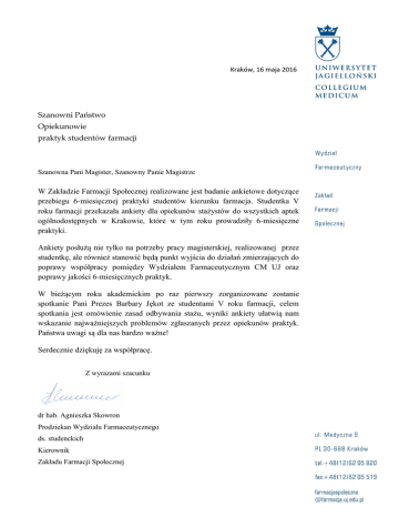 Kraków, 16 maja 2016 Szanowni Państwo Opiekunowie praktyk studentów farmacji Szanowna Pani Magister, Szanowny Panie Magistrze W Zakładzie Farmacji Społecznej realizowane jest badanie ankietowe dotyczące przebiegu 6-miesięcznej praktyki studentów kierunku farmacja. Studentka V roku farmacji przekazała ankiety dla opiekunów stażystów do wszystkich aptek ogólnodostępnych w Krakowie, które w tym roku prowadziły 6-miesięczne praktyki. Ankiety posłużą nie tylko na potrzeby pracy magisterskiej, realizowanej przez studentkę, ale również stanowić będą punkt wyjścia do działań zmierzających do poprawy współpracy pomiędzy Wydziałem Farmaceutycznym CM UJ oraz poprawy jakości 6-miesięcznych praktyk. W bieżącym roku akademickim po raz pierwszy zorganizowane zostanie spotkanie Pani Prezes Barbary Jękot ze studentami V roku farmacji, celem spotkania jest omówienie zasad odbywania stażu, wyniki ankiety ułatwią nam wskazanie najważniejszych problemów zgłaszanych przez opiekunów praktyk. Państwa uwagi są dla nas bardzo ważne! Serdecznie dziękuję za współpracę. Z wyrazami szacunku dr hab. Agnieszka Skowron Prodziekan Wydziału Farmaceutycznego ds. studenckich Kierownik Zakładu Farmacji Społecznej