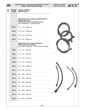 40 NR N° Węże zbrojone – parowe, pneumatyczne, vacuum Steam, air and vacumm hoses NR ART. CODE KATALOG CZĘŚCI PARTS CATALOG NAZWA TOWARU DESCRIPTION Węże teflonowe w oplocie bawełnianym do żelazek parowych PTFE hoses cotton covered for irons gwint wewnętrzny / female thread 1 40010 1/4” x 1/4” x 1600 mm 40020 1/4” x 1/4” x 1800 mm 40030 1/4” x 1/4” x 2100 mm 40040 1/4” x 1/4” x 2500 mm Węże teflonowe w oplocie stalowym PTFE hoses inox covered gwint wewn. stożkowy / female conoidal thread 2 40060 1/4” x 1/4” x 350 mm 40062 1/4” x 1/4” x 500 mm 40064 1/4” x 1/4” x 700 mm 40068 1/4” x 1/4” x 1000 mm 40070 1/4” x 1/4” x 1200 mm 40100 3/8” x 3/8” x 300 mm 40102 3/8” x 3/8” x 400 mm 40103 3/8” x 3/8” x 500 mm 40104 3/8” x 3/8” x 600 mm 40105 3/8” x 3/8” x 700 mm 40106 3/8” x 3/8” x 800 mm 40107 3/8” x 3/8” x 900 mm 40108 3/8” x 3/8” x 1000 mm 1 2 40-1 40 Węże zbrojone – parowe, pneumatyczne, vacuum Steam, air and vacumm hoses NR N° NR ART. CODE 1 40110 3/8” x 3/8” x 1200 mm 40115 3/8” x 3/8” x 1500 mm 40120 3/8” x 3/8” x 2000 mm 40135 3/8” x 3/8” x 3500 mm 40210 1/2” x 1/2” x 300 mm 40212 1/2” x 1/2” x 500 mm 40213 1/2” x 1/2” x 600 mm 40214 1/2” x 1/2” x 700 mm 40215 1/2” x 1/2” x 800 mm 40216 1/2” x 1/2” x 900 mm 40217 1/2” x 1/2” x 1000 mm 40220 1/2” x 1/2” x 1200 mm 40250 1/2” x 1/2” x 1500 mm 40257 1/2” x 1/2” x 3500 mm 40350 3/4” x 3/4” x 500 mm 40370 3/4” x 3/4” x 700 mm 40380 3/4” x 3/4” x 1000 mm 40450 1” x 1” x 500 mm 40370 1” x 1” x 700 mm NAZWA TOWARU DESCRIPTION 1 1 Węże do pneumatyki Plastic hose for air 40705 KATALOG CZĘŚCI PARTS CATALOG 12.5x3 mm zbrojony / armored 40-2 40 NR N° Węże zbrojone – parowe, pneumatyczne, vacuum Steam, air and vacumm hoses NR ART. CODE KATALOG CZĘŚCI PARTS CATALOG NAZWA TOWARU DESCRIPTION 40708 12.5x3 mm zbrojony / armored 40709 4 x 2 mm, 27 bar 40810 6 x 4 mm, 13 bar 40814 6 x 4 mm, 27 bar 1 40820 8 x 6 mm, 8 bar 40830 10 x 8 mm, 6 bar Węże do vacuum Vacuum hoses 1 40860 Wąż aluminiowy giętki (peszel) Ø40 Aluminium hose Ø40 40870 Wąż aluminiowy giętki (peszel) Ø50 Aluminium hose Ø50 40875 Wąż powlekany zbrojony (peszel) Ø44 Armored hose Ø44 40880 Wąż powlekany zbrojony (peszel) Ø55 Armored hose Ø44 2 2 Izolacje na węże parowe Insulating sheath 3 40950 Izolacja szklano-bawełniana Fiber glass insulating sheath 15-30 mm (1/4” + 3/8”) 40955 Izolacja szklano-bawełniana Fiber glass insulating sheath 10-22 mm (1/4”) 40960 Izolacja szklano-bawełniana Fiber glass insulating sheath 20-40 mm (1/2” + 1”) 40965 Izolacja szklano-bawełniana Fiber glass insulating sheath 25-40 mm (3/8” + 1/2”) 3 40-3