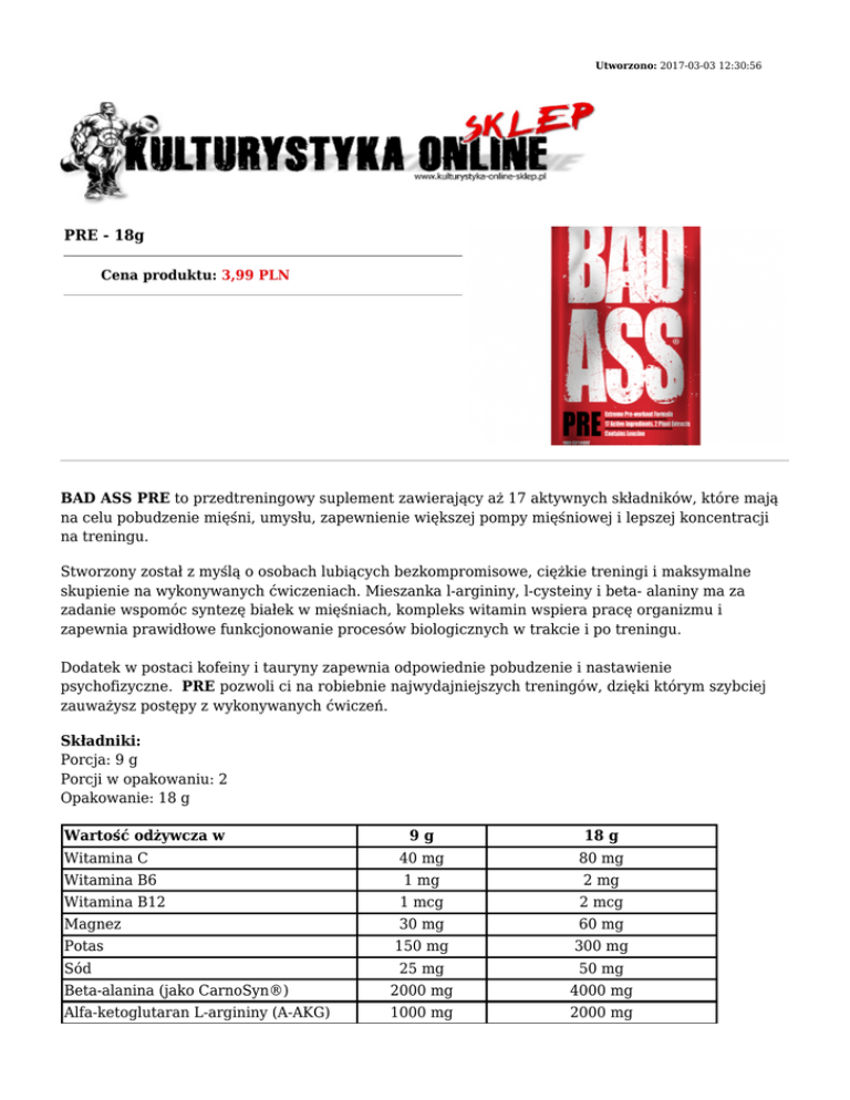 Utworzono: 2017-03-03 12:30:56 PRE - 18g Cena produktu: 3,99 PLN BAD ASS PRE to przedtreningowy suplement zawierający aż 17 aktywnych składników, które mają na celu pobudzenie mięśni, umysłu, zapewnienie większej pompy mięśniowej i lepszej koncentracji na treningu. Stworzony został z myślą o osobach lubiących bezkompromisowe, ciężkie treningi i maksymalne skupienie na wykonywanych ćwiczeniach. Mieszanka l-argininy, l-cysteiny i beta- alaniny ma za zadanie wspomóc syntezę białek w mięśniach, kompleks witamin wspiera pracę organizmu i zapewnia prawidłowe funkcjonowanie procesów biologicznych w trakcie i po treningu. Dodatek w postaci kofeiny i tauryny zapewnia odpowiednie pobudzenie i nastawienie psychofizyczne. PRE pozwoli ci na robiebnie najwydajniejszych treningów, dzięki którym szybciej zauważysz postępy z wykonywanych ćwiczeń. Składniki: Porcja: 9 g Porcji w opakowaniu: 2 Opakowanie: 18 g Wartość odżywcza w 9g 18 g Witamina C 40 mg 80 mg Witamina B6 1 mg 2 mg Witamina B12 1 mcg 2 mcg Magnez 30 mg 60 mg Potas 150 mg 300 mg Sód 25 mg 50 mg Beta-alanina (jako CarnoSyn®) 2000 mg 4000 mg Alfa-ketoglutaran L-argininy (A-AKG) 1000 mg 2000 mg Tyrozyna 500 mg 1000 mg Kofeina 200 mg 400 mg L-Karnityna 550 mg 1100 mg Dwuwinian choliny 175 mg 350 mg Tauryna 250 mg 500 mg Glukuronolakton 50 mg 100 mg Ekstrakt z korzenia buraka 500 mg 1000 mg Ekstrakt z Lotosu orzechodajnego 250 mg 500 mg L-Ornityna 250 mg 500 mg L-Leucyna 500 mg 1000 mg L-Cysteina 300 mg 600 mg Składniki: Beta-alanina (jako CarnoSyn®), alfa-ketoglutaran-L-argininy, premiks witaminowo-mineralny [cytrynian potasu, cytrynian magnezu, cytrynian sodu, witamina C (kwas L-askorbinowy), witamina B6 (chlorowodorek pirydoksyny), witamina B12 (cyjanokobalamina)], aromaty, L-karnityna, L-tyrozyna, ekstrakt z czerwonego buraka (Beta vulgaris L.), L-leucyna, koncentrat soku buraczanego4,6, barwnik (E150c, E1635), L-cysteina, L-ornityna, tauryna, ekstrakt z lotosu orzechodajnego (Nelumbo nucifera Gaertn.), kofeina, barwnik (E160a), dwuwininan choliny, glukuronolakton, barwnik/i (E160a, E104, E102, E132, E133), substancja przeciwzbrylająca (dwutlenek krzemu), substancje słodzące (sukraloza, acesulfam K). Sposób użycia: Pół zawartości saszetki (~9 g) zmieszać z 200 ml wody. Wypić jedną porcję 20 minut przed treningiem a drugą w trakcie treningu. Adres: http://www.ko.sklep.pl/ Telefon: kom. 782 010 880 Email: [email protected]