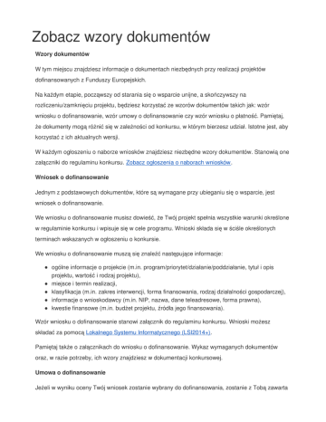 Zobacz wzory dokumentów Wzory dokumentów W tym miejscu znajdziesz informacje o dokumentach niezbędnych przy realizacji projektów dofinansowanych z Funduszy Europejskich. Na każdym etapie, począwszy od starania się o wsparcie unijne, a skończywszy na rozliczeniu/zamknięciu projektu, będziesz korzystać ze wzorów dokumentów takich jak: wzór wniosku o dofinansowanie, wzór umowy o dofinansowanie czy wzór wniosku o płatność. Pamiętaj, że dokumenty mogą różnić się w zależności od konkursu, w którym bierzesz udział. Istotne jest, aby korzystać z ich aktualnych wersji. W każdym ogłoszeniu o naborze wniosków znajdziesz niezbędne wzory dokumentów. Stanowią one załączniki do regulaminu konkursu. Zobacz ogłoszenia o naborach wniosków. Wniosek o dofinansowanie Jednym z podstawowych dokumentów, które są wymagane przy ubieganiu się o wsparcie, jest wniosek o dofinansowanie. We wniosku o dofinansowanie musisz dowieść, że Twój projekt spełnia wszystkie warunki określone w regulaminie konkursu i wpisuje się w cele programu. Wnioski składa się w ściśle określonych terminach wskazanych w ogłoszeniu o konkursie. We wniosku o dofinansowanie muszą się znaleźć następujące informacje: ogólne informacje o projekcie (m.in. program/priorytet/działanie/poddziałanie, tytuł i opis projektu, wartość i rodzaj projektu), miejsce i termin realizacji, klasyfikacja (m.in. zakres interwencji, forma finansowania, rodzaj działalności gospodarczej), informacje o wnioskodawcy (m.in. NIP, nazwa, dane teleadresowe, forma prawna), kwestie finansowe (m.in. budżet projektu, źródła jego finansowania). Wzór wniosku o dofinansowanie stanowi załącznik do regulaminu konkursu. Wnioski możesz składać za pomocą Lokalnego Systemu Informatycznego (LSI2014+). Pamiętaj także o załącznikach do wniosku o dofinansowanie. Wykaz wymaganych dokumentów oraz, w razie potrzeby, ich wzory znajdziesz w dokumentacji konkursowej. Umowa o dofinansowanie Jeżeli w wyniku oceny Twój wniosek zostanie wybrany do dofinansowania, zostanie z Tobą zawarta umowa o dofinansowanie. Określa ona zasady, na jakich przyznano Ci środki oraz podstawowe obowiązki związane z realizacją projektu i jego rozliczeniem. Przed podpisaniem umowy musisz zgromadzić wymagane załączniki. Najczęściej wymagane są: aktualny wpis do ewidencji działalności gospodarczej lub Krajowego Rejestru Sądowego, zaświadczenia o niezaleganiu w opłatach podatków i składek ZUS, zaświadczenie o niekaralności a także dokumenty specyficzne dla Twojego projektu. W umowie o dofinansowanie znajdują się takie informacje jak: ogólne informacje (m.in. identyfikacja projektu, program/priorytet/działanie/poddziałanie, nazwy instytucji zawierającej umowę i odpowiedzialnej za sprawdzanie wniosków o płatność, termin realizacji, kwestie finansowe), informacje o beneficjencie (m.in. NIP, nazwa, dane teleadresowe, forma prawna, numer rachunku bankowego), zasady przekazywania środków unijnych (m.in. terminy przekazania, poziom dofinansowania, warunki otrzymania transzy, określenie zaliczkowania bądź refundacji wydatków), zasady rozliczania projektu, obowiązki beneficjenta (m.in. obowiązki informacyjno-promocyjne, sprawozdawczość w projekcie, zachowanie zasady konkurencyjności, ochrona danych osobowych, itp.) zasady monitorowania i kontroli projektu, warunki rozwiązania umowy o dofinansowanie. Wzór umowy o dofinansowanie – tak, jak wzór wniosku - stanowi załącznik do regulaminu konkursu. Do umowy załączana jest treść wniosku o dofinansowanie, który złożyłeś w ramach konkursu. Wniosek o płatność Środki z Funduszy Europejskich wypłacane są na podstawie wniosków o płatność. We wniosku o płatność musisz wskazać okres, za który się rozliczasz oraz uzupełnić informacje o wydatkach, refundacjach/zaliczkach, kategoriach kosztów, wpisać źródła finansowania wydatków, przedstawić zestawienie dokumentów potwierdzających poniesione wydatki oraz wskazać wartości wskaźników osiągnięte dla danego okresu sprawozdawczego. Wnioski o płatność są podstawą do wypłaty przyznanej dotacji w formie zaliczki, refundacji częściowej lub całkowitej. Po zakończeniu projektu w terminie określonym w umowie o dofinansowanie jesteś zobowiązany złożyć wniosek o płatność końcową. Na tym etapie następuje ostateczne rozliczenie projektu, weryfikowane jest m.in. to czy wszystkie koszty zostały prawidłowo poniesione. Wnioski o płatność są składane za pomocą SL2014 - aplikacji głównej centralnego systemu teleinformatycznego.