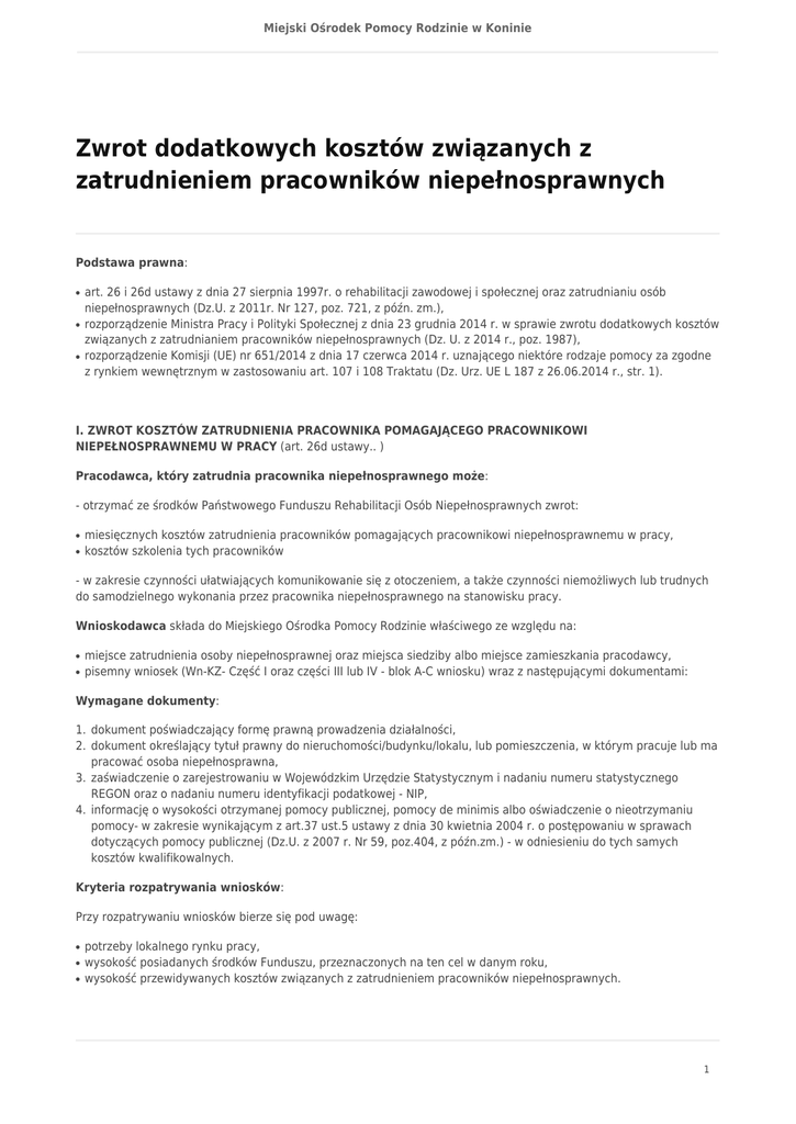 Miejski Ośrodek Pomocy Rodzinie w Koninie Zwrot dodatkowych kosztów związanych z zatrudnieniem pracowników niepełnosprawnych Podstawa prawna: ● ● ● art. 26 i 26d ustawy z dnia 27 sierpnia 1997r. o rehabilitacji zawodowej i społecznej oraz zatrudnianiu osób niepełnosprawnych (Dz.U. z 2011r. Nr 127, poz. 721, z późn. zm.), rozporządzenie Ministra Pracy i Polityki Społecznej z dnia 23 grudnia 2014 r. w sprawie zwrotu dodatkowych kosztów związanych z zatrudnianiem pracowników niepełnosprawnych (Dz. U. z 2014 r., poz. 1987), rozporządzenie Komisji (UE) nr 651/2014 z dnia 17 czerwca 2014 r. uznającego niektóre rodzaje pomocy za zgodne z rynkiem wewnętrznym w zastosowaniu art. 107 i 108 Traktatu (Dz. Urz. UE L 187 z 26.06.2014 r., str. 1). I. ZWROT KOSZTÓW ZATRUDNIENIA PRACOWNIKA POMAGAJĄCEGO PRACOWNIKOWI NIEPEŁNOSPRAWNEMU W PRACY (art. 26d ustawy.. ) Pracodawca, który zatrudnia pracownika niepełnosprawnego może: - otrzymać ze środków Państwowego Funduszu Rehabilitacji Osób Niepełnosprawnych zwrot: ● ● miesięcznych kosztów zatrudnienia pracowników pomagających pracownikowi niepełnosprawnemu w pracy, kosztów szkolenia tych pracowników - w zakresie czynności ułatwiających komunikowanie się z otoczeniem, a także czynności niemożliwych lub trudnych do samodzielnego wykonania przez pracownika niepełnosprawnego na stanowisku pracy. Wnioskodawca składa do Miejskiego Ośrodka Pomocy Rodzinie właściwego ze względu na: ● ● miejsce zatrudnienia osoby niepełnosprawnej oraz miejsca siedziby albo miejsce zamieszkania pracodawcy, pisemny wniosek (Wn-KZ- Część I oraz części III lub IV - blok A-C wniosku) wraz z następującymi dokumentami: Wymagane dokumenty: 1. dokument poświadczający formę prawną prowadzenia działalności, 2. dokument określający tytuł prawny do nieruchomości/budynku/lokalu, lub pomieszczenia, w którym pracuje lub ma pracować osoba niepełnosprawna, 3. zaświadczenie o zarejestrowaniu w Wojewódzkim Urzędzie Statystycznym i nadaniu numeru statystycznego REGON oraz o nadaniu numeru identyfikacji podatkowej - NIP, 4. informację o wysokości otrzymanej pomocy publicznej, pomocy de minimis albo oświadczenie o nieotrzymaniu pomocy- w zakresie wynikającym z art.37 ust.5 ustawy z dnia 30 kwietnia 2004 r. o postępowaniu w sprawach dotyczących pomocy publicznej (Dz.U. z 2007 r. Nr 59, poz.404, z późn.zm.) - w odniesieniu do tych samych kosztów kwalifikowalnych. Kryteria rozpatrywania wniosków: Przy rozpatrywaniu wniosków bierze się pod uwagę: ● ● ● potrzeby lokalnego rynku pracy, wysokość posiadanych środków Funduszu, przeznaczonych na ten cel w danym roku, wysokość przewidywanych kosztów związanych z zatrudnieniem pracowników niepełnosprawnych. 1 Miejski Ośrodek Pomocy Rodzinie w Koninie Wysokość pomocy: Wysokość zwrotu miesięcznych kosztów zatrudnienia pracowników pomagających pracownikowi niepełnosprawnemu w pracy stanowi iloczyn kwoty najniższego wynagrodzenia i ilorazu liczby godzin w miesiącu przeznaczonych wyłącznie na pomoc pracownikowi niepełnosprawnemu i miesięcznej liczby godzin pracy pracownika niepełnosprawnego w miesiącu, przy czym liczba godzin przeznaczonych wyłącznie na pomoc pracownikowi niepełnosprawnemu nie może przekraczać liczby godzin odpowiadającej 20% liczby godzin pracy pracownika w miesiącu. Kosztami kwalifikowanymi są kwoty wynagrodzeń pracowników pomagających pracownikowi niepełnosprawnemu za czas poświęcony wyłącznie na tę pomoc. Natomiast w przypadku szkoleń są to koszty szkolenia pracowników pomagających pracownikowi niepełnosprawnemu w pracy i obejmują 100% kosztów szkolenia, nie więcej jednak niż równowartość kwoty najniższego wynagrodzenia. Sposób realizacji: Umowa cywilno-prawna zawarta pomiędzy Prezydentem Miasta Konina a Pracodawcą. Uwaga: Refundacja nie może dotyczyć kosztów poniesionych przez pracodawcę przed dniem zawarcia umowy. Pracodawca będący stroną umowy, której przedmiotem jest zwrot kosztów zatrudniania pracownika pomagającego pracownikowi niepełnosprawnemu w pracy przedkłada do rozliczenia umowy wniosek Wn-KZ- Część III i ponadto: ● ● ● ● ● zestawienie kosztów podlegających zwrotowi wraz z dowodem wypłaty wynagrodzenia pracownika pomagającego pracownikowi niepełnosprawnemu - w terminie do 20 dnia miesiąca następującego po miesiącu, za który wypłacono wynagrodzenie podlegające zwrotowi, kopie umów o pracę zawartych z pracownikami niepełnosprawnymi, kopie orzeczeń o stopniu niepełnosprawności, kopie umów o pracę zawartych z asystentami wraz z dokumentami potwierdzającymi, że zakres obowiązków tych pracowników obejmuje udzielanie pomocy pracownikom niepełnosprawnym, zaświadczenie o zasadności udzielenia pomocy pracownikowi niepełnosprawnemu, o którym mowa w art. 26d ust.1 ustawy wydane przez lekarza sprawującego profilaktyczną opiekę zdrowotna nad tym pracownikiem. W przypadku zwrot kosztów szkolenia rozliczenia umowy należy przedłożyć wniosek Wn-KZ- Część IV i dodatkowo: ● ● zestawienie kosztów podlegających zwrotowi (w zakresie określonym w bloku D części IV wniosku) w terminie do 20 dnia miesiąca następującego po miesiącu, w którym poniesiono całkowity koszt szkolenia, kopie dokumentu potwierdzającego ukończenie szkolenia. Pracodawca zobowiązany jest do przechowywania przez okres 10 lat dokumentacji pozwalającej na sprawdzenie zgodności przyznanej pomocy z przepisami rozporządzenia. Miejsce składania wniosku: Miejski Ośrodku Pomocy Rodzinie, 62-510 Konin, ul. Przyjaźni 5, pok. Nr 18. Wzór wniosków: ● ● ● Wn-KZ Część I Wn-KZ Część III Wn-KZ Część IV II. ZWROT KOSZTÓW PRZYSTOSOWANIA STANOWISKA PRACY DLA OSOBY NIEPEŁNOSPRAWNEJ (art. 26 ustawy …) Pracodawca, który przez okres 36 miesięcy zatrudni osoby niepełnosprawne: 2 Miejski Ośrodek Pomocy Rodzinie w Koninie ● ● bezrobotne lu