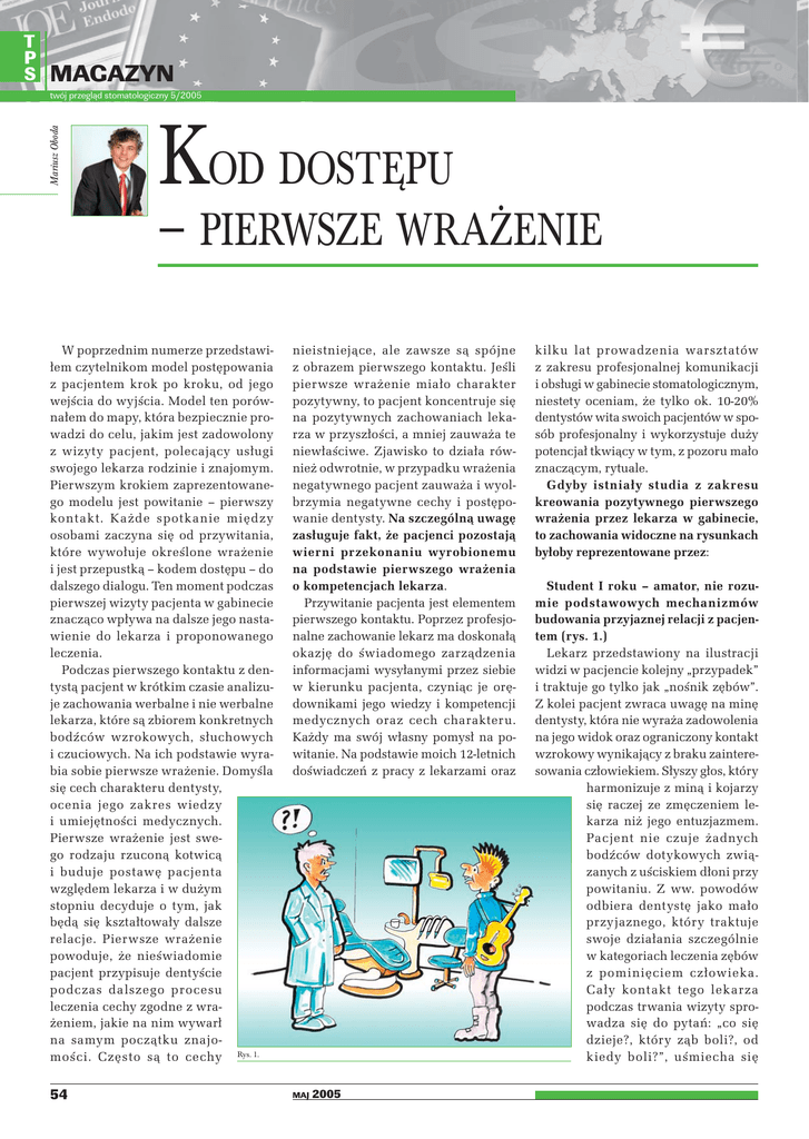 MAGAZYN twój przegląd stomatologiczny 5/2005 Mariusz Oboda T P S KOD DOSTĘPU – PIERWSZE WRAŻENIE W poprzednim numerze przedstawiłem czytelnikom model postępowania z pacjentem krok po kroku, od jego wejścia do wyjścia. Model ten porównałem do mapy, która bezpiecznie prowadzi do celu, jakim jest zadowolony z wizyty pacjent, polecający usługi swojego lekarza rodzinie i znajomym. Pierwszym krokiem zaprezentowanego modelu jest powitanie – pierwszy kontakt. Każde spotkanie między osobami zaczyna się od przywitania, które wywołuje określone wrażenie i jest przepustką – kodem dostępu – do dalszego dialogu. Ten moment podczas pierwszej wizyty pacjenta w gabinecie znacząco wpływa na dalsze jego nastawienie do lekarza i proponowanego leczenia. Podczas pierwszego kontaktu z dentystą pacjent w krótkim czasie analizuje zachowania werbalne i nie werbalne lekarza, które są zbiorem konkretnych bodźców wzrokowych, słuchowych i czuciowych. Na ich podstawie wyrabia sobie pierwsze wrażenie. Domyśla się cech charakteru dentysty, ocenia jego zakres wiedzy i umiejętności medycznych. Pierwsze wrażenie jest swego rodzaju rzuconą kotwicą i buduje postawę pacjenta względem lekarza i w dużym stopniu decyduje o tym, jak będą się kształtowały dalsze relacje. Pierwsze wrażenie powoduje, że nieświadomie pacjent przypisuje dentyście podczas dalszego procesu leczenia cechy zgodne z wrażeniem, jakie na nim wywarł na samym początku znajomości. Często są to cechy Rys. 1. nieistniejące, ale zawsze są spójne z obrazem pierwszego kontaktu. Jeśli pierwsze wrażenie miało charakter pozytywny, to pacjent koncentruje się na pozytywnych zachowaniach lekarza w przyszłości, a mniej zauważa te niewłaściwe. Zjawisko to działa również odwrotnie, w przypadku wrażenia negatywnego pacjent zauważa i wyolbrzymia negatywne cechy i postępowanie dentysty. Na szczególną uwagę zasługuje fakt, że pacjenci pozostają wierni przekonaniu wyrobionemu na podstawie pierwszego wrażenia o kompetencjach lekarza. Przywitanie pacjenta jest elementem pierwszego kontaktu. Poprzez profesjonalne zachowanie lekarz ma doskonałą okazję do świadomego zarządzenia informacjami wysyłanymi przez siebie w kierunku pacjenta, czyniąc je orędownikami jego wiedzy i kompetencji medycznych oraz cech charakteru. Każdy ma swój własny pomysł na powitanie. Na podstawie moich 12-letnich doświadczeń z pracy z lekarzami oraz 54 MAJ 2005 kilku lat prowadzenia warsztatów z zakresu profesjonalnej komunikacji i obsługi w gabinecie stomatologicznym, niestety oceniam, że tylko ok. 10-20% dentystów wita swoich pacjentów w sposób profesjonalny i wykorzystuje duży potencjał tkwiący w tym, z pozoru mało znaczącym, rytuale. Gdyby istniały studia z zakresu kreowania pozytywnego pierwszego wrażenia przez lekarza w gabinecie, to zachowania widoczne na rysunkach byłoby reprezentowane przez: Student I roku – amator, nie rozumie podstawowych mechanizmów budowania przyjaznej relacji z pacjentem (rys. 1.) Lekarz przedstawiony na ilustracji widzi w pacjencie kolejny „przypadek” i traktuje go tylko jak „nośnik zębów”. Z kolei pacjent zwraca uwagę na minę dentysty, która nie wyraża zadowolenia na jego widok oraz ograniczony kontakt wzrokowy wynikający z braku zainteresowania człowiekiem. Słyszy głos, który harmonizuje z miną i kojarzy się raczej ze zmęczeniem lekarza niż jego entuzjazmem. Pacjent nie czuje żadnych bodźców dotykowych związanych z uściskiem dłoni przy powitaniu. Z ww. powodów odbiera dentystę jako mało przyjaznego, który traktuje swoje działania szczególnie w kategoriach leczenia zębów z pominięciem człowieka. Cały kontakt tego lekarza podczas trwania wizyty sprowadza się do pytań: „co się dzieje?, który ząb boli?, od kiedy boli?”, uśmiecha się MAGAZYN twój przegląd stomatologiczny 5/2005 przez zęby łudząc się, że pacjent tego nie zauważa. Takie zachowanie t ylko sprawdza się w gabinecie, który sprzedaje niską cenę, a nie profesjonalną usługę stomatologiczną. W tej pr ywatnej praktyce przyjmuje się głównie pacjentów chcących mało płacić i niewymagających zbyt wiele. Najczęściej wyko- Rys. 2. nywane tam usługi to wiercenie, plombowanie i płacenie. Jaka płaca, taka obsługa. Większość lekarzy postępująca w przedstawiony powyżej sposób z własnego wyboru leczy mało zamożną, niewymagającą grupę pacjentów. Często są oni nieświadomi swoich zachowań, a przyczyn niezadowolenia i oszczędności pacjenta upatrują w czynnikach zewnętrznych. Nie dostrzegają związku przyczynowo-skutkowego pomiędzy swoją komunikacją i jakością obsługi w gabinecie, a jej rezultatami w postaci poziomu satysfakcji pacjenta z wizyty. Reasumując zachowanie dentysty z ilustracji nr 1, zauważamy: Kontakt wzrokowy Uśmiech Barwa głosu Uścisk dłoni Słaby Brak Bez wyrazu Brak nież siłę przywódcy. Bycie miłym wystarczyło i było skuteczne jeszcze kilka lat temu. Obecnie pacjenci oczekują również profesjonalizmu w obsłudze, a przez to poczucia, że lekarz dysponuje potencjałem zdolnym do spełnienia ich oczekiwań. Analizując scenkę i zachowanie lekarza z ilustracji nr 2 można powiedzieć: Kontakt wzrokowy Uśmiech Barwa głosu Uścisk dłoni witać z pacjentem, ponieważ to niszczy autorytet lekarza. Jednak pacjentowi należy się pochwała, że wybrał tego konkretnego lekarza spośród innych w okolicy, dlatego dentysta jest miły i uśmiecha się do niego. Wprowadzając uproszczenie, można powiedzieć, że lekarz chce w ten sposób pokazać swój autorytet i swoją siłę. Inna wersja jest taka, że dentysta nieświadomie manifestuje swoje niskie poczucie własnej wartości i w ten sposób komunikuje to pacjentowi. Swoim zachowaniem przekazuje informacje, że nie potrafi być przywódcą. Umie wyleczyć ząb, ale nie potrafi stać się dla pacjenta liderem. Oczywiście lekarz nie musi