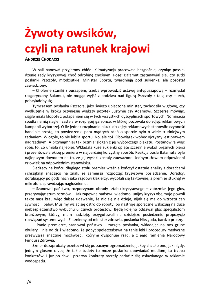 Żywoty owsików, czyli na ratunek krajowi ANDRZEJ CHODACKI W sali panował przyjemny chłód. Klimatyzacja pracowała bezgłośnie, czyniąc possiedzenie rady kryzysowej choć odrobinę znośnym. Poseł Bałamut zastanawiał się, czy sutki posłanki Pszczoły, młodziutkiej Minister Sportu, twardnieją pod sukienką, ale pozostał zawiedziony. – Cholerne staniki z puszapem, trzeba wprowadzić ustawę antypuszapową – rozmyślał rozgoryczony Bałamut, nie mogąc wyjść z podziwu nad figurą Pszczoły z talią osy – ech, pobzykałoby się. Tymczasem posłanka Pszczoła, jako świeżo upieczona minister, zachodziła w głowę, czy wydłużenie w kroku przyniesie większy pożytek Justynie czy Adamowi. Szczerze mówiąc, ciągle miała kłopoty z połapaniem się w tych wszystkich dyscyplinach sportowych. Nominacja spadła na nią nagle i zastała w rozpiętej garsonce, w której pozowała do zdjęć reklamowych kampanii wyborczej. O ile jednak rozpinanie bluzki do zdjęć reklamowych stanowiło czynność banalnie prostą, to powiedzenie paru mądrych zdań o sporcie było o wiele trudniejszym zadaniem. W ogóle, to nie lubiła sportu. No, ale cóż. Obowiązek wobec ojczyzny jest prawem nadrzędnym. A przynajmniej tak brzmiał slogan z jej wyborczego plakatu. Postanowiła więc robić to, co umiała najlepiej. Wkładała kuse sukienki opięte szczelnie wokół prężnych piersi i prezentowała ekipę premiera w najbardziej korzystny sposób. Reakcja posła Bałamuta była najlepszym dowodem na to, że jej wysiłki zostały zauważone. Jednym słowem odpowiedni człowiek na odpowiednim stanowisku. Siedzący na końcu długiego stołu premier właśnie kończył ostatnie analizy z doradcami i chrząknął znacząco na znak, że zamierza rozpocząć kryzysowe posiedzenie. Doradcy, dorabiający po godzinach jako rządowi klakierzy, wycofali się taktownie, a premier stuknął w mikrofon, sprawdzając nagłośnienie. – Szanowni państwo, rozpoczynam obrady sztabu kryzysowego – zabrzmiał jego głos, przerywając szum rozmów. – Jak zapewne państwu wiadomo, unijny kryzys obejmuje powoli także nasz kraj, więc dalsze udawanie, że nic się nie dzieje, nijak się ma do wzrostu cen żywności i paliw. Musimy wziąć się ostro do roboty, bo nastroje społeczne wskazują na duże niebezpieczeństwo wybuchu ulicznych protestów. Będę kolejno oddawał głos specjalistom branżowym, którzy, mam nadzieję, przygotowali na dzisiejsze posiedzenie propozycje rozwiązań systemowych. Zaczniemy od minister zdrowia, posłanka Niezgoda, bardzo proszę. – Panie premierze, szanowni państwo – zaczęła posłanka, wkładając na nos grube okulary – nie od dziś wiadomo, że popyt społeczeństwa na tanie leki i procedury medyczne przewyższa znacznie możliwości, którymi dysponuje rząd, a z jego ramienia Narodowy Fundusz Zdrowia. Szmer dezaprobaty przetoczył się po zacnym zgromadzeniu, jakby chciało ono, jak nigdy, jednym głosem orzec, że takie bzdety to może posłanka opowiadać mediom, tu trzeba konkretów. I już po chwili przerwy konkrety zaczęły padać z siłą osławianego w reklamie wodospadu. 1/4 – Biznesmen powie „czas to pieniądz”, kardiolog mawia „czas to mięsień”, ja mówię dziś „refundacja to pieniądz”. To tu tkwi największe zagrożenie dla służby zdrowia naszego kraju. Za dużo marnotrawimy pieniędzy na refundację leków. To trzeba ukrócić! Ostatnie słowa minister wybrzmiały jak twarde warunki bezwzględnej kapitulacji. – Zapewne pani minister ma jakieś gotowe propozycje? – rzucił premier z nadzieją, bo temat był nieświeży i jako taki zaczynał cuchnąć. – Oczywiście, panie premierze – z pobłażaniem dla niecierpliwego przełożonego wyraziła się posłanka, po czym rozpoczęła swój taniec. – Sto pięćdziesiąt tysięcy lekarzy, każdy chce refundować. Nie muszę nikomu przypominać, że to setki milionów przepuszczone przez zachłanne przewody pokarmowe pacjentów i lądujące w szambie. Proponuję wprowadzić ustawę, która przewiduje dla lekarzy kary więzienia za błędy w refundacji, np. osiem lat więzienia bez zawiasów… – Tu zawiesiła głos, delektując się szumem krytyki, który podniósł się na sali. Premier uciszył zebranych ruchem ręki. – No, ale zaraz się zbuntują i pozamykają gabinety – wyraził swą wątpliwość, pocierając łyse czoło. – To możliwe, dlatego po miesiącu wycofamy ustawę – dodała pewnym głosem Niezgoda – i wprowadzimy umowy z lekarzami na refundację leków, w których zawrzemy duże kary finansowe za refundowanie czegokolwiek. Dodatkowo we wskazaniach do refundacji należy wnieść zapisy tak rozbudowane i niespójne, by przeciętny lekarz z braku czasu lub strachu przed karami sam zrezygnował z refundowania. Gwarantuję, że siedemdziesiąt procent lekarzy nie podpisze nowych umów, a w budżecie zostanie kilkaset zaoszczędzonych milionów. Posłanka rzuciła papiery na stół i spojrzała z satysfakcją na wybrańców narodu, jakby chciała zapytać „I co, przebijecie mnie?”. – Propozycja jest bardzo obiecująca – twarz premiera rozjaśniła się uśmiechem, gdy pomyślał o milionach, które bez certolenia będzie mógł wydać na nowe limuzyny – to może się udać. Jedno pytanie, pani minister, co z pacjentami? Ostatecznie obiecałem im w exposé tanie leczenie i takie tam... – Tu zamachał ręką, jakby mówił o sposobach na uzdrowienie ekstraklasy piłki nożnej. – To także przewidziałam – zerknęła na niego Niezgoda, obniżając okulary na nosie – rozbudujemy instytucję rzecznika praw pacjenta i damy narzędzia prawne, by bez opóźnień pozywać lekarzy do sądu za pominięcie na recepcie należnej pacjentom refundacji. W ten sposób, czy lekarze będą refundować, czy nie, pieniądze i tak spłyną do budżetu. Minister zdrowia ostatecznie zatrzasnęła notes i rozparła się z ulgą w fotelu. – Trzeba przyzna