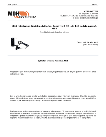 MDH System Strona 1 MDH-SYSTEM ul. Bajkowa 5, Lublin tel./fax.81-444-62-85 lub kom.693-865-235 e mail: [email protected] Mini rejestrator dźwięku, dyktafon, Pendrive 8 GB , do 140 godzin nagrań, MP3 Produkt z kategorii: Dyktafony cyfrowe Cena: 259.00 zł z VAT (210.57 zł netto) Dyktafon cyfrowy, Pendrive, Mp3 Urządzenie jest miniaturowym dyktafonem służącym jednocześnie jak zwykła pamięć przenośna oraz odtwarzacz Mp3. Jest to urządzenie bardzo proste w obsłudze, posiadające czuły mikrofon zbierający dźwięki z otoczenia nawet 20-30m2. Czas pracy na wewnętrznym akumulatorze wynosi nawet 10godz, a czas nagrań które zmieszczą się na wewnętrznej pamięci urządzenia wynosi nawet 140godzin. Zapisane dane można potem odtworzyć za pomocą komputera . W tym samym momencie będzie ładował się również akumulator urządzenia. Istnieje również możliwość odtworzenia danych bezpośrednio z urządzenia przez słuchawki znajdujące się w komplecie. Funkcja ta jest dość wygodna. Sprawia że nagrania możemy odsłuchać w środku miasta, a samochodzie itp. bez angażowania w to komputera. MDH System Strona 2 Urządzenie można umieścić wszędzie tam gdzie potrzebny jest dyskretny podgląd bez angażowania w to dużych środków finansowych i gdzie instalacja klasycznego monitoringu nie wchodzi w grę. Dla ułatwienia lokalizacji w czasie, urządzenie zapisuje na nagraniu godzinę co pozwala na ustalenie chronologii nagranych zdarzeń. Wygląd przypominający zwykła pamięć przenośna, którą nie budzi podejrzeń pozwala mu działać bardzo dyskretnie, także w widocznym miejscu. Parametry urządzenia: Częstotliwość 20-20000Hz Częstotliwość próbkowania 8khz Jakość nagrania 128kbps Rodzaj nośnika i pojemność Pamięć wbudowana 8GB Czułość 20-30m2 Czas ładowania akumulatora 2-3 godz. Czas pracy na w pełni naładowanym akumulatorze 10-12 godz. MDH System Strona 3 Format zapisywanych plików WAV Zapis czasu Tak Złącza do komunikacji USB Waga 15g Wymiary 72x24x9mm Kolor obudowy i materiał z którego jest wykonana Czarny/ plastik Odporność na warunki zewnętrzne Brak Zawartość opakowania Dyktafon, słuchawki, instrukcja Zapraszamy do naszego sklepu internetowego www.mdh-system.pl Dokument wygenerowany 2017-03-03 o godzinie 12:31