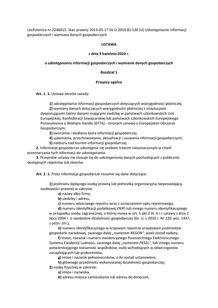LexPolonica nr 2246015. Stan prawny 2013-05-17 Dz.U.2010.81.530 (U) Udostępnianie informacji gospodarczych i wymiana danych gospodarczych USTAWA z dnia 9 kwietnia 2010 r. o udostępnianiu informacji gospodarczych i wymianie danych gospodarczych Rozdział 1 Przepisy ogólne Art. 1. 1. Ustawa określa zasady: 1) udostępniania informacji gospodarczych dotyczących wiarygodności płatniczej; 2) wymiany danych dotyczących wiarygodności płatniczej z instytucjami dysponującymi takimi danymi mającymi siedzibę w państwach członkowskich Unii Europejskiej, Konfederacji Szwajcarskiej lub państwach członkowskich Europejskiego Porozumienia o Wolnym Handlu (EFTA) - stronach umowy o Europejskim Obszarze Gospodarczym; 3) tworzenia i działania biura informacji gospodarczej; 4) ujawniania, przechowywania, aktualizacji i usuwania informacji gospodarczych; 5) nadzoru nad biurem informacji gospodarczej. 2. Informacje gospodarcze udostępnia się osobom trzecim nieoznaczonym w chwili przeznaczania tych informacji do udostępniania. 3. Przepisów ustawy nie stosuje się do udostępniania danych pochodzących z publicznie dostępnych rejestrów lub zbiorów. Art. 2. 1. Przez informacje gospodarcze rozumie się dane dotyczące: 1) podmiotu będącego osobą prawną lub jednostką organizacyjną nieposiadającą osobowości prawnej w zakresie: a) nazwy albo firmy, b) siedziby i adresu, c) numeru właściwego rejestru wraz z oznaczeniem sądu rejestrowego, d) numeru identyfikacji podatkowej (NIP) lub innego numeru identyfikacyjnego w przypadku osoby zagranicznej, o której mowa w art. 5 pkt 2 lit. b i c ustawy z dnia 2 lipca 2004 r. o swobodzie działalności gospodarczej (Dz. U. z 2010 r. Nr 220, poz. 1447, z późn. zm.), e) numeru identyfikacyjnego w krajowym rejestrze urzędowym podmiotów gospodarki narodowej, zwanego dalej „numerem REGON”, jeżeli został nadany, f) imion, nazwisk i numeru ewidencyjnego Powszechnego Elektronicznego Systemu Ewidencji Ludności, zwanego dalej „numerem PESEL”, lub innego numeru potwierdzającego tożsamość wspólników, osób wchodzących w skład organów zarządzających lub prokurentów, g) imion i nazwisk pełnomocników, o ile zostali ustanowieni, h) głównego przedmiotu wykonywanej działalności gospodarczej; 2) osoby fizycznej w zakresie: a) imion i nazwiska, b) adresu miejsca zamieszkania lub adresu do doręczeń, c) numeru PESEL lub innego numeru potwierdzającego tożsamość, d) serii i numeru dowodu osobistego lub innego dokumentu potwierdzającego tożsamość; 3) osoby fizycznej prowadzącej działalność gospodarczą w zakresie: a) imion i nazwiska, b) numeru PESEL lub innego numeru potwierdzającego tożsamość, c) serii i numeru dowodu osobistego lub innego dokumentu potwierdzającego tożsamość, d) firmy, e) oznaczenia miejsca zamieszkania i adresu do doręczeń lub adresu, pod którym jest wykonywana działalność gospodarcza, f) numeru identyfikacji podatkowej (NIP) lub innego numeru identyfikacyjnego w przypadku osoby zagranicznej, o której mowa w art. 5 pkt 2 lit. a ustawy z dnia 2 lipca 2004 r. o swobodzie działalności gospodarczej, g) numeru REGON, jeżeli został nadany, h) numeru właściwej ewidencji wraz z oznaczeniem organu ewidencyjnego lub numeru właściwego rejestru wraz z oznaczeniem sądu rejestrowego w przypadku osoby zagranicznej, o której mowa w art. 5 pkt 2 lit. a ustawy z dnia 2 lipca 2004 r. o swobodzie działalności gospodarczej, i) imion i nazwisk pełnomocników, o ile zostali ustanowieni, j) głównego przedmiotu wykonywanej działalności gospodarczej; 4) zobowiązania pieniężnego w zakresie: a) tytułu prawnego, b) kwoty i waluty, c) kwoty zaległości, d) daty powstania zaległości, e) informacji o postępowaniach dotyczących zobowiązania, f) informacji o kwestionowaniu przez dłużnika istnienia całości lub części zobowiązania, g) daty wysłania listem poleconym albo doręczenia dłużnikowi do rąk własnych wezwania do zapłaty, zawierającego ostrzeżenie o zamiarze przekazania danych do biura informacji gospodarczej, z podaniem firmy i adresu siedziby tego biura, h) informacji o zbyciu wierzytelności, i) innych informacji przekazanych w trybie i na zasadach określonych w art. 18; 5) posłużenia się podrobionym lub cudzym dokumentem w zakresie: a) nazwy dokumentu, b) serii i numeru dokumentu, c) daty wystawienia dokumentu, d) oznaczenia, siedziby i adresu podmiotu wskazanego w dokumencie jako jego wystawca, e) imion i nazwiska osoby, której dokument dotyczy, f) okoliczności posłużenia się dokumentem, g) wskazania osoby lub organu, który stwierdził, że dokument jest podrobiony lub cudzy. 2. Ilekroć w ustawie jest mowa o: 1) dłużniku - rozumie się przez to osobę fizyczną, w tym osobę fizyczną wykonującą działalność gospodarczą, osobę prawną lub jednostkę organizacyjną nieposiadającą osobowości prawnej, zobowiązaną względem wierzyciela w związku z wykonywaną działalnością gospodarczą lub stosunkiem prawnym; 2) dłużniku niebędącym konsumentem - rozumie się przez to: a) osobę fizyczną wykonującą działalność gospodarczą zobowiązaną względem wierzyciela w związku z wykonywaną działalnością gospodarczą, b) osobę prawną lub jednostkę organizacyjną nieposiadającą osobowości prawnej zobowiązaną względem wierzyciela w związku z wykonywaną działalnością gospodarczą lub stosunkiem prawnym; 3) dłużniku będącym konsumentem - rozumie się przez to osobę fizyczną, o której mowa w art. 221 ustawy z dnia 23 kwietnia 1964 r. - Kodeks cywilny (Dz. U. Nr 16, poz. 93, z późn. zm.), osobę zobowiązaną do świadczeń alimentacyjnych, o której mowa w art. 2 pkt 3 ustawy z dnia 7 września 2007 r. o pomocy osobom uprawnionym do alimentów (Dz. U. z 2009 r. Nr 1, poz. 7, z późn. zm.), a także rodzica zobowiązanego do ponoszenia opłaty za pobyt dziecka w rodzinie zastępczej, rodzinnym domu dziecka, placówce opieku