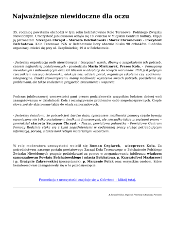 Najważniejsze niewidoczne dla oczu 35. rocznicę powstania obchodzi w tym roku bełchatowskie Koło Terenowe Polskiego Związku Niewidomych. Uroczystość jubileuszowa odbyła się 18 kwietnia w Miejskim Centrum Kultury. Objęli ją patronatem Szczepan Chrzęst – Starosta Bełchatowski i Marek Chrzanowski – Prezydent Bełchatowa. Koło Terenowe PZN w Bełchatowie liczy obecnie blisko 90 członków. Siedziba organizacji mieści się przy ul. Czaplinieckiej 19 A w Bełchatowie. - Jesteśmy organizacją osób niewidomych i tracących wzrok, dbamy o zaspokojenie ich potrzeb, czasem najbardziej podstawowych - powiedziała Maria Mielczarek, Prezes Koła. - Pomagamy niewidomym i słabowidzącym oraz ich bliskim w adaptacji do nowych warunków. PZN jest jedynym rzecznikiem naszego środowiska, edukuje nas, udziela porad, organizuje szkolenia czy spotkania integracyjne. Dzięki stowarzyszeniu mamy możliwość wyrażenia swoich potrzeb, podzielenia się problemami, ale także znalezienia przyjaciół, zrozumienia i wsparcia. Podczas jubileuszowej uroczystości pani prezes podziękowała wszystkim ludziom dobrej woli zaangażowanym w działalność Koła i rozwiązywanie problemów osób niepełnosprawnych. Ciepłe słowa zostały skierowane także do władz samorządowych. - Jesteśmy świadomi, że potrzeb jest bardzo dużo, tymczasem możliwości pomocy często bywają ograniczone nie tylko posiadanymi środkami finansowymi, ale nierzadko także przepisami prawa – powiedział starosta Szczepan Chrzęst. - Nasza, powiatowa jednostka - Powiatowe Centrum Pomocy Rodzinie styka się z tymi zagadnieniami w codziennej pracy służąc potrzebującym informacją, poradą, a także konkretnym materialnym wsparciem. W rolę moderatora uroczystości wcielił się Roman Ceglarek, wiceprezes Koła. Za pośrednictwem naszego portalu powiatowego Zarząd Koła Terenowego w Bełchatowie Polskiego Związku Niewidomych pragnie podziękować za pomoc w zorganizowaniu jubileuszu władzom samorządowym Powiatu Bełchatowskiego i miasta Bełchatowa, p. Krzysztofowi Maziarzowi i p. Grażynie Zakrzewskiej (poczęstunek), p. Marzenie Polak oraz wszystkim osobom, które bezinteresownie zaangażowały się w to przedsięwzięcie. Fotorelacja z uroczystości znajduje się w Galeriach - kliknij tutaj. A.Zawodzińska, Wydział Promocji i Rozwoju Powiatu