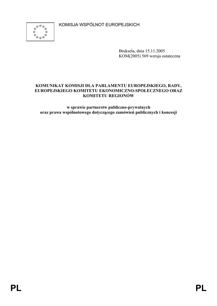 KOMISJA WSPÓLNOT EUROPEJSKICH Bruksela, dnia 15.11.2005 KOM(2005) 569 wersja ostateczna KOMUNIKAT KOMISJI DLA PARLAMENTU EUROPEJSKIEGO, RADY, EUROPEJSKIEGO KOMITETU EKONOMICZNO-SPOŁECZNEGO ORAZ KOMITETU REGIONÓW w sprawie partnerstw publiczno-prywatnych oraz prawa wspólnotowego dotyczącego zamówień publicznych i koncesji PL PL SPIS TREŚCI PL 1. Wstęp ........................................................................................................................... 3 2. Kluczowe kwestie dotyczące ewentualnych działań następczych ............................... 5 2.1. Zagadnienia wymagające działań na szczeblu WE...................................................... 5 2.2. Dialog konkurencyjny: Komisja przedstawi wyjaśnienie............................................ 5 2.3. Kwestie, w których na obecnym etapie nie zaproponowano osobnych inicjatyw WE ............................................................................................................................... 5 2.3.1. Brak nowego prawodawstwa obejmującego wszystkie PPP zawarte w drodze umowy.......................................................................................................................... 5 2.3.2. Brak działań Wspólnoty dotyczących konkretnych aspektów PPP. ............................ 6 2.4. Ciąg dalszy debaty na temat PPP na szczeblu WE ...................................................... 6 3. Koncesje....................................................................................................................... 7 3.1. Informacje ogólne ........................................................................................................ 7 3.2. Możliwości zapewnienia bezpieczeństwa prawnego ................................................... 7 3.3. Treść ewentualnej inicjatywy Wspólnoty w zakresie koncesji.................................... 9 4. Zinstytucjonalizowane PPP........................................................................................ 10 4.1. Podejście preferowane ............................................................................................... 10 4.2. Treść potencjalnego komunikatu wyjaśniającego w sprawie zinstytucjonalizo wanych PPP................................................................................................................ 10 5. Kolejne działania........................................................................................................ 12 2 PL KOMUNIKAT KOMISJI DLA PARLAMENTU EUROPEJSKIEGO, RADY, EUROPEJSKIEGO KOMITETU EKONOMICZNO-SPOŁECZNEGO ORAZ KOMITETU REGIONÓW w sprawie partnerstw publiczno-prywatnych oraz prawa wspólnotowego dotyczącego zamówień publicznych i koncesji (Tekst mający znaczenie dla EOG) 1. WSTĘP Władze publiczne na wszystkich szczeblach są coraz bardziej zainteresowane współpracą z sektorem prywatnym w zakresie zapewnienia infrastruktury lub świadczenia usług. Zainteresowanie współpracą, nazywaną zwyczajowo partnerstwami publiczno-prywatnymi (PPP) wynika częściowo z tego, że władze publiczne mogą czerpać korzyści z wiedzy specjalistycznej, jaką posiada sektor prywatny, zwłaszcza w celu zwiększenia efektywności. Częściowo zaś zainteresowanie to wynika z ograniczeń w budżecie publicznym. Jednakże PPP nie są cudownym rozwiązaniem: w przypadku każdego projektu należy ocenić, czy partnerstwo faktycznie stanowi wartość dodaną dla określonej usługi lub robót publicznych w porównaniu z innymi możliwościami, na przykład zawarciem bardziej tradycyjnych umów. Prawo wspólnotowe nie określa czy władze publiczne mają prowadzić działania gospodarcze we własnym zakresie, czy też powierzać ich realizację stronie trzeciej. Jeśli jednak władze publiczne podejmą decyzję o włączeniu stron trzecich do prowadzenia działań, wówczas prawo wspólnotowe w zakresie zamówień publicznych i koncesji może mieć zastosowanie. Głównym celem prawa wspólnotowego w dziedzinie zamówień publicznych i koncesji jest stworzenie rynku wewnętrznego, w którym zapewnione byłyby swobodny przepływ towarów i usług, swoboda zakładania działalności gospodarczej oraz podstawowe zasady równego traktowania, przejrzystości i wzajemnego uznawania, jak również umożliwienie uzyskania najwyższej jakości za daną kwotę przy zakupie produktów lub zlecaniu stronom trzecim wykonania pracy albo usługi przez władze publiczne. Ze względu na rosnące znaczenie PPP, uznano, że należy zbadać, w jakim zakresie istniejące przepisy wspólnotowe odpowiednio realizują te cele, jeśli chodzi o udzielanie zamówień lub koncesji partnerstwom publicznoprywatnym. Powinno to umożliwić Komisji ocenę, czy istnieje potrzeba wyjaśnienia, uzupełnienia lub poprawienia ram prawnych obowiązujących obecnie na szczeblu europejskim. W tym celu dnia 30 kwietnia 2004 r. Komisja przyjęła Zieloną Księgę w sprawie partnerstw publiczno-prywatnych oraz prawa wspólnotowego w zakresie zamówień publicznych i koncesji1. 1 PL COM (2004) 327 wersja ostateczna z 30.4.2004. 3 PL Debata, którą zapoczątkowała Zielona Księga spotkała się z dużym zainteresowaniem i ogólnym poparciem. Komisja otrzymała blisko 200 uwag od różnych respondentów, m.in. z wielu Państw Członkowskich. Zarówno Europejski Komitet Ekonomiczno-Społeczny2 jak i Komitet Regionów3 wydały opinie na temat Zielonej Księgi. W maju 2005 r. opublikowano sprawozdanie zawierające analizę wszystkich uwag przedstawionych w trakcie konsultacji publicznych4. W następstwie tych konsultacji, niniejszy komunikat prezentuje opcje dotyczące polityki w omawianej dziedzinie, w celu zapewnienia PPP skutecznej konkurencji, unikając niepotrzebnego ograniczania elastyczności niezbędnej do opracowania nowatorskich i często złożonych projektów. Określenie przez Komisję preferowanych rozwiązań w zakresie tej polityki na tym etapie jest zgodne z jej zobowiązanie