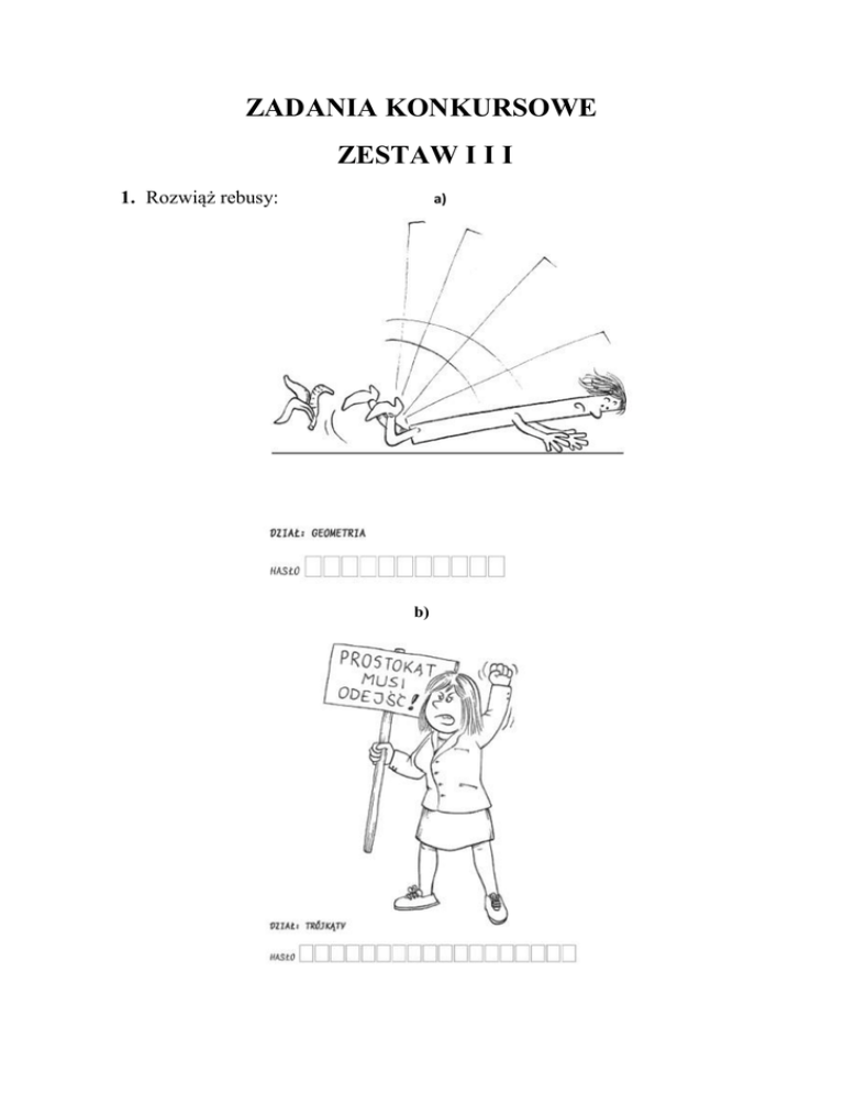 ZADANIA KONKURSOWE ZESTAW I I I 1. Rozwiąż rebusy: a) b) 2. Łamigłówki : a) Ziemniaki - Ile waży ten worek ziemniaków? – zapytał klient. - 50 funtów dzielone przez połowę jego wagi – odpowiedział sprzedawca. Ile ważył worek ziemniaków ? b) Koty i kanarki Sklep zoologiczny sprzedawał tylko koty i kanarki. Wystawiono na sprzedaż łącznie 72 sztuki kotów i kanarków w doskonałym stanie. Jeżeli miały one łącznie 200 nóg, to ile było kanarków? Odpowiedzi, na podpisanych kartkach, można oddawać do 18.05.2015 p. G. Sierackiej lub p. M.Konopce.