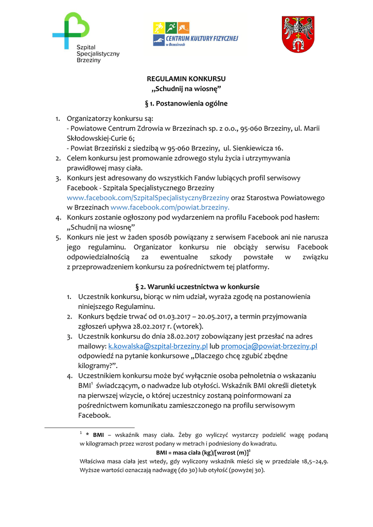 REGULAMIN KONKURSU „Schudnij na wiosnę” § 1. Postanowienia ogólne 1. Organizatorzy konkursu są: - Powiatowe Centrum Zdrowia w Brzezinach sp. z o.o., 95-060 Brzeziny, ul. Marii Skłodowskiej-Curie 6; - Powiat Brzeziński z siedzibą w 95-060 Brzeziny, ul. Sienkiewicza 16. 2. Celem konkursu jest promowanie zdrowego stylu życia i utrzymywania prawidłowej masy ciała. 3. Konkurs jest adresowany do wszystkich Fanów lubiących profil serwisowy Facebook - Szpitala Specjalistycznego Brzeziny www.facebook.com/SzpitalSpecjalistycznyBrzeziny oraz Starostwa Powiatowego w Brzezinach www.facebook.com/powiat.brzeziny. 4. Konkurs zostanie ogłoszony pod wydarzeniem na profilu Facebook pod hasłem: „Schudnij na wiosnę” 5. Konkurs nie jest w żaden sposób powiązany z serwisem Facebook ani nie narusza jego regulaminu. Organizator konkursu nie obciąży serwisu Facebook odpowiedzialnością za ewentualne szkody powstałe w związku z przeprowadzeniem konkursu za pośrednictwem tej platformy. 1. 2. 3. 4. § 2. Warunki uczestnictwa w konkursie Uczestnik konkursu, biorąc w nim udział, wyraża zgodę na postanowienia niniejszego Regulaminu. Konkurs będzie trwać od 01.03.2017 – 20.05.2017, a termin przyjmowania zgłoszeń upływa 28.02.2017 r. (wtorek). Uczestnik konkursu do dnia 28.02.2017 zobowiązany jest przesłać na adres mailowy: [email protected] lub [email protected] odpowiedź na pytanie konkursowe „Dlaczego chcę zgubić zbędne kilogramy?”. Uczestnikiem konkursu może być wyłącznie osoba pełnoletnia o wskazaniu BMI1 świadczącym, o nadwadze lub otyłości. Wskaźnik BMI określi dietetyk na pierwszej wizycie, o której uczestnicy zostaną poinformowani za pośrednictwem komunikatu zamieszczonego na profilu serwisowym Facebook. 1 * BMI – wskaźnik masy ciała. Żeby go wyliczyć wystarczy podzielić wagę podaną w kilogramach przez wzrost podany w metrach i podniesiony do kwadratu. BMI = masa ciała (kg)/[wzrost (m)]2 Właściwa masa ciała jest wtedy, gdy wyliczony wskaźnik mieści się w przedziale 18,5–24,9. Wyższe wartości oznaczają nadwagę (do 30) lub otyłość (powyżej 30). 5. Warunkami uczestnictwa w konkursie są: - zgoda na przetwarzanie przez organizatora danych osobowych w rozumieniu ustawy o ochronie danych osobowych z dn. 29.08.1997 r. (Dz. U. z 2002 r. Nr 101, poz. 926) – podpisywana na wizycie weryfikacyjnej u dietetyka; - zgoda na wykorzystanie przez organizatora wizerunków uczestników konkursu i informacji ich dotyczących, związanych z realizacją i przebiegiem konkursu, także w relacjach na temat konkursu zamieszczanych na profilu Facebook i na stronach internetowych organizatorów – podpisywana j.w.; 6. W konkursie nie mogą brać udziału pracownicy organizatorów. § 3. Zasady przebiegu konkursu. 1. Każdy, kto prześle odpowiedź na pytanie „Dlaczego chce zgubić zbędne kilogramy?”, zostanie zaproszony na bezpłatną analizę składu ciała. 2. Po pozytywnej weryfikacji uczestnika przez dietetyka, bierze on udział w konkursie. 3. Pośród wszystkich Uczestników konkursu, komisja złożona z przedstawicieli organizatorów wybierze 3 osoby, których odpowiedzi na pytanie konkursowe uzna za najciekawsze. W wyborze zwycięzców dodatkowo brane będą pod uwagę następujące kryteria: a) motywacja do wzięcia udziału w programie „schudnij na wiosnę” b) gotowość do zmiany stylu życia, w tym zwłaszcza nawyków żywieniowych c) stosowanie się do wskazówek dietetyka d) zawartość wody w organizmie e) obwód talii i bioder (cm) f) stosunek masy mięśniowej do masy tłuszczowej (%, kg) 4. Wybór laureatów nastąpi w ciągu 7 dni od zakończenia konkursu. 5. Laureaci zostaną poinformowani o wygranej telefonicznie i/lub za pośrednictwem poczty elektronicznej. § 4. Nagroda i jej realizacja. 1. 1 miejsce - nagrodą jest rower miejski (ufundowany przez Starostwo Powiatowe w Brzezinach) 2. 2 i 3 miejsce – rodzinny karnet uprawniający do korzystania z groty solnej (nagroda ufundowana przez Dyrektora Centrum Kultury Fizycznej w Brzezinach). 3. Laureaci, decydujący się na odbiór nagrody, wyrażają zgodę na udzielenie wywiadu dla Szpitala Specjalistycznego Brzeziny oraz Starostwa Powiatowego Brzeziny. 4. Nagrody nie można wymienić na gotówkę lub inną nagrodę. 5. Nagrody zostaną wręczone nie później niż 28.05.2017 r. § 5. Reklamacje. 1. Reklamacje w formie pisemnej należy złożyć najpóźniej w terminie 14 dni od daty ogłoszenia wyników konkursu w siedzibie organizatora konkursu: Szpital Specjalistyczny Brzeziny, ul. Marii Curie-Skłodowskiej 6, 95-060 Brzeziny. 2. Reklamacja musi zawierać imię i nazwisko, adres uczestnika, dokładny opis reklamacji i uzasadnienie. 3. Ewentualne reklamacje będą rozpatrzone w ciągu 14 dni od ich otrzymania. § 6. Postanowienia końcowe. 1. Organizator konkursu nie ponosi odpowiedzialności za niezależne od niego zdarzenia – w tym losowe lub spowodowane działaniem siły wyższej – uniemożliwiające prawidłowe przeprowadzenie konkursu. Wątpliwości, dotyczące przebiegu konkursu podczas jego trwa rozstrzyga organizator. 2. Organizator zastrzega sobie prawo do zmiany terminu zakończenia konkursu oraz daty publikacji wyników. 3. Organizator konkursu zastrzega sobie prawo do odwołania – z ważnych przyczyn – konkursu oraz do zmiany postanowień tego regulaminu, także w czasie trwania konkursu, w przypadku zmian przepisów lub innych ważnych okoliczności, które mogą mieć wpływ na przebieg konkursu. __________________________ Organizator PCZ w Brzezinach sp. z o.o. _________________________ Organizator Powiat Brzeziński