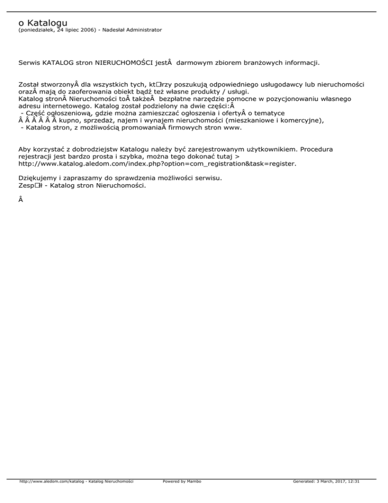 o Katalogu (poniedziałek, 24 lipiec 2006) - Nadesłał Administrator Serwis KATALOG stron NIERUCHOMOŚCI jest darmowym zbiorem branżowych informacji. Został stworzony dla wszystkich tych, ktÃłrzy poszukują odpowiedniego usługodawcy lub nieruchomości oraz mają do zaoferowania obiekt bądź też własne produkty / usługi. Katalog stron Nieruchomości to także bezpłatne narzędzie pomocne w pozycjonowaniu własnego adresu internetowego. Katalog został podzielony na dwie części: - Część ogłoszeniową, gdzie można zamieszczać ogłoszenia i oferty o tematyce       kupno, sprzedaż, najem i wynajem nieruchomości (mieszkaniowe i komercyjne), - Katalog stron, z możliwością promowania firmowych stron www. Aby korzystać z dobrodziejstw Katalogu należy być zarejestrowanym użytkownikiem. Procedura rejestracji jest bardzo prosta i szybka, można tego dokonać tutaj > http://www.katalog.aledom.com/index.php?option=com_registration&task=register. Dziękujemy i zapraszamy do sprawdzenia możliwości serwisu. ZespÃłł - Katalog stron Nieruchomości.  http://www.aledom.com/katalog - Katalog Nieruchomości Powered by Mambo Generated: 3 March, 2017, 12:31