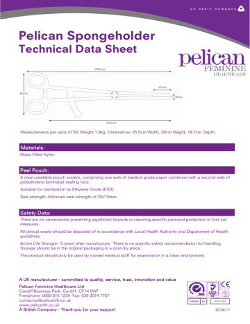 Pelican Spongeholder T echnical D ata Sheet M eas urements p er p ack o f 5 0 : W eig h t 1 .9 k g . D imens io ns : 2 5 .5 cm W id th , 3 9 cm H eig h t, 1 8 .7 cm D ep th . M aterials : G las s F illed N y lo n P eel P o uch : A clean p eelab le p o uch s y s tem, co mp ris ing o ne w eb o f med ical g rad e p ap er co mb ined w ith a s eco nd w eb o f p o ly eth y lene laminated s ealing face. S uitab le fo r s terilis atio n b y E th y lene O x id e (E T O ). S eal s treng th : M inimum s eal s treng th o f 2 N / 1 5 mm. S afety D ata: T h ere are no co mp o nents p res enting s ig nificant h az ard s o r req uiring s p ecific p ers o nal p ro tectio n o r firs t aid meas ures . All clinical w as te s h o uld b e d is p o s ed o f in acco rd ance w ith L o cal H ealth Auth o rity and D ep artment o f H ealth g uid elines . Activ e L ife S to rag e:- 5 y ears after manufacture. T h ere is no s p ecific s afety reco mmend atio n fo r h and ling . S to rag e s h o uld b e in th e o rig inal p ack ag ing in a co o l d ry p lace. T h e p ro d uct s h o uld o nly b e us ed b y trained med ical s taff fo r ex aminatio n in a clean env iro nment. A UK manufacturer - co mmitted to q uality , s erv ice, trus t, inno v atio n and v alue P elican F eminine H ealth care L td C ard iff B us ines s P ark , C ard iff. C F 1 4 5 W F F reep h o ne: 0 8 0 0 0 1 3 1 2 2 0 F ax : 0 2 9 2 0 7 4 7 7 5 7 co ntactus @ p elicanfh .co .uk w w w .p elicanfh .co .uk A B ritis h C o mp any - T h ank y o u fo r y o ur s up p o rt 2 0 .0 6 .1 1