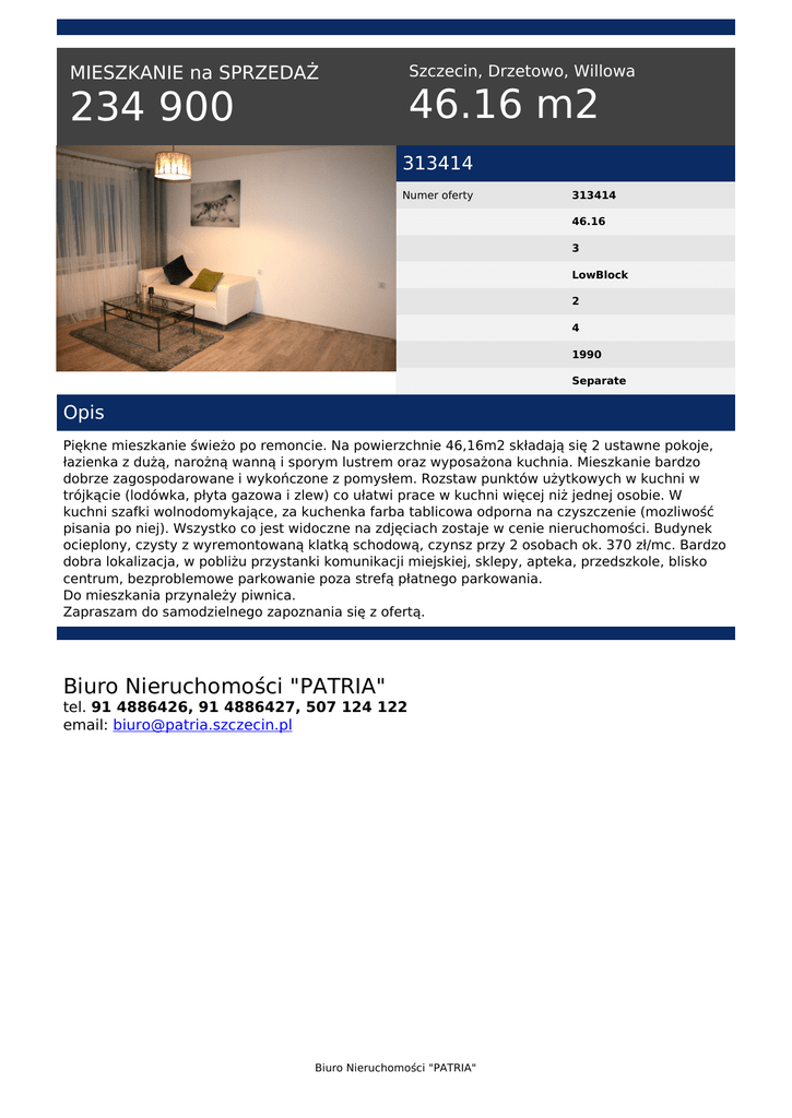 Szczecin, Drzetowo, Willowa MIESZKANIE na SPRZEDAŻ 46.16 m2 234 900 313414 Numer oferty 313414 46.16 3 LowBlock 2 4 1990 Separate Opis Piękne mieszkanie świeżo po remoncie. Na powierzchnie 46,16m2 składają się 2 ustawne pokoje, łazienka z dużą, narożną wanną i sporym lustrem oraz wyposażona kuchnia. Mieszkanie bardzo dobrze zagospodarowane i wykończone z pomysłem. Rozstaw punktów użytkowych w kuchni w trójkącie (lodówka, płyta gazowa i zlew) co ułatwi prace w kuchni więcej niż jednej osobie. W kuchni szafki wolnodomykające, za kuchenka farba tablicowa odporna na czyszczenie (mozliwość pisania po niej). Wszystko co jest widoczne na zdjęciach zostaje w cenie nieruchomości. Budynek ocieplony, czysty z wyremontowaną klatką schodową, czynsz przy 2 osobach ok. 370 zł/mc. Bardzo dobra lokalizacja, w pobliżu przystanki komunikacji miejskiej, sklepy, apteka, przedszkole, blisko centrum, bezproblemowe parkowanie poza strefą płatnego parkowania. Do mieszkania przynależy piwnica. Zapraszam do samodzielnego zapoznania się z ofertą. Biuro Nieruchomości "PATRIA" tel. 91 4886426, 91 4886427, 507 124 122 email: [email protected] Biuro Nieruchomości "PATRIA" Powered by TCPDF (www.tcpdf.org)