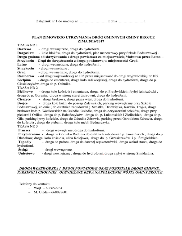 Załącznik nr 1 do umowy nr ………………….. z dnia ……………….. r. PLAN ZIMOWEGO UTRZYMANIA DRÓG GMINNYCH GMINY BROJCE ZIMA 2016/2017 TRASA NR 1 Darżewo - drogi wewnętrzne, droga do hydroforni. Dargosław - koło bloków, droga do hydroforni, plac manewrowy przy Szkole Podstawowej . Droga gminna od skrzyżowania z droga powiatowa za miejscowością Mołstowo przez Łatno – Strzykocin – Grąd do skrzyżowania z droga powiatową w miejscowości Grąd. Łatno - drogi wewnętrzne, droga do hydroforni . Strzykocin - drogi wewnętrzne . Grąd - drogi wewnętrzne, droga do hydrofornii. Raciborów - od drogi wojewódzkiej nr 105 przez miejscowość do drogi wojewódzkiej nr 105. Kiełpino - droga do cmentarza, droga koło sali wiejskiej, droga do hydroforni, droga do p. Ciesielczyków, droga do p. Ochnika. TRASA NR 2 Bielikowo - droga koło kościoła i cmentarza, droga do p. Przybylskich i byłej leśniczówki , droga do p. Gorynia, droga w stronę starej żwirowni, droga do hydroforni. Cieszyce - droga brukowa, droga przez wieś, droga do hydroforni. Brojce - droga koło kuźni do posesji Zalewskich, parking wewnętrzny przy Szkole Podstawowej, kolonie ( do ostatnich zabudowań ) Szóstka, Dziewiątka, Karwin, Trójka, droga brukowa koło p. Wasilewskich na Osiedle, Osiedle, droga do oczyszczalni ścieków, droga przy piekarni i Orliku, droga do p. Babańczyków , droga do. p. Łukomskich i Zielińskich, droga do p. Gila, parkingi przy kościele, droga do Ośrodka Zdrowia, parking przed Ośrodkiem Zdrowia, droga do kościoła , droga do plebanii, droga koło mebli Bednarczyka. TRASA NR 3 Pruszcz - drogi wewnętrzne, droga do hydroforni. Przybiernowo - droga w kierunku Radunia do ostatnich zabudowań p. Jarosińskich , droga do p. Dłubaków, droga koło kościoła, ulica Kolejowa, droga do p. Grzesiczaków i p. Śmigielskich . Tąpadły - droga do pałacu, droga do dawnej wąskotorówki, droga wokół stawu, droga do hydroforni. Stołąż - drogi wewnętrzne. Uniestowo - drogi wewnętrzne , droga do hydroforni, droga z płyt w stronę Simidarżna. DROGA WOJEWÓDZKA I DROGI POWIATOWE ORAZ POZOSTAŁE DROGI GMINNE, PARKINGI I CHODNIKI ODŚNIEŻANE BĘDĄ NA POLECENIE WÓJTA GMINY BROJCE Telefony do kontaktu Wójt – 606652234 M. Gieda – 668028601