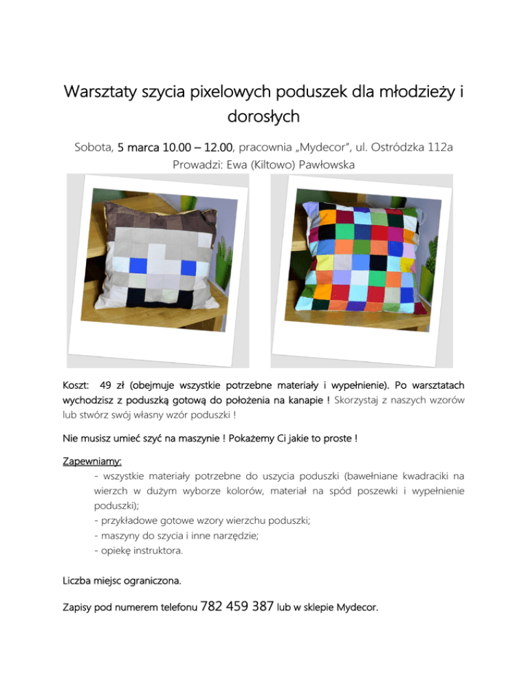 Warsztaty szycia pixelowych poduszek dla młodzieży i dorosłych Sobota, 5 marca 10.00 – 12.00, pracownia „Mydecor”, ul. Ostródzka 112a Prowadzi: Ewa (Kiltowo) Pawłowska Koszt: 49 zł (obejmuje wszystkie potrzebne materiały i wypełnienie). Po warsztatach wychodzisz z poduszką gotową do położenia na kanapie ! Skorzystaj z naszych wzorów lub stwórz swój własny wzór poduszki ! Nie musisz umieć szyć na maszynie ! Pokażemy Ci jakie to proste ! Zapewniamy: - wszystkie materiały potrzebne do uszycia poduszki (bawełniane kwadraciki na wierzch w dużym wyborze kolorów, materiał na spód poszewki i wypełnienie poduszki); - przykładowe gotowe wzory wierzchu poduszki; - maszyny do szycia i inne narzędzie; - opiekę instruktora. Liczba miejsc ograniczona. Zapisy pod numerem telefonu 782 459 387 lub w sklepie Mydecor.