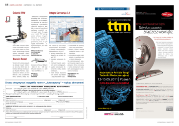 64 | AKTUALNOŚCI | NOWOŚCI NA RYNKU Ćwiartki TRW Integra Car wersja 7.4 i zawieszenia z amortyzatorem dla jednego koła samochodu. Dla warsztatu jest to rozwiązanie najprostsze w organizacji zaopatrzenia, a równocześnie najbardziej bezpieczne, gdyż daje ono pewność prawidłowej współpracy wszystkich wy- mienianych części. Koncepcję corner module TRW promuje szeroko zakrojona kampania reklamowa i marketingowa w całej Europie. Istotnym argumentem są w niej nie tylko względy bezpieczeństwa i zaFirma TRW Automotive After- lety technologiczne, lecz także Tak nazywa się nowa wersja market wprowadziła nowy ter- przystępne ceny. oprogramowania dla sklepów czasu pracy serwisantów, i serwisów samochodowych. bieżącą (online) kontrolę min corner module na oznaczenie dostarczanego łącznie zestawu elementów układu hamulcowego, kierowniczego TRW Automotive Aftermarket Parts & Service Office tel. 22 533 47 47 www.trwaftermarket.com Wprowadzono w niej m.in.: dostępności towaru u dys- zmiany usprawniające ob- trybutorów, sługę firm po zmianie stawek VAT, Nowości Asmet automatyczny wybór części pojazdu z weryfikacją cen łatwiejsze wystawianie zleceń, W ofercie firmy Asmet pojawiło moduł RCPS do rejestracji u różnych dostawców. Dla zainteresowanych zaku- możliwość importu wszyst- pem tej wersji programu przy- się dziewięć nowych referen- dechowe do Renault Mégane kich danych katalogowych, gotowano ofertę promocyjną cji. Są to dwa tłumik tylne do i Scénic II (1.4 i 1.6) oraz szybkie wyszukiwanie do- z bardzo atrakcyjnymi nagro- Citroëna Berlingo i bliźniacze- Mitsubishi Carisma (1.8 GDi) kumentów według kodów dami, przysługującymi po do- go Peugeota Partnera, wypo- i Volvo S40/V40 (2.0 i). kreskowych, konaniu transakcji. sażonych w silniki (1.6 i 2.0 HDI oraz 1.9 D). Uzupełnienie oferty stanowią układy wy- Asmet sp. z o.o. tel. 52 398 90 41 www.asmet.pl nowe funkcje wyliczania cen towarów wg rabatów i grup producentów części, Integra Software sp. z o.o. tel. 94 348 80 01 www.integra.com.pl Chcesz otrzymy wać wszystkie numery „Autonapraw y” – w ykup abonament! Zamawiam ❏ 11 kolejnych wydań w cenie 61,50 zł brutto (w tym VAT 23%) od numeru ........................ ❏ 6 kolejnych numerów w cenie 43,05 zł brutto (w tym VAT 23%) od numeru .................... ❏ 11 kolejnych wydań w cenie 36,90 zł brutto w prenumeracie dla szkół (w tym VAT 23%) od numeru ........................ Czasopismo jest bezpłatne. Cena obejmuje umieszczenie prenumeratora w bazie danych i obsługę wysyłek. DANE ZAMAWIAJĄCEGO: ❏ nowa prenumerata ❏ kontynuacja prenumeraty Nazwa firmy .................................................................................................................................................................................................................... ulica i numer domu ................................................................................ kod pocztowy ................. miejscowość ..................................................... Imię i nazwisko zamawiającego ................................................................................................. NIP (ewentualnie PESEL) ........................................ telefon do kontaktu ................................., e-mail ................................................................................................. ADRES DO WYSYŁKI (należy podać, jeśli jest inny niż podany wyżej adres płatnika): Odbiorca ......................................................................................................................................................................................................................... ulica i numer domu ................................................................................ kod pocztowy ................. miejscowość ..................................................... Faktura VAT zostanie dołączona do najbliższej wysyłki zamówionych czasopism. Upoważniam Wydawnictwo Technotransfer do wystawienia faktury VAT bez podpisu odbiorcy oraz umieszczenia moich danych w bazie adresowej wydawnictwa. ....................................................... (data) Autonaprawa | Marzec 2011 .................................................................... (podpis) Fot. Asmet, Integra, TRW faks 71 343 35 41 F O R M U L A R Z P R E N U M E R A T Y M I E S I Ę C Z N I K A A U T O N A P R A W A Autonaprawa | Marzec 2011