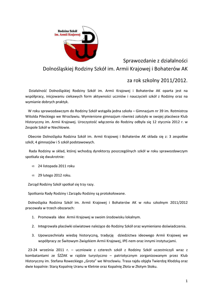 Sprawozdanie z działalności Dolnośląskiej Rodziny Szkół im. Armii Krajowej i Bohaterów AK za rok szkolny 2011/2012. Działalność Dolnośląskiej Rodziny Szkół im. Armii Krajowej i Bohaterów AK oparta jest na współpracy, inicjowaniu ciekawych form aktywności uczniów i nauczycieli szkół z Rodziny oraz na wymianie dobrych praktyk. W roku sprawozdawczym do Rodziny Szkół wstąpiła jedna szkoła – Gimnazjum nr 39 im. Rotmistrza Witolda Pileckiego we Wrocławiu. Wymienione gimnazjum również założyło w swojej placówce Klub Historyczny im. Armii Krajowej. Uroczystość włączenia do Rodziny odbyła się 12 stycznia 2012 r. w Zespole Szkół w Niechlowie. Obecnie Dolnośląska Rodzina Szkół im. Armii Krajowej i Bohaterów AK składa się z: 3 zespołów szkół, 4 gimnazjów i 5 szkół podstawowych. Rada Rodziny w skład, której wchodzą dyrektorzy poszczególnych szkół w roku sprawozdawczym spotkała się dwukrotnie: • 24 listopada 2011 roku • 29 lutego 2012 roku. Zarząd Rodziny Szkół spotkał się trzy razy. Spotkania Rady Rodziny i Zarządu Rodziny są protokołowane. Dolnośląska Rodzina Szkół im. Armii Krajowej i Bohaterów AK w roku szkolnym 2011/2012 pracowała w trzech obszarach: 1. Promowała idee Armii Krajowej w swoim środowisku lokalnym. 2. Integrowała placówki oświatowe należące do Rodziny Szkół oraz wymieniano doświadczenia. 3. Upowszechniała wiedzę historyczną, tradycję dziedzictwa ideowego Armii Krajowej we współpracy ze Świtowym Związkiem Armii Krajowej, IPE-nem oraz innymi instytucjami. 23-24 września 2011 r. – uczniowie z czterech szkół z Rodziny Szkół uczestniczyli wraz z kombatantami ze ŚZŻAK w rajdzie turystyczno – patriotycznym zorganizowanym przez Klub Historyczny im. Stefana Roweckiego „Grota” we Wrocławiu. Trasa rajdu objęła Twierdzę Kłodzką oraz dwie kopalnie: Starą Kopalnię Uranu w Kletnie oraz Kopalnię Złota w Złotym Stoku. 1 Zadaniem organizatorów rajdu było przybliżenie uczestnikom historii tych miejsc, ze szczególnym akcentem na lata czterdzieste i pięćdziesiąte. 24 listopada 2011 r. – współorganizowaliśmy konferencję Dolnośląskich Klubów Historycznych im. Armii Krajowej. Głównym organizatorem Konferencji było Gimnazjum nr 18 we Wrocławiu, które gościło osiem szkół z Rodziny Szkół oraz dyrektorów i nauczycieli tych szkół. Wśród gości zaproszonych była pani Antonina Kużaj – wizytator Kuratorium Oświaty, panowie Józef Oleksiewicz, Tadeusz Gombrych – przedstawiciele ŚZŻAK, pani Joanna Domaszewska, pan Bogdan Zdrojewski – przedstawiciele Zrzeszenia Kombatantów Wolność i Niezawisłość, pan Jacek Grobelny – przedstawiciele WKU we Wrocławiu. W ramach Konferencji można było wysłuchać wykładu pani Sylwii Krzyżanowskiej, pracownika wrocławskiego IPN-u na temat zbiorów IPN-u i sposobu ich przechowywania w pomieszczeniach Instytutu. Uczniowie wykazywali się wiedzą w zorganizowanym dla nich Biegu Patrolowym, którego przewodnim tematem była historia AK, oraz uczyliśmy się hymnu Armii Krajowej. Ponadto byliśmy świadkami nadania pani Joannie Domaszewskiej- żołnierzowi AK, stopnia majora. 12 stycznia 2012 r. – w Niechlowie uczestniczyliśmy w obchodach 20-lecia nadania Szkole Podstawowej im. Armii Krajowej i 10-lecia otrzymania sztandaru. W jubileuszu wzięło udział wielu żołnierzy AK, kombatantów, władz kuratorium oraz gminy. W trakcie spotkania został podsumowany Międzywojewódzki Konkurs Wiedzy o Państwie Podziemnym, w którym wzięło udział 150 uczniów z całego województwa. O Święcie Szkoły można przeczytać na stronie Rodziny Szkół (www.gim2.olesnica.pl/rodzina_ak/ w zakładce „Historia Rodziny-Święto Szkoły w Zespole Szkół w Niechlowie) 10 lutego 2012 r. – sześć szkół z Rodziny Szkół wzięło czynny udział w projekcie – „Noc z filmem historycznym”. Oglądaliśmy cztery filmy o życiu i działalności AK-owców, m.in. „Inka”, „Elżbieta Zawadzka” oraz czytaliśmy książkę o rotmistrzu Witoldzie Pileckim. Ponadto w trakcie trwania nocy łączyliśmy się na wspólnym blogu, rozwiązywaliśmy zadania konkursowe, opracowywaliśmy gazetkę. Nasze nocne działania zakończyły się o szóstej rano. Były to ciekawe przeżycia i z całą pewnością będziemy je kontynuować. 29 lutego 2012 r. – obchodziliśmy jubileusz pięciolecia powstania Rodziny Szkół. Gospodarzami uroczystości był burmistrz miasta Oleśnica Jan Bronś – Patron Założyciel Rodziny oraz dyrektor Gimnazjum nr 2 im. Armii Krajowej Dorota Rasała – Świtoń. Na nasze święto przyjechało wielu gości, m.in. dyrektor Departamentu Orzecznictwa Urzędu ds. Kombatantów i Osób Represjonowanch – pan Jacek Polańczyk, Dolnośląski Wice-Kurator, Patron Założyciel Rodziny – pani Danuta Leśniewska, przedstawiciel Marszałka Województwa Dolnośląskiego – pan Paweł Aszkiełowicz, członek prezydium Zarządu Głównego ŚZŻAK, przewodniczący Komisji ds. Młodzieży – pan Piotr Kurek, Wice-Prezes Zarządu Okręgu Dolnośląskiego ŚZŻAK – pan Ryszard Filipowicz oraz władze miejscowości, z których pochodzą szkoły należące do Rodziny Szkół, AK-owcy, kombatanci, przyjaciele szkół. Ważną częścią uroczystości było wręczenie medali Pro Patria szkołom należącym do Rodziny Szkół oraz ich założycielom. Ponadto wręczone zostały nagrody laureatom konkursów: za najciekawszy kolaż ph. „Ci, dzięki którym żyjemy w wolnej Polsce” oraz za konkurs fotograficzny „Śladami Armii Krajowej. 2 Źródła naszej przeszłości na Dolnym Śląsku”. Na temat naszego Jubileuszu można przeczytać na stronie Rodziny Szkół (www.gim2.olesnica.pl/rodzina_ak/ w zakładce „Historia Rodziny”). 2 marca 2012 r. – Gimnazjum im. AK w Żórawinie i Gimnazjum nr 18 im. AK we Wrocławiu zorganizowało wystawę poświęconą życiu i działalności pani Joanny Domaszewskiej, kobiet
