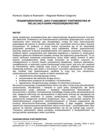 Konkurs: Etyka w finansach – Nagroda Robina Cosgrove TRANSPARENTNOŚĆ JAKO FUNDAMENT PARTNERSTWA W RELACJACH BANK-PRZEDSIĘBIORSTWO WSTĘP Istotą działalności przedsiębiorstwa jest maksymalizacja długoterminowych korzyści dla właścicieli. Postawiony cel funkcjonowania podmiotów gospodarczych może być realizowany tylko wówczas, gdy zarządzający umieją nie tylko wykorzystywać pojawiające się szanse w okresie prosperity, ale i wychodzić obronną ręką z sytuacji kryzysowych. W praktyce, w dużej mierze sprowadza się to do racjonalnej gospodarki posiadaną i potencjalną bazą kapitałową. Wobec ograniczoności zasobów własnych funduszy przedsiębiorstwa, tym większe znaczenie, zwłaszcza w ostatnich latach, przypisywane jest właściwej współpracy z bankami tj. instytucjami będącymi głównymi dostawcami kapitału obcego dla organizacji gospodarczej. To od oceny zdolności kredytowej pożyczkobiorcy przez banki zależy bowiem w jakim stopniu przedsiębiorstwa będą mogły korzystać ze środków czasowo im udostępnianych w różnych fazach prowadzonej działalności. Istotnym elementem, uwzględnianym w estymacji ryzyka kredytowego przez banki, jest przy tym zaufanie do kontrahenta, które znajduje swój wyraz w procesie ustalania wiarygodności kredytowej podmiotu, jako jeden z kluczowych czynników jakościowych. Co istotne, aby możliwe było dyskontowanie zaufania to musi być ono obustronne, systematycznie budowane i oparte na takich zasadach jak1: respektowanie obowiązującego prawa, poszanowanie dla interesów drugiej strony, profesjonalne podejście do kontaktów z kontrahentem, zapewnienie nieograniczonego dostępu do informacji rynkowych. Na poczet powyższego, przedsiębiorstwo winno nie tylko z dużą dozą pieczołowitości opracowywać, aktualizować i wdrażać w życie plany strategiczne, ale także sankcjonować swoje założenia i działania odpowiednimi dokumentami w porozumieniu z bankiem. Konsekwencje wszelkiego rodzaju próby sprzeniewierzenia woli, zatajenia informacji lub wprowadzenia w błąd banku kończą się najczęściej nie tylko bieżącymi sankcjami w postaci podwyższenia marży czy chwilowego ograniczenia dostępności środków kredytowych, lecz i ograniczeniem zaufania do implementowanych programów restrukturyzacyjnych w sytuacji pogorszenia się kondycji ekonomiczno-finansowej przedsiębiorstwa. Z tego względu, niezwykle ważne jest wypracowywanie partnerskich relacji na linii bank – przedsiębiorstwo. Bez oparcia na szeroko zakrojonej transparentności nie da się jednak tego uczynić. Tworzeniu partnerskich relacji pomiędzy kredytodawcami a kredytobiorcami nie sprzyja jednak zaskakująco wiele czynników. OGRANICZENIA PARTNERSTWA 1 Cz. Lipiński, Etyka w bankowości – dylematy pracownika bankowego, „Annales. Etyka w życiu gospodarczym” vol. 11, nr 2, Archidiecezjalne Wydawnictwo Łódzkie, Łódź 2008, s. 87 1 1) DYPLOMACJA JAKO ZAGROŻENIE DLA PRZEJRZYSTOŚCI Pierwszym i głównym utrudnieniem dla opartego na zaufaniu partnerstwa jest pozycja banku w negocjacjach. To bank decyduje bowiem o przyznaniu finansowania, warunkach jego funkcjonowania i ograniczeniach. Na etapie podejmowania decyzji o przyznaniu produktu kredytowego istnieje jeszcze możliwość osiągnięcia pewnego kompromisu, ale i tak o mocno specyficznym charakterze bank przedstawia przecież swoje warunki, a jego klient może wskazać ograniczoną część zapisów nieakceptowalnych. Zawężony krąg wyboru zmienianych klauzul wynika z tego, że modyfikacja większości nie jest w ogóle możliwa z uwagi na ryzyko negatywnej decyzji banku. Dodatkowo, umowy zwierane są często pod widoczną presją czasu, a wszelkie zmiany do nich oznaczają przecież konieczność przygotowania nowego materiału, zebrania kworum decyzyjnego i sporządzenia aktualizacji dokumentacji kredytowej. Kolejny dzień zwłoki w podpisaniu umów determinuje przesunięcia uruchomienia środków kredytowych. Z kolei przedsiębiorstwa działają w silnie turbulentnych warunkach, w których każde opóźnienie przekładać się może na kary umowne nakładane przez kontrahenta, a w skrajnych przypadkach i prowadzić do braku realizacji inwestycji w określonych ramach czasowych (co skutkować może np. utratą dotacji) czy zaprzestania współpracy z dobrym partnerem biznesowym. Przedsiębiorstwa wolą więc nie przeciągać akceptacji oferty bankowej i aprobują zobowiązania, z których bardzo trudno będzie im się w przyszłości wywiązać. Z kolei, podczas monitoringu ekspozycji kredytowej, pola polemiki z kredytodawcą nie ma już prawie żadnego. Rodzi się więc pytanie – czy wobec instytucji mającej lepszą pozycję negocjacyjną można być w pełni transparentnym? W tym miejscu należy zastanowić się nad jakże obecnie powszechnym paradoksem stosowanej sztuki dyplomacji. Głównym przesłaniem dyplomacji dzisiejszych czasów jest racjonalizacja prowadzonej polityki słownej. Bardzo często nadmierne jej praktykowanie stanowi jednak o pogwałceniu wszelakich norm etycznych pomimo, że zarządzający przedsiębiorstwem wychodzą z założenia, że brak ujawnienia pewnych informacji dla banku nie jest wykroczeniem. Naturalnie, zatajanie istotnych informacji nie może być traktowane równoznacznie jak składanie fałszywego świadectwa o pewnych faktach, niemniej wywołuje ten same efekt – kształtuje nieprawdziwe mniemanie pracownika bankowego o faktycznej zdolności kredytowej kredytobiorcy. Przedsiębiorstwa najczęściej zatajają ważne dla oceny kondycji finansowej przedsiębiorstwa informacje tłumacząc się: tajemnicą handlową, brakiem istotności z ich punktu widzenia, przeoczeniem. Nierzadko, dbający o dobro zarządzanego podmiotu gospodarczego, przedstawiciele przedsiębiorstwa jedynie zanurzają w kamuflażu dyplomacji prawdziwe przesłanki. Powszechnie wydaje się, że na etapie podejmowania decyzji kredytowej przez bank szeroko rozumia