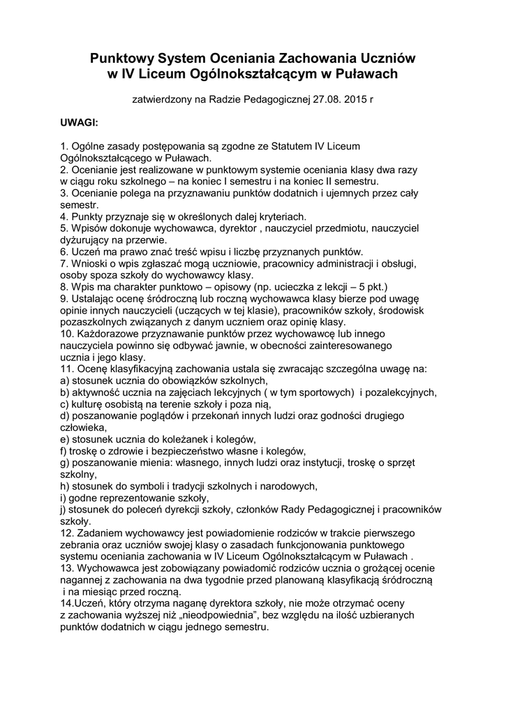 Punktowy System Oceniania Zachowania Uczniów w IV Liceum Ogólnokształcącym w Puławach zatwierdzony na Radzie Pedagogicznej 27.08. 2015 r UWAGI: 1. Ogólne zasady postępowania są zgodne ze Statutem IV Liceum Ogólnokształcącego w Puławach. 2. Ocenianie jest realizowane w punktowym systemie oceniania klasy dwa razy w ciągu roku szkolnego – na koniec I semestru i na koniec II semestru. 3. Ocenianie polega na przyznawaniu punktów dodatnich i ujemnych przez cały semestr. 4. Punkty przyznaje się w określonych dalej kryteriach. 5. Wpisów dokonuje wychowawca, dyrektor , nauczyciel przedmiotu, nauczyciel dyżurujący na przerwie. 6. Uczeń ma prawo znać treść wpisu i liczbę przyznanych punktów. 7. Wnioski o wpis zgłaszać mogą uczniowie, pracownicy administracji i obsługi, osoby spoza szkoły do wychowawcy klasy. 8. Wpis ma charakter punktowo – opisowy (np. ucieczka z lekcji – 5 pkt.) 9. Ustalając ocenę śródroczną lub roczną wychowawca klasy bierze pod uwagę opinie innych nauczycieli (uczących w tej klasie), pracowników szkoły, środowisk pozaszkolnych związanych z danym uczniem oraz opinię klasy. 10. Każdorazowe przyznawanie punktów przez wychowawcę lub innego nauczyciela powinno się odbywać jawnie, w obecności zainteresowanego ucznia i jego klasy. 11. Ocenę klasyfikacyjną zachowania ustala się zwracając szczególna uwagę na: a) stosunek ucznia do obowiązków szkolnych, b) aktywność ucznia na zajęciach lekcyjnych ( w tym sportowych) i pozalekcyjnych, c) kulturę osobistą na terenie szkoły i poza nią, d) poszanowanie poglądów i przekonań innych ludzi oraz godności drugiego człowieka, e) stosunek ucznia do koleżanek i kolegów, f) troskę o zdrowie i bezpieczeństwo własne i kolegów, g) poszanowanie mienia: własnego, innych ludzi oraz instytucji, troskę o sprzęt szkolny, h) stosunek do symboli i tradycji szkolnych i narodowych, i) godne reprezentowanie szkoły, j) stosunek do poleceń dyrekcji szkoły, członków Rady Pedagogicznej i pracowników szkoły. 12. Zadaniem wychowawcy jest powiadomienie rodziców w trakcie pierwszego zebrania oraz uczniów swojej klasy o zasadach funkcjonowania punktowego systemu oceniania zachowania w IV Liceum Ogólnokształcącym w Puławach . 13. Wychowawca jest zobowiązany powiadomić rodziców ucznia o grożącej ocenie nagannej z zachowania na dwa tygodnie przed planowaną klasyfikacją śródroczną i na miesiąc przed roczną. 14.Uczeń, który otrzyma naganę dyrektora szkoły, nie może otrzymać oceny z zachowania wyższej niż „nieodpowiednia”, bez względu na ilość uzbieranych punktów dodatnich w ciągu jednego semestru. 15.Uczeń, który otrzyma naganę wychowawcy klasy, nie może otrzymać oceny zachowania wyższej niż „poprawna”, bez względu na ilość uzbieranych punktów dodatnich w ciągu jednego semestru. TRYB ODWOŁAWCZY 1. Uczeń może przystąpić do procedury odwoławczej, jeśli roczna ocena z zachowania proponowana przez nauczyciela według niego lub jego rodziców (opiekunów prawnych) jest zaniżona. 2. Decyzję o przeprowadzeniu procedury odwoławczej podejmuje dyrektor szkoły. 3. Procedurę odwoławczą przeprowadza się na pisemną prośbę ucznia lub jego rodziców, zgłoszoną do dyrektora szkoły nie później niż na tydzień przed zakończeniem zajęć dydaktycznych, a jego termin ustala dyrektor szkoły najpóźniej w przedostatnim dniu zajęć edukacyjnych. 4. Procedurę odwoławczą przeprowadza komisja powołana przez dyrektora szkoły w składzie: dyrektor lub inna osoba sprawująca funkcję kierowniczą jako przewodniczący, wychowawca klasy ucznia, pedagog lub psycholog, przedstawiciel samorządu klasowego oraz na wniosek rodziców ucznia – przedstawiciel klasowej rady rodziców. 5. Komisja ustala roczną ocenę klasyfikacyjną z zachowania zwykłą większością głosów. 6. Z przeprowadzonej procedury odwoławczej sporządza się protokół zawierający: skład komisji, termin przeprowadzonej procedury, wynik głosowania i stopień ustalony przez komisję. 7. Ocena ustalona w toku procedury odwoławczej nie może być niższa od oceny, która została zaproponowana przez wychowawcę. SZCZEGÓŁOWA PUNKTACJA OCEN ZACHOWANIA 1. Na początku roku szkolnego uczeń otrzymuje 120 punktów, co jest równowartością oceny dobrej z zachowania oraz przyznanego stypendium w postaci: a) dofinansowania opłat za pobyt w bursie szkolnej (50% kosztów pobytu) uczniom mieszkającym w bursie szkolnej, b) sfinansowania kosztów obiadów uczniom nie mieszkającym w bursie szkolnej, c) zwolnienia z opłat czesnego wszystkich uczniów szkoły. 2. Szkoła pozyskuje sponsorów, którzy będą finansowali uczniom IV Liceum Ogólnokształcącego w Puławach koszty pobytu w bursie szkolnej oraz koszty obiadów uczniom nie mieszkającym w bursie szkolnej. 3. Uczniowie IV Liceum Ogólnokształcącego pochodzący z Ukrainy i Białorusi otrzymują dofinansowanie kosztów pobytu w bursie szkolnej w dniach trwania zajęć szkolnych (od poniedziałku do piątku). 4. Dofinansowanie dotyczy uczniów, którzy aktywnie uczestniczą w 10 godzinnym szkoleniu sportowym. 5. W ciągu danego semestru uczeń swoim zachowaniem, ogólnie pojętą kulturą osobistą oraz zaangażowaniem w życie szkoły i klasy itp. przyczynia się do zwiększenia liczby punktów, a tym samym wyższej oceny z zachowania. I tak: 200 punktów i powyżej zachowanie (wzorowe) - przyznanie stypendium sportowego w postaci dwumiesięcznego sfinansowanie opłat za pobyt w bursie szkolnej uczniom mieszkającym w bursie szkolnej oraz dofinansowanie w 50% kosztów letniego obozu sportowego uczniom spoza bursy. 161 – 199 punktów (bardzo dobre) - przyznanie stypendium sportowego w postaci miesięcznego sfinansowania opłat za pobyt w bursie szkolnej uczniom mieszkającym w bursie szkolnej oraz dofinansowanie w 25% kosztów letniego obozu sportowego uczniom spoza bursy szkolnej. 120 - 160 punktów (dobre) - pr