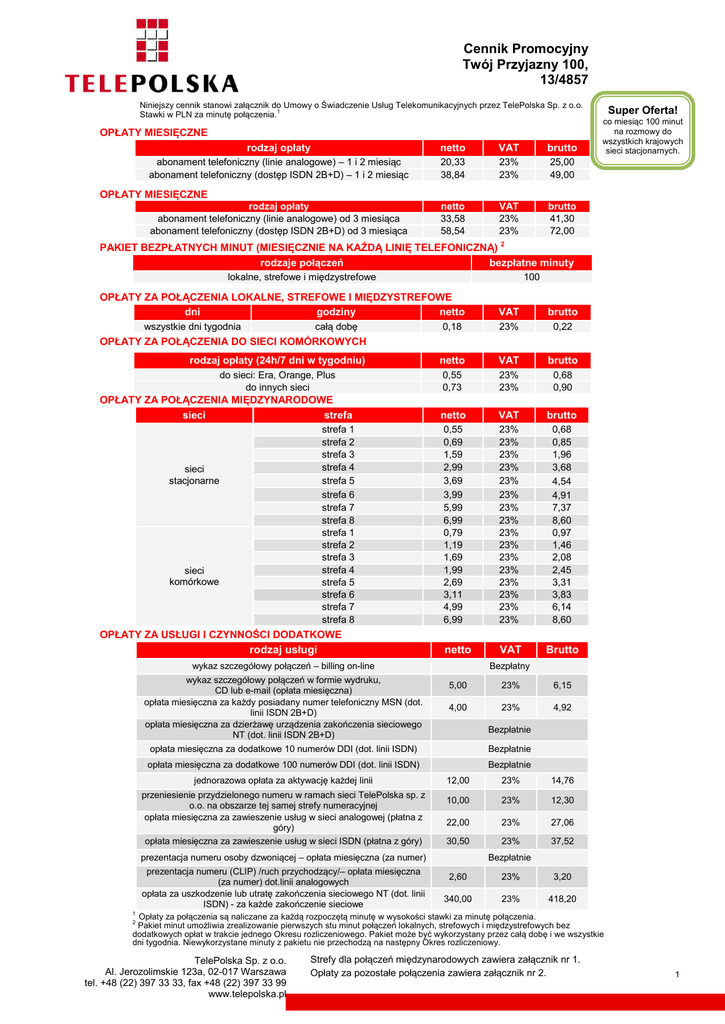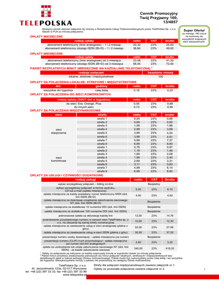 Cennik Promocyjny Twój Przyjazny 100, 13/4857 Niniejszy cennik stanowi załącznik do Umowy o Świadczenie Usług Telekomunikacyjnych przez TelePolska Sp. z o.o. 1 Stawki w PLN za minutę połączenia. OPŁATY MIESIĘCZNE rodzaj opłaty netto VAT brutto abonament telefoniczny (linie analogowe) – 1 i 2 miesiąc abonament telefoniczny (dostęp ISDN 2B+D) – 1 i 2 miesiąc 20,33 38,84 23% 23% 25,00 49,00 netto 33,58 58,54 VAT 23% 23% brutto 41,30 72,00 Super Oferta! co miesiąc 100 minut na rozmowy do wszystkich krajowych sieci stacjonarnych. OPŁATY MIESIĘCZNE rodzaj opłaty abonament telefoniczny (linie analogowe) od 3 miesiąca abonament telefoniczny (dostęp ISDN 2B+D) od 3 miesiąca PAKIET BEZPŁATNYCH MINUT (MIESIĘCZNIE NA KAŻDĄ LINIĘ TELEFONICZNĄ) 2 rodzaje połączeń bezpłatne minuty lokalne, strefowe i międzystrefowe 100 OPŁATY ZA POŁĄCZENIA LOKALNE, STREFOWE I MIĘDZYSTREFOWE dni godziny netto VAT brutto 0,18 23% 0,22 rodzaj opłaty (24h/7 dni w tygodniu) netto VAT brutto do sieci: Era, Orange, Plus do innych sieci 0,55 0,73 23% 23% 0,68 0,90 netto VAT brutto 0,55 0,69 1,59 2,99 3,69 3,99 5,99 6,99 0,79 1,19 1,69 1,99 2,69 3,11 4,99 6,99 23% 23% 23% 23% 23% 23% 23% 23% 23% 23% 23% 23% 23% 23% 23% 23% 0,68 0,85 1,96 3,68 4,54 4,91 7,37 8,60 0,97 1,46 2,08 2,45 3,31 3,83 6,14 8,60 VAT Brutto całą dobę wszystkie dni tygodnia OPŁATY ZA POŁĄCZENIA DO SIECI KOMÓRKOWYCH OPŁATY ZA POŁĄCZENIA MIĘDZYNARODOWE sieci strefa strefa 1 strefa 2 strefa 3 strefa 4 strefa 5 strefa 6 strefa 7 strefa 8 strefa 1 strefa 2 strefa 3 strefa 4 strefa 5 strefa 6 strefa 7 strefa 8 sieci stacjonarne sieci komórkowe OPŁATY ZA USŁUGI I CZYNNOŚCI DODATKOWE rodzaj usługi netto wykaz szczegółowy połączeń – billing on-line wykaz szczegółowy połączeń w formie wydruku, CD lub e-mail (opłata miesięczna) opłata miesięczna za każdy posiadany numer telefoniczny MSN (dot. linii ISDN 2B+D) opłata miesięczna za dzierżawę urządzenia zakończenia sieciowego NT (dot. linii ISDN 2B+D) Bezpłatny 5,00 23% 6,15 4,00 23% 4,92 Bezpłatnie opłata miesięczna za dodatkowe 10 numerów DDI (dot. linii ISDN) Bezpłatnie opłata miesięczna za dodatkowe 100 numerów DDI (dot. linii ISDN) Bezpłatnie jednorazowa opłata za aktywację każdej linii przeniesienie przydzielonego numeru w ramach sieci TelePolska sp. z o.o. na obszarze tej samej strefy numeracyjnej opłata miesięczna za zawieszenie usług w sieci analogowej (płatna z góry) opłata miesięczna za zawieszenie usług w sieci ISDN (płatna z góry) 12,00 23% 14,76 10,00 23% 12,30 22,00 23% 27,06 23% 37,52 30,50 prezentacja numeru osoby dzwoniącej – opłata miesięczna (za numer) prezentacja numeru (CLIP) /ruch przychodzący/– opłata miesięczna (za numer) dot.linii analogowych opłata za uszkodzenie lub utratę zakończenia sieciowego NT (dot. linii ISDN) - za każde zakończenie sieciowe Bezpłatnie 2,60 23% 3,20 340,00 23% 418,20 1 Opłaty za połączenia są naliczane za każdą rozpoczętą minutę w wysokości stawki za minutę połączenia. Pakiet minut umożliwia zrealizowanie pierwszych stu minut połączeń lokalnych, strefowych i międzystrefowych bez dodatkowych opłat w trakcie jednego Okresu rozliczeniowego. Pakiet może być wykorzystany przez całą dobę i we wszystkie dni tygodnia. Niewykorzystane minuty z pakietu nie przechodzą na następny Okres rozliczeniowy. 2 TelePolska Sp. z o.o. Al. Jerozolimskie 123a, 02-017 Warszawa tel. +48 (22) 397 33 33, fax +48 (22) 397 33 99 www.telepolska.pl Strefy dla połączeń międzynarodowych zawiera załącznik nr 1. Opłaty za pozostałe połączenia zawiera załącznik nr 2. 1 Cennik Promocyjny Twój Przyjazny 100, 13/4857 ,,Cennik Promocyjny Twój Przyjazny 100” §1 1. Z Cennika Promocyjnego może skorzystać każdy Abonent, który spełni łącznie poniższe warunki: a) zawrze Umowę o świadczenie usług telekomunikacyjnych na czas określony 24 miesiące lub którego Umowa zawarta na czas określony 24 miesięcy ulegnie przedłużeniu na kolejny czas określony 24 miesięcy. b) jest Konsumentem w rozumieniu § 1 Regulaminu świadczenia usług telekomunikacyjnych przez TelePolska Sp. z o.o. z dnia 13 maja 2013 r. (zwanego dalej „Regulaminem”). 1. Cennik Promocyjny obowiązuje przez cały okres obowiązywania Umowy o świadczenie usług telekomunikacyjnych zawartej na czas określony 24 miesięcy lub przedłużonej o kolejny czas określony 24 miesięcy. Abonent może zawrzeć Umowę, której przedmiotem będzie świadczenie usług telekomunikacyjnych na więcej niż jeden numer telefoniczny. §2 2. §3 1. 2. 3. 4. 5. 6. Począwszy od pierwszego Okresu rozliczeniowego, w którym Operator uruchomi usługę abonamentu telefonicznego Abonent będzie otrzymywał pakiet 100 (stu) minut gratis w każdym Okresie rozliczeniowym na każdą linię telefoniczną włączoną do Cennika Promocyjnego Twój Przyjazny 100. Bezpłatne minuty mogą być wykorzystane na połączenia lokalne, strefowe i międzystrefowe wykonywane w dowolnym czasie, w trakcie jednego Okresu rozliczeniowego. Niewykorzystane bezpłatne minuty nie przechodzą na następny Okres rozliczeniowy. Połączenia w ramach pakietu naliczane są minutowo. Począwszy od dnia rozpoczęcia przez Operatora świadczenia usług, Abonent jest uprawniony do korzystania z promocyjnych opłat za: zrealizowane połączenia, abonament, aktywację linii oraz pozostałe opłaty zgodnie z Cennikiem Promocyjnym Twój Przyjazny 100. Przez pierwsze dwa okresy rozliczeniowe, od momentu uruchomienia usługi abonamentu telefonicznego, Abonent będzie obciążany opłatą za abonament telefoniczny w wysokości 25 zł brutto za każdą linię analogową albo w wysokości 49 zł brutto za każdą linię ISDN 2B+D, określoną w Cenniku Promocyjnym, z zastrzeżeniem, iż pierwszym okresem rozliczeniowym może być niepełny miesiąc kalendarzowy, wówczas opłata abonamentowa ustalana jest w wysokości 1/30 tej opłaty za każd