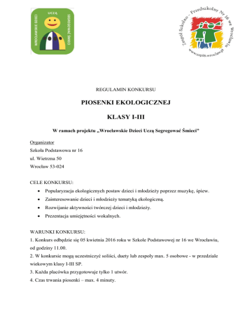 REGULAMIN KONKURSU PIOSENKI EKOLOGICZNEJ KLASY I-III W ramach projektu „Wrocławskie Dzieci Uczą Segregować Śmieci” Organizator Szkoła Podstawowa nr 16 ul. Wietrzna 50 Wrocław 53-024 CELE KONKURSU: Popularyzacja ekologicznych postaw dzieci i młodzieży poprzez muzykę, śpiew. Zainteresowanie dzieci i młodzieży tematyką ekologiczną. Rozwijanie aktywności twórczej dzieci i młodzieży. Prezentacja umiejętności wokalnych. WARUNKI KONKURSU: 1. Konkurs odbędzie się 05 kwietnia 2016 roku w Szkole Podstawowej nr 16 we Wrocławiu, od godziny 11.00. 2. W konkursie mogą uczestniczyć soliści, duety lub zespoły max. 5 osobowe - w przedziale wiekowym klasy I-III SP. 3. Każda placówka przygotowuje tylko 1 utwór. 4. Czas trwania piosenki – max. 4 minuty. 5. Wykonywana piosenka musi dotyczyć tematyki ekologicznej (najlepiej nawiązująca do zagadnień związanych z projektem WDUSŚ). 6. Podkładem muzycznym może być: - nagranie instrumentalne na CD - akompaniament (wykonywany przez uczniów lub nauczyciela) 7. Nagrania podkładu na CD należy opatrzyć imieniem i nazwiskiem (bądź nazwą zespołu), tytułem utworu oraz numerem szkoły. 8. Format nagrania: audio, mp3 9. Każdy uczestnik ma prawo do sprawdzenia nagranego podkładu na CD do godziny przed rozpoczęciem konkursu, (jeżeli nagranie było w innym formacie niż zalecane przez organizatora, a podczas występu nie będzie działało - uczestnicy wykonują piosenkę bez podkładu nagranego na CD). 10. Uczniowie podczas konkursu pozostają pod opieką nauczyciela ze szkoły macierzystej. 11. Organizator zapewnia pianino. KRYTERIA OCENY: 1. Oceny piosenki dokona komisja powołana przez organizatora. 2. Jury ocenić będzie: a) dobór tematyczny repertuaru b) interpretację, walory głosowe c) ogólny wyraz artystyczny d) kreatywność 3. Dodatkowe punkty będą przyznawane za autorski tekst oraz podkład. Zainteresowane placówki prosimy o przesłanie zgłoszenia ( Załącznik nr 1) do 25 marca 2016 roku (liczy się data wpływu zgłoszenia) na adres [email protected] Szczegółowych informacji udziela: Hanna Goldmann-Połom e-mail: [email protected] tel. 693216586 FORMULARZ ZGŁOSZENIOWY (PROSZĘ WYPEŁNIĆ DRUKOWANYMI LITERAMI) Nazwa szkoły ………………………………………………………………….. Adres szkoły ……….…………………………………………………………… .…………………………………………………………………... Telefon ……………………………………………………………………….… E-mail ……………………………………………………………………………. Nazwisko nauczyciela opiekuna ………………………………………………… Nazwiska uczniów – klasa: 1. ……………………………………….……… 2. .………………………………….…….…….. 3. ………………………………….…………… 4. ………………………………………………. 5. …………………………………..…….…….. Rodzaj podkładu muzycznego…………………………………………………... ………………………………….. (pieczęć szkoły) ………………………………….. (podpis dyrektora) ZGODA NA PRZETWARZANIE DANYCH OSOBOWYCH DZIECKA Niniejszym wyrażam zgodę na przetwarzanie przez Szkołę Podstawową nr 16 we Wrocławiu oraz Realizatora Programu „Wrocławskie Dzieci Uczą Segregować Śmieci” danych osobowych mojego dziecka …………………………………………… uczęszczającego do ………………………………………………………………….. wyłącznie na potrzeby (𝑛𝑎𝑧𝑤𝑎 𝑠𝑧𝑘𝑜ł𝑦) konkursu „Piosenki ekologicznej” w zakresie koniecznym do jego prawidłowego przeprowadzenia, zgodnie z ustawą o ochronie danych osobowych z dn. 29 sierpnia 1997 roku Dz.U. nr 133, poz 833 z późn. zmian. …………………………………………………… /podpis rodzica/opiekuna prawnego/ ZGODA NA PRZETWARZANIE DANYCH OSOBOWYCH Niniejszym wyrażam zgodę na przetwarzanie przez Szkołę Podstawową nr 16 we Wrocławiu oraz Realizatora Programu „Wrocławskie Dzieci Uczą Segregować Śmieci” moich danych osobowych wyłącznie na potrzeby konkursu „Piosenki ekologicznej” w zakresie koniecznym do jego prawidłowego przeprowadzenia, zgodnie z ustawą o ochronie danych osobowych z dn. 29 sierpnia 1997 roku Dz.U. nr 133, poz 833 z późn. zmian. …………………………………………………… /podpis uczestnika konkursu/