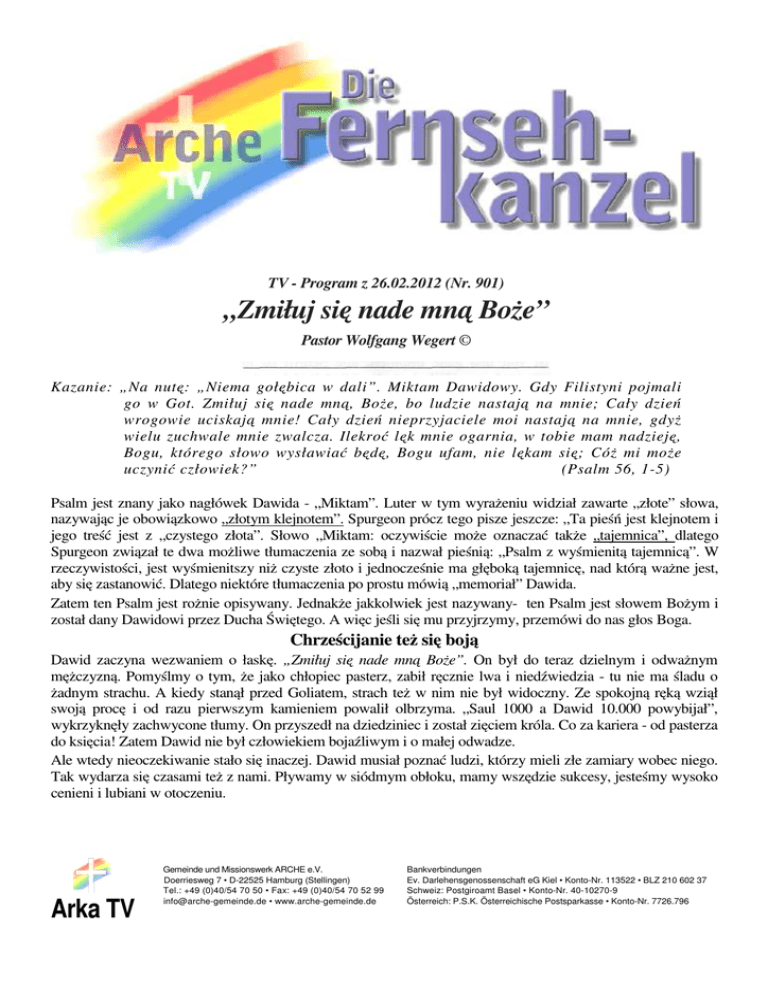 TV - Program z 26.02.2012 (Nr. 901) „Zmiłuj się nade mną Boże” Pastor Wolfgang Wegert © Kazanie: „Na nutę: „Niema gołębica w dali”. Miktam Dawidowy. Gdy Filistyni pojmali go w Got. Zmiłuj się nade mną, Boże, bo ludzie nastają na mnie; Cały dzień wrogowie uciskają mnie! Cały dzień nieprzyjaciele moi nastają na mnie, gdyż wielu zuchwale mnie zwalcza. Ilekroć lęk mnie ogarnia, w tobie mam nadzieję, Bogu, którego słowo wysławiać będę, Bogu ufam, nie lękam się; Cóż mi może uczynić człowiek?” (Psalm 56, 1-5) Psalm jest znany jako nagłówek Dawida - „Miktam”. Luter w tym wyrażeniu widział zawarte „złote” słowa, nazywając je obowiązkowo „złotym klejnotem”. Spurgeon prócz tego pisze jeszcze: „Ta pieśń jest klejnotem i jego treść jest z „czystego złota”. Słowo „Miktam: oczywiście może oznaczać także „tajemnica”, dlatego Spurgeon związał te dwa możliwe tłumaczenia ze sobą i nazwał pieśnią: „Psalm z wyśmienitą tajemnicą”. W rzeczywistości, jest wyśmienitszy niż czyste złoto i jednocześnie ma głęboką tajemnicę, nad którą ważne jest, aby się zastanowić. Dlatego niektóre tłumaczenia po prostu mówią „memoriał” Dawida. Zatem ten Psalm jest rożnie opisywany. Jednakże jakkolwiek jest nazywany- ten Psalm jest słowem Bożym i został dany Dawidowi przez Ducha Świętego. A więc jeśli się mu przyjrzymy, przemówi do nas głos Boga. Chrześcijanie też się boją Dawid zaczyna wezwaniem o łaskę. „Zmiłuj się nade mną Boże”. On był do teraz dzielnym i odważnym mężczyzną. Pomyślmy o tym, że jako chłopiec pasterz, zabił ręcznie lwa i niedźwiedzia - tu nie ma śladu o żadnym strachu. A kiedy stanął przed Goliatem, strach też w nim nie był widoczny. Ze spokojną ręką wziął swoją procę i od razu pierwszym kamieniem powalił olbrzyma. „Saul 1000 a Dawid 10.000 powybijał”, wykrzyknęły zachwycone tłumy. On przyszedł na dziedziniec i został zięciem króla. Co za kariera - od pasterza do księcia! Zatem Dawid nie był człowiekiem bojaźliwym i o małej odwadze. Ale wtedy nieoczekiwanie stało się inaczej. Dawid musiał poznać ludzi, którzy mieli złe zamiary wobec niego. Tak wydarza się czasami też z nami. Pływamy w siódmym obłoku, mamy wszędzie sukcesy, jesteśmy wysoko cenieni i lubiani w otoczeniu. Arka TV Gemeinde und Missionswerk ARCHE e.V. Doerriesweg 7 • D-22525 Hamburg (Stellingen) Tel.: +49 (0)40/54 70 50 • Fax: +49 (0)40/54 70 52 99 [email protected] • www.arche-gemeinde.de Bankverbindungen Ev. Darlehensgenossenschaft eG Kiel • Konto-Nr. 113522 • BLZ 210 602 37 Schweiz: Postgiroamt Basel • Konto-Nr. 40-10270-9 Österreich: P.S.K. Österreichische Postsparkasse • Konto-Nr. 7726.796 Strona 2 - TV-Program 901/ „Zmiłuj się nade mną Boże” Ale uważaj, to może się zmienić bardzo szybko. I ja myślę, że to jest sam Bóg, który się o to zatroszczy, że będzie inaczej. Ponieważ to nie jest zdrowe, gdy drzewa rosną zbyt wysoko do nieba. Dlatego Bóg wycina wysoko wyrosłe pędy i szuka w nas owocu a nie potężnego drzewa. Ponieważ Bóg tak bardzo miłował Dawida, najpierw zatroszczył się o jego karierę, król Sauldotychczas będący zwolennikiem Dawida - stał się zazdrosny o niego i to tak bardzo, że Dawid wołał do Boga: „…ludzie nastają na mnie; cały dzień wrogowie uciskają mnie! Cały dzień nieprzyjaciele moi nastają na mnie, gdyż wielu zuchwale mnie zwalcza” (werset, 2-3). Tak, Saul i jego podwładni nastawali ciągle na jego życie. Nagle był strach, panika, presja w brzuchu, depresja. I stało się jeszcze gorzej. Dawid nie mógł dłużej zatrzymać się we własnym kraju. Uciekł do ziemi Filistynów. Dlatego już na początku Psalmu jest powiedziane: „Przewodnikowi chóru. Na nutę: „Niema gołębica w dali” Miktam Dawidowy. Gdy Filistyni pojmali go w Gat” (werset 1). Jakim miejscem było Gat? To było miejsce, z którego pochodził Goliat. To znaczy, Dawid nie miał więcej miejsca w Izraelu, gdzie mógłby zostać. Musiał dostać się na terytorium wroga i miał nadzieję, że zostanie mu przyznana ochrona. Ale tam też Dawid został rozpoznany, został aresztowany i wywieziony do króla Filistynów. I czytamy dosłownie o Dawidzie: „słowa te zaniepokoiły Dawida i bał się bardzo Achiasza, króla Gat” (1 Samuela 21, 13). Tak, Dawid wpadł w panikę i dlatego zachował się obłąkanie, on bazgrał dookoła bram i pozwolił płynąc ślinie po swojej brodzie. Dawid zrobił to tak przekonywująco, że król wierzył w pomyłkę i uważał go za wariata. Tak pozwolił mu zbiec i Dawid odtąd szukał schronienia w jaskini. Wielki król Dawid uciekał ze strachu do strachu. Był człowiekiem Bożym, był mężczyzną według Bożego serca i miał jednakże strach. Chrześcijanie też mają strach. Oni też się boją, podejmowania błędnych decyzji, być poważnie chorymi lub nie mieć wystarczającej opieki w starości. Chrześcijanie też żyją w świecie, którego nie mogą kontrolować. Nie wiedzą, co będzie jutro. To też sprawia im niepokój. Również tracą przyjaciół, nawet najbliższych krewnych, którzy stają się ich wrogami. Nie układa się im inaczej niż Dawidowi. Decydująca różnica Ale decydująca różnica z niewierzącym jest ta: Chrześcijanie mają swego Boga. Wśród paniki często zapominamy o Nim i tracimy nasze wsparcie. Ale u Dawida czytamy, że wciąż w pełnym strapieniu wołał: „Cały dzień nieprzyjaciele moi nastają na mnie, gdyż wielu zuchwale mnie zwalcza” (werset 3). A potem następują te słowa: „ Ilekroć lęk mnie ogarnia, w tobie mam nadzieję!” (werset 4). A więc Dawid mówi, jakby chciał powiedzieć: Strachu nie mogę uniknąć, strapienie i cierpienie istnieje. Ale ja nie muszę i nie chcę się temu poddać, ale mam odpowiedź na moją bojaźliwość - a ona brzmi: „ Ilekroć lęk mnie ogarnia