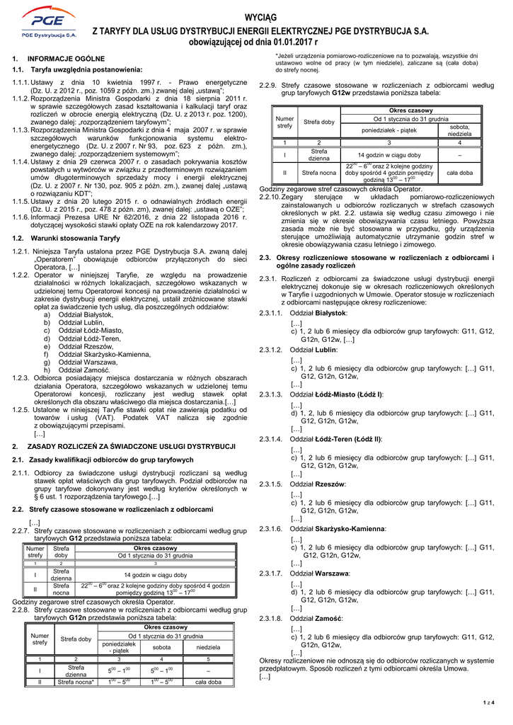 WYCIĄG Z TARYFY DLA USŁUG DYSTRYBUCJI ENERGII ELEKTRYCZNEJ PGE DYSTRYBUCJA S.A. obowiązującej od dnia 01.01.2017 r 1. 1.1. *Jeżeli urządzenia pomiarowo-rozliczeniowe na to pozwalają, wszystkie dni ustawowo wolne od pracy (w tym niedziele), zaliczane są (cała doba) do strefy nocnej. INFORMACJE OGÓLNE Taryfa uwzględnia postanowienia: 1.1.1. Ustawy z dnia 10 kwietnia 1997 r. - Prawo energetyczne (Dz. U. z 2012 r., poz. 1059 z późn. zm.) zwanej dalej „ustawą”; 1.1.2. Rozporządzenia Ministra Gospodarki z dnia 18 sierpnia 2011 r. w sprawie szczegółowych zasad kształtowania i kalkulacji taryf oraz rozliczeń w obrocie energią elektryczną (Dz. U. z 2013 r. poz. 1200), zwanego dalej: „rozporządzeniem taryfowym”; 1.1.3. Rozporządzenia Ministra Gospodarki z dnia 4 maja 2007 r. w sprawie szczegółowych warunków funkcjonowania systemu elektroenergetycznego (Dz. U. z 2007 r. Nr 93, poz. 623 z późn. zm.), zwanego dalej: „rozporządzeniem systemowym”; 1.1.4. Ustawy z dnia 29 czerwca 2007 r. o zasadach pokrywania kosztów powstałych u wytwórców w związku z przedterminowym rozwiązaniem umów długoterminowych sprzedaży mocy i energii elektrycznej (Dz. U. z 2007 r. Nr 130, poz. 905 z późn. zm.), zwanej dalej „ustawą o rozwiązaniu KDT”; 1.1.5. Ustawy z dnia 20 lutego 2015 r. o odnawialnych źródłach energii (Dz. U. z 2015 r., poz. 478 z późn. zm), zwanej dalej: „ustawą o OZE”; 1.1.6. Informacji Prezesa URE Nr 62/2016, z dnia 22 listopada 2016 r. dotyczącej wysokości stawki opłaty OZE na rok kalendarzowy 2017. 1.2. Warunki stosowania Taryfy 1.2.1. Niniejsza Taryfa ustalona przez PGE Dystrybucja S.A. zwaną dalej „Operatorem” obowiązuje odbiorców przyłączonych do sieci Operatora, […] 1.2.2. Operator w niniejszej Taryfie, ze względu na prowadzenie działalności w różnych lokalizacjach, szczegółowo wskazanych w udzielonej temu Operatorowi koncesji na prowadzenie działalności w zakresie dystrybucji energii elektrycznej, ustalił zróżnicowane stawki opłat za świadczenie tych usług, dla poszczególnych oddziałów: a) Oddział Białystok, b) Oddział Lublin, c) Oddział Łódź-Miasto, d) Oddział Łódź-Teren, e) Oddział Rzeszów, f) Oddział Skarżysko-Kamienna, g) Oddział Warszawa, h) Oddział Zamość. 1.2.3. Odbiorca posiadający miejsca dostarczania w różnych obszarach działania Operatora, szczegółowo wskazanych w udzielonej temu Operatorowi koncesji, rozliczany jest według stawek opłat określonych dla obszaru właściwego dla miejsca dostarczania.[…] 1.2.5. Ustalone w niniejszej Taryfie stawki opłat nie zawierają podatku od towarów i usług (VAT). Podatek VAT nalicza się zgodnie z obowiązującymi przepisami. […] 2. ZASADY ROZLICZEŃ ZA ŚWIADCZONE USŁUGI DYSTRYBUCJI 2.2.9. Strefy czasowe stosowane w rozliczeniach z odbiorcami według grup taryfowych G12w przedstawia poniższa tabela: Numer strefy 1 I II Numer strefy 1 2 II 14 godzin w ciągu doby 2.3.1.1. Numer strefy 1 I II Strefa doby Okres czasowy Od 1 stycznia do 31 grudnia poniedziałek sobota niedziela - piątek 2 Strefa dzienna Strefa nocna* 3 00 4 00 00 5 00 5 –1 5 –1 100 – 500 100 – 500 – cała doba – Strefa nocna 00 22 – 6 oraz 2 kolejne godziny doby spośród 4 godzin pomiędzy 00 00 godziną 13 – 17 cała doba Oddział Białystok: […] c) 1, 2 lub 6 miesięcy dla odbiorców grup taryfowych: G11, G12, G12n, G12w, […] 2.3.1.2. Oddział Lublin: […] c) 1, 2 lub 6 miesięcy dla odbiorców grup taryfowych: […] G11, G12, G12n, G12w, […] 2.3.1.3. Oddział Łódź-Miasto (Łódź I): 2.3.1.4. […] d) 1, 2, lub 6 miesięcy dla odbiorców grup taryfowych: […] G11, G12, G12n, G12w, […] Oddział Łódź-Teren (Łódź II): […] c) 1, 2 lub 6 miesięcy dla odbiorców grup taryfowych: […] G11, G12, G12n, G12w, […] 2.3.1.5. Oddział Rzeszów: […] c) 1, 2 lub 6 miesięcy dla odbiorców grup taryfowych: […] G11, G12, G12n, G12w, […] 2.3.1.6. Oddział Skarżysko-Kamienna: 2.3.1.7. […] c) 1, 2 lub 6 miesięcy dla odbiorców grup taryfowych: […] G11, G12, G12n, G12w, […] Oddział Warszawa: 2.3.1.8. […] d) 1, 2 lub 6 miesięcy dla odbiorców grup taryfowych: […] G11, G12, G12n, G12w, […] Oddział Zamość: 2200 – 600 oraz 2 kolejne godziny doby spośród 4 godzin pomiędzy godziną 1300 – 1700 Godziny zegarowe stref czasowych określa Operator. 2.2.8. Strefy czasowe stosowane w rozliczeniach z odbiorcami według grup taryfowych G12n przedstawia poniższa tabela: 14 godzin w ciągu doby 2.3.1. Rozliczeń z odbiorcami za świadczone usługi dystrybucji energii elektrycznej dokonuje się w okresach rozliczeniowych określonych w Taryfie i uzgodnionych w Umowie. Operator stosuje w rozliczeniach z odbiorcami następujące okresy rozliczeniowe: 3 Strefa dzienna Strefa nocna I 2 Strefa dzienna 2.3. Okresy rozliczeniowe stosowane w rozliczeniach z odbiorcami i ogólne zasady rozliczeń Okres czasowy Od 1 stycznia do 31 grudnia Strefa doby 3 sobota, niedziela 4 poniedziałek - piątek Godziny zegarowe stref czasowych określa Operator. 2.2.10. Zegary sterujące w układach pomiarowo-rozliczeniowych zainstalowanych u odbiorców rozliczanych w strefach czasowych określonych w pkt. 2.2. ustawia się według czasu zimowego i nie zmienia się w okresie obowiązywania czasu letniego. Powyższa zasada może nie być stosowana w przypadku, gdy urządzenia sterujące umożliwiają automatycznie utrzymanie godzin stref w okresie obowiązywania czasu letniego i zimowego. 2.2. Strefy czasowe stosowane w rozliczeniach z odbiorcami […] 2.2.7. Strefy czasowe stosowane w rozliczeniach z odbiorcami według grup taryfowych G12 przedstawia poniższa tabela: Strefa doby 00 2.1. Zasady kwalifikacji odbiorców do grup taryfowych 2.1.1. Odbiorcy za świadczone usługi dystrybucji rozliczani są według stawek opłat właściwych dla grup taryfowych. Podział odbiorców na grupy taryfowe dokonywany jest według kryteriów określonych