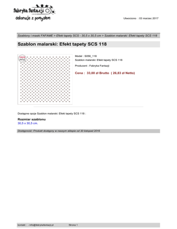 Utworzono : 03 marzec 2017 Szablony i maski FAFAME > Efekt tapety SCS - 30,5 x 30,5 cm > Szablon malarski: Efekt tapety SCS 118 Szablon malarski: Efekt tapety SCS 118 Model : S056_118 Szablon malarski: Efekt tapety SCS 118 Producent : Fabryka Fantazji Cena : 33,00 zł Brutto ( 26,83 zł Netto) Dostępne opcje Szablon malarski: Efekt tapety SCS 118 : Rozmiar szablonu 30,5 x 30,5 cm. Dostępność: Produkt dostępny w naszym sklepie od 30 listopad 2016 kontakt : - [email protected] Strona 1