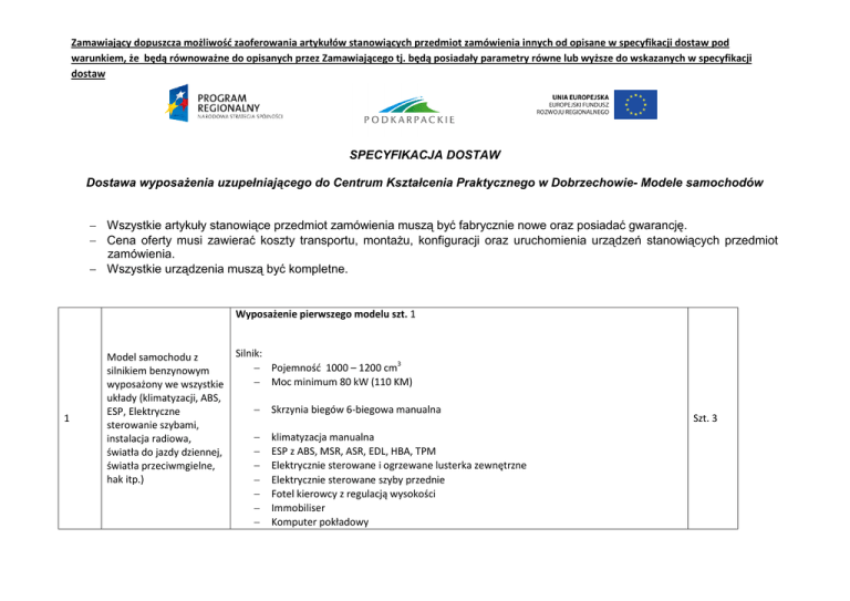 Zamawiający dopuszcza możliwość zaoferowania artykułów stanowiących przedmiot zamówienia innych od opisane w specyfikacji dostaw pod warunkiem, że będą równoważne do opisanych przez Zamawiającego tj. będą posiadały parametry równe lub wyższe do wskazanych w specyfikacji dostaw SPECYFIKACJA DOSTAW Dostawa wyposaŜenia uzupełniającego do Centrum Kształcenia Praktycznego w Dobrzechowie- Modele samochodów − Wszystkie artykuły stanowiące przedmiot zamówienia muszą być fabrycznie nowe oraz posiadać gwarancję. − Cena oferty musi zawierać koszty transportu, montaŜu, konfiguracji oraz uruchomienia urządzeń stanowiących przedmiot zamówienia. − Wszystkie urządzenia muszą być kompletne. Wyposażenie pierwszego modelu szt. 1 1 Model samochodu z silnikiem benzynowym wyposażony we wszystkie układy (klimatyzacji, ABS, ESP, Elektryczne sterowanie szybami, instalacja radiowa, światła do jazdy dziennej, światła przeciwmgielne, hak itp.) Silnik: − Pojemność 1000 – 1200 cm3 − Moc minimum 80 kW (110 KM) − Skrzynia biegów 6-biegowa manualna − − − − − − − klimatyzacja manualna ESP z ABS, MSR, ASR, EDL, HBA, TPM Elektrycznie sterowane i ogrzewane lusterka zewnętrzne Elektrycznie sterowane szyby przednie Fotel kierowcy z regulacją wysokości Immobiliser Komputer pokładowy Szt. 3 Zamawiający dopuszcza możliwość zaoferowania artykułów stanowiących przedmiot zamówienia innych od opisane w specyfikacji dostaw pod warunkiem, że będą równoważne do opisanych przez Zamawiającego tj. będą posiadały parametry równe lub wyższe do wskazanych w specyfikacji dostaw − Konsola centralna z gniazdkiem 12V − Kurtyny powietrzne − Ogranicznik prędkości − Osłony przeciwsłoneczne kierowcy i pasażera z lusterkiem − Poduszki powietrzne czołowe i boczne kierowcy i pasażera z przodu − Przednie światła przeciwmgielne − Przednie zagłówki z regulacją wysokości − Przyciemniane szyby − Radio (kolorowy ekran dotykowy, AM/FM, RDS FM, wejście SD, USB, AUX-in) − Reflektory halogenowe − Siedzisko tylnej kanapy niedzielone, oparcie składane i dzielone − Światła do jazdy dziennej − System kontroli ciśnienia w oponach − Trzy trzypunktowe pasy bezpieczeństwa z tyłu − Trzy tylne zagłówki z regulacją wysokości − Wycieraczka tylnej szyby − Wycieraczki przedniej szyby z regulacją częstotliwości pracy − Zdalnie sterowany centralny zamek (2 składane kluczyki) Wnętrze − Oświetlenie części pasażerskiej z przodu i z tyłu − Trójramienna kierownica z tworzywa sztucznego z elementami chromowanymi Nadwozie − Lusterka i klamki zewnętrzne lakierowane w kolorze nadwozia − Stalowe obręcze kół z osłonami 6Jx15" - (4 szt.) wyposażenie dodatkowe • opony zimowe i letnie 16”, felgi aluminiowe 16” hak holowniczy. • Obręcze kół ze stopów lekkich 6Jx15" • Czujniki parkowania z tyłu oraz czujnik zmierzchu • Koło zapasowe stalowe pełnowymiarowe. Zamawiający dopuszcza możliwość zaoferowania artykułów stanowiących przedmiot zamówienia innych od opisane w specyfikacji dostaw pod warunkiem, że będą równoważne do opisanych przez Zamawiającego tj. będą posiadały parametry równe lub wyższe do wskazanych w specyfikacji dostaw Wyposażenie pozostałych dwóch modeli. Silnik − Pojemność: 1000-1200 cm3 − Moc minimum 65 kW (90 KM) Skrzynia biegów - 5-biegowa manualna − − − − − − − − − − − − − − − − − − − − − − 5 zagłówków regulowanych na wysokość klimatyzacja manualna Dezaktywacja czołowej poduszki powietrznej pasażera z przodu Dwie siatki na bokach oparć foteli przednich ESP z ABS, MSR, ASR, EDL, HBA Elektromechaniczne wspomaganie kierownicy Elektrycznie sterowane i ogrzewane lusterka zewnętrzne Elektrycznie sterowane szyby przednie Fotel kierowcy z regulacją wysokości Funkcja Start-Stop i odzyskiwania energii Immobiliser Jednotonowy sygnał dźwiękowy Kierunkowskazy zintegrowane z lusterkami bocznymi Komputer pokładowy Konsola centralna z gniazdkiem 12V Kurtyny powietrzne hamulec antykolozyjny Ogranicznik prędkości Ogrzewana szyba tylna Osłony przeciwsłoneczne kierowcy i pasażera z lusterkiem Podpowiedź zmiany biegu Poduszki powietrzne czołowe i boczne kierowcy i pasażera z przodu Zamawiający dopuszcza możliwość zaoferowania artykułów stanowiących przedmiot zamówienia innych od opisane w specyfikacji dostaw pod warunkiem, że będą równoważne do opisanych przez Zamawiającego tj. będą posiadały parametry równe lub wyższe do wskazanych w specyfikacji dostaw − − − − − − − − − − − − − − − − − − Przednie światła przeciwmgielne Przegroda wnęki nadkola - z lewej strony Przyciemniane szyby Radio (kolorowy ekran dotykowy AM/FM, RDS FM, wejście SD, USB, AUX-in) Reflektory halogenowe Regulowana w dwóch płaszczyznach kolumna kierownicy Siedzisko tylnej kanapy niedzielone, oparcie składane i dzielone Światła do jazdy dziennej system kontroli ciśnienia w oponach Trzecie światło stopu Trzy trzypunktowe pasy bezpieczeństwa z tyłu Trzypunktowe przednie pasy bezpieczeństwa z regulacją wysokości mocowania oraz z pirotechnicznymi napinaczami pasów przednich Tylne światło przeciwmgielne Wycieraczka tylnej szyby Wycieraczki przedniej szyby z regulacją częstotliwości pracy XDS + elektroniczna blokada mechanizmu różnicowego Zdalnie sterowany centralny zamek (2 składane kluczyki) Zestaw naprawczy do kół Wyposażenie dodatkowe: Trójramienna kierownica z tworzywa sztucznego z elementami chromowanymi Stalowe obręcze kół z osłonami 6Jx15" z oponami zimowymi Zapasowe koło stalowe pełnowymiarowe Obręcze kół ze stopów lekkich z oponami letnimi 6Jx15" Czujniki parkowania z tyłu, - czujnik zmierzchu, Hak holowniczy