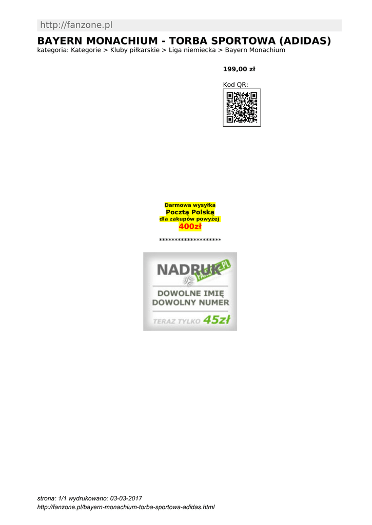 http://fanzone.pl BAYERN MONACHIUM - TORBA SPORTOWA (ADIDAS) kategoria: Kategorie > Kluby piłkarskie > Liga niemiecka > Bayern Monachium 199,00 zł Kod QR: Darmowa wysyłka Pocztą Polską dla zakupów powyżej 400zł ******************** strona: 1/1 wydrukowano: 03-03-2017 http://fanzone.pl/bayern-monachium-torba-sportowa-adidas.html