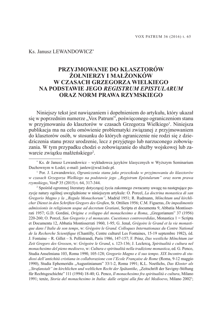 V O X PAT R U M 3 6 ( 2 0 1 6 ) t . 6 5 Ks. Janusz LEWANDOWICZ* PRZYJMOWANIE DO KLASZTORÓW ŻOŁNIERZY I MAŁŻONKÓW W CZASACH GRZEGORZA WIELKIEGO NA PODSTAWIE JEGO REGISTRUM EPISTULARUM ORAZ NORM PRAWA RZYMSKIEGO Niniejszy tekst jest nawiązaniem i dopełnieniem do artykułu, który ukazał się w poprzednim numerze „Vox Patrum”, poświęconego ograniczeniom stanu w przyjmowaniu do klasztorów w czasach Grzegorza Wielkiego1. Niniejsza publikacja ma na celu omówienie problematyki związanej z przyjmowaniem do klasztorów osób, w stosunku do których ograniczenie nie rodzi się z dziedziczenia stanu przez urodzenie, lecz z przyjętego lub narzuconego zobowiązania. W tym przypadku chodzi o zobowiązanie do służby wojskowej lub zawarcie związku małżeńskiego2. * Ks. dr Janusz Lewandowicz – wykładowca języków klasycznych w Wyższym Seminarium Duchownym w Łodzi; e-mail: [email protected]. 1 Por. J. Lewandowicz, Ograniczenia stanu jako przeszkoda w przyjmowaniu do klasztorów w czasach Grzegorza Wielkiego na podstawie jego „Registrum Epistularum” oraz norm prawa rzymskiego, VoxP 35 (2015) t. 64, 317-344. 2 Spośród ogromnej literatury dotyczącej życia zakonnego zwracamy uwagę na następujące pozycje natury ogólnej uwzględnione w niniejszym artykule: O. Porcel, La doctrina monastica di san Gregorio Magno y la „Regula Monachorum”, Madrid 1951; R. Rudmann, Mönchtum und kirchlicher Dienst in den Schriften Gregors des Großen, St. Ottilien 1956; C.M. Figueras, De impedimentis admissionis in religionem usque ad decretum Gratiani, Scripta et documenta 9, Abbatia Montisserrati 1957; G.D. Gordini, Origine e sviluppo del monachesimo a Roma, „Gregorianum” 37 (1956) 220-260; O. Porcel, San Gregorio y el monacato. Cuestiones controverdidas, Monastica 1 = Scripta et Documenta 12, Abbatia Montisserrati 1960, 1-95; G. Jenal, Grégoire le Grand et la vie monastique dans l’Italie de son temps, w: Grégoire le Grand. Colloques Internationaux du Centre National de la Recherche Scientifique (Chantilly, Centre culturel Les Fontaines, 15-19 septembre 1982), éd. J. Fontaine – R. Gillet – S. Pellistrandi, Paris 1986, 147-157; F. Prinz, Das westliche Mönchtum zur Zeit Gregors des Grossen, w: Grégoire le Grand, s. 123-136; J. Leclercq, Spiritualità e cultura nel monachesimo del pieno medioevo, w: Cultura e spiritualità nella tradizione monastica, ed. G. Penco, Studia Anselmiana 103, Roma 1990, 105-128; Gregorio Magno e il suo tempo. XIX Incontro di studiosi dell’antichità cristiana in collaborazione con l’Ecole Française de Rome (Roma, 9-12 maggio 1990), Studia Ephemeridis „Augustinianum” 33/1-2, Roma 1991; K.L. Noetlichs, Das Kloster als „Strafanstalt” im kirchlichen und weltlichen Recht der Spätantike, „Zeitschrift der Savigny-Stiftung für Rechtsgeschichte” 111 (1994) 18-40; G. Penco, Il monachesimo fra spiritualità e cultura, Milano 1991; tenże, Storia del monachesimo in Italia: dalle origini alla fine del Medioevo, Milano 20023; 374 KS. JANUSZ LEWANDOWICZ 1. Żołnierze. Za pontyfikatu Grzegorza Wielkiego przeszkody podobne do wynikających z ograniczeń stanu zaczęły obowiązywać pełniących służbę wojskową. Czas jej trwania wynosił przynajmniej 25 lat, a w niektórych przypadkach nawet 40. Każdy, kto złożył przysięgę, mógł opuścić szeregi wojska dopiero po odbyciu służby. Początkowo żołnierze mieli swobodę w wyborze życia zakonnego. Informację o tym znajdujemy w liście do cesarza napisanym przez Grzegorza w sierpniu 593 r. Jest on reakcją na wprowadzone rok wcześniej przez Maurycjusza prawo3 zabraniające przyjmowania do klasztorów osób noszących znak na ręce (manu signati), czyli żołnierzy4. Celem prawa było przeszkodzenie w unikaniu służby wojskowej przez żołnierzy, którzy według ustawodawcy mogli wstępować do klasztoru z nieszczerych pobudek, tzn. nie z motywów wiary, lecz z chęci ucieczki przed zobowiązaniem do służby. Zgodnie z wymogiem imperatora żołnierz, który pragnął zostać mnichem, musiał mieć uregulowany stosunek do służby wojskowej. Jeśli był do niej zobowiązany, musiał najpierw ją odsłużyć, potem mógł starać się o przyjęcie do klasztoru, o ile nie został zwolniony wcześniej na skutek słabości fizycznej5. Wywołało to negatywną odpowiedź papieża. Uznał on, że zmiana prawa, które dotychczas na to pozwalało6, jest krzywdząca dla życia Kościoła. Grzegorz miał świadomość, że mogły się zdarzać przypadki nieszczerych intencji. Uważał jednak, iż nie można wskutek tego poświęcać ludzi prawdziwie się nawracających. I choć uznawał zasadność ograniczeń w przypadku G. Jenal, In cerca di ordine quando l’apocalisse sembra vicina: Gregorio Magno e il monachesimo del suo tempo in Italia, w: Gregorio Magno nel XIV centenario della morte. Convegno internazionale (Roma, 22-25 ottobre 2003), Atti dei Convegni Lincei 209, Roma 2004, 221-246; P. Pellegrini, Militia clericatus monachici ordines: istituzioni ecclesiastiche e società in Gregorio Magno, Testi e studi di storia antica 20, Catania 20082; B. Müller, Gregory the Great and Monasticism, w: A Companion to Gregory the Great, ed. B. Neil – M. Dal Santo, Leiden 2013, 83-108. 3 List III 61 (ed. D. Norberg, CCL 140, Turnholti 1982, 209), który o nim wzmiankuje, a następnie list VIII 10 (ed. D. Norberg, CCL 140A, Turnholti 1982, 527-528), przekazujący metropolitom treść tego prawa do zastosowania, nie zawierają daty promulgacji, której nie można ustalić inaczej jak z porównania treści listów Grzegorza, gdyż nigdzie indziej informacji o tym prawie Maurycjusza nie ma. W liście do Teodora, lekarza cesarskiego, papież pisze o cesarzu: „transacto anno talem in republica sua legem protulit” (Epistula III 64, CCL 140, 214). Zważywszy, że list datowany jest na sierpień 593 r. można ustalić, że prawo to wydane zostało przez Maurycjusza w roku 592. Poza Grzegorzem nie zac