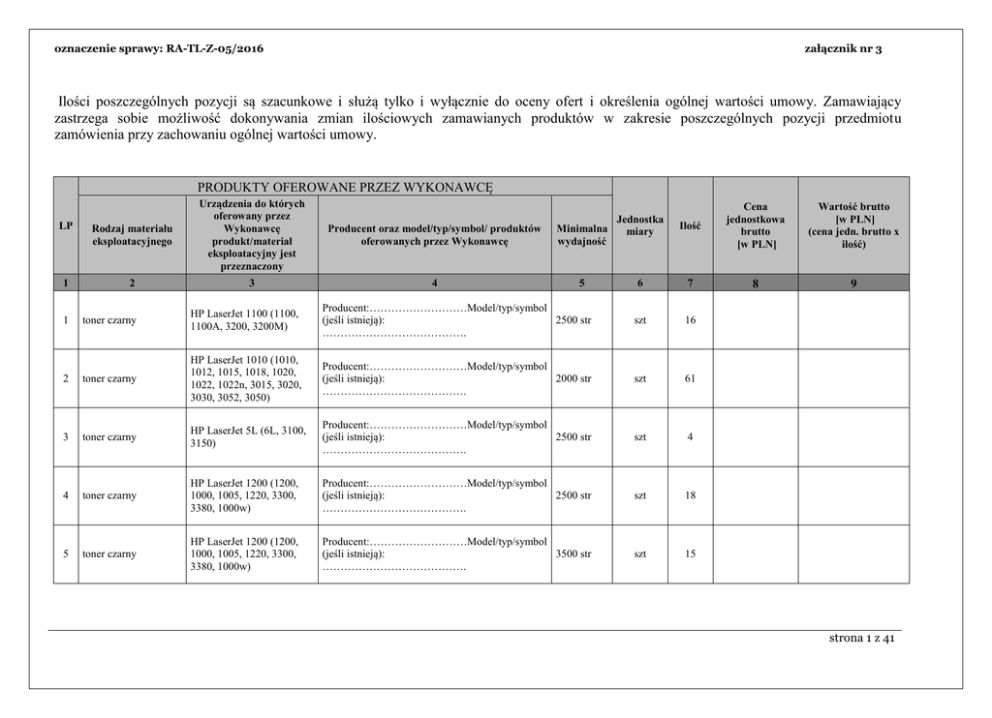 oznaczenie sprawy: RA-TL-Z-05/2016 załącznik nr 3 Ilości poszczególnych pozycji są szacunkowe i służą tylko i wyłącznie do oceny ofert i określenia ogólnej wartości umowy. Zamawiający zastrzega sobie możliwość dokonywania zmian ilościowych zamawianych produktów w zakresie poszczególnych pozycji przedmiotu zamówienia przy zachowaniu ogólnej wartości umowy. PRODUKTY OFEROWANE PRZEZ WYKONAWCĘ LP Rodzaj materiału eksploatacyjnego Urządzenia do których oferowany przez Wykonawcę produkt/materiał eksploatacyjny jest przeznaczony 1 2 3 1 toner czarny HP LaserJet 1100 (1100, 1100A, 3200, 3200M) Producent:………………………Model/typ/symbol (jeśli istnieją): 2500 str …………………………………. szt 16 2 toner czarny HP LaserJet 1010 (1010, 1012, 1015, 1018, 1020, 1022, 1022n, 3015, 3020, 3030, 3052, 3050) Producent:………………………Model/typ/symbol (jeśli istnieją): 2000 str …………………………………. szt 61 3 toner czarny HP LaserJet 5L (6L, 3100, 3150) Producent:………………………Model/typ/symbol (jeśli istnieją): 2500 str …………………………………. szt 4 4 toner czarny HP LaserJet 1200 (1200, 1000, 1005, 1220, 3300, 3380, 1000w) Producent:………………………Model/typ/symbol (jeśli istnieją): 2500 str …………………………………. szt 18 5 toner czarny HP LaserJet 1200 (1200, 1000, 1005, 1220, 3300, 3380, 1000w) Producent:………………………Model/typ/symbol (jeśli istnieją): 3500 str …………………………………. szt 15 Producent oraz model/typ/symbol/ produktów oferowanych przez Wykonawcę 4 Ilość Cena jednostkowa brutto [w PLN] Wartość brutto [w PLN] (cena jedn. brutto x ilość) 6 7 8 9 Jednostka Minimalna miary wydajność 5 strona 1 z 41 oznaczenie sprawy: RA-TL-Z-05/2016 załącznik nr 3 6 toner czarny HP LaserJet 2200 (2100, 2200) Producent:………………………Model/typ/symbol (jeśli istnieją): 5000 str …………………………………. szt 22 7 toner czarny HP LaserJet P2055dn Producent:………………………Model/typ/symbol (jeśli istnieją): 2300 str …………………………………. szt 13 8 toner czarny HP LaserJet P2055dn Producent:………………………Model/typ/symbol (jeśli istnieją): 6500 str …………………………………. szt 19 9 toner czarny HP LaserJet 2300dtn Producent:………………………Model/typ/symbol (jeśli istnieją): 6000 str …………………………………. szt 12 10 toner czarny HP Color LaserJet CP2025, CM2320 Producent:………………………Model/typ/symbol (jeśli istnieją): 3500 str …………………………………. szt 15 11 toner niebieski HP Color LaserJet CP2025, CM2320 Producent:………………………Model/typ/symbol (jeśli istnieją): 2800 str …………………………………. szt 15 12 toner żółty HP Color LaserJet CP2025, CM2320 Producent:………………………Model/typ/symbol (jeśli istnieją): 2800 str …………………………………. szt 14 13 toner czerwony HP Color LaserJet CP2025, CM2320 Producent:………………………Model/typ/symbol (jeśli istnieją): 2800 str …………………………………. szt 14 14 toner czarny HP LaserJet P2015dn, 2014, M2727nfs Producent:………………………Model/typ/symbol (jeśli istnieją): 3000 str …………………………………. szt 11 strona 2 z 41 oznaczenie sprawy: RA-TL-Z-05/2016 załącznik nr 3 15 toner czarny HP LaserJet P2015dn, 2014, M2727nfs Producent:………………………Model/typ/symbol (jeśli istnieją): 7000 str …………………………………. szt 9 16 toner czarny HP LaserJet CM1415MFP, CP 1525nw Producent:………………………Model/typ/symbol (jeśli istnieją): 2000 str …………………………………. szt 18 17 toner niebieski HP LaserJet CM1415MFP, CP 1525nw Producent:………………………Model/typ/symbol (jeśli istnieją): 1300 str …………………………………. szt 18 18 toner żółty HP LaserJet CM1415MFP, CP 1525nw Producent:………………………Model/typ/symbol (jeśli istnieją): 1300 str …………………………………. szt 18 19 toner czerwony HP LaserJet CM1415MFP, CP 1525nw Producent:………………………Model/typ/symbol (jeśli istnieją): 1300 str …………………………………. szt 13 20 toner czarny HP LaserJet Pro 400 Producent:………………………Model/typ/symbol M425DW Duplex WiFi (jeśli istnieją): 2700 str CF2888A, Pro 400 M401dn …………………………………. szt 26 21 toner czarny HP LaserJet Pro 400 Producent:………………………Model/typ/symbol M425DW Duplex WiFi (jeśli istnieją): 6900 str CF2888A, Pro 400 M401dn …………………………………. szt 4 22 toner czarny HP LaserJet 1300 Producent:………………………Model/typ/symbol (jeśli istnieją): 2500 str …………………………………. szt 1 23 toner czarny HP LaserJet 1300 Producent:………………………Model/typ/symbol (jeśli istnieją): 4000 str …………………………………. szt 19 strona 3 z 41 oznaczenie sprawy: RA-TL-Z-05/2016 załącznik nr 3 24 toner czarny HP LaserJet 2550, 2820, 2840 Producent:………………………Model/typ/symbol (jeśli istnieją): 5000 str …………………………………. szt 3 25 toner niebieski HP LaserJet 2550, 2820, 2840 Producent:………………………Model/typ/symbol (jeśli istnieją): 4000 str …………………………………. szt 4 26 toner żółty HP LaserJet 2550, 2820, 2840 Producent:………………………Model/typ/symbol (jeśli istnieją): 4000 str …………………………………. szt 4 27 toner czerwony HP LaserJet 2550, 2820, 2840 Producent:………………………Model/typ/symbol (jeśli istnieją): 4000 str …………………………………. szt 4 28 bęben drukujący czarny HP LaserJet 2550, 2820, 2840 