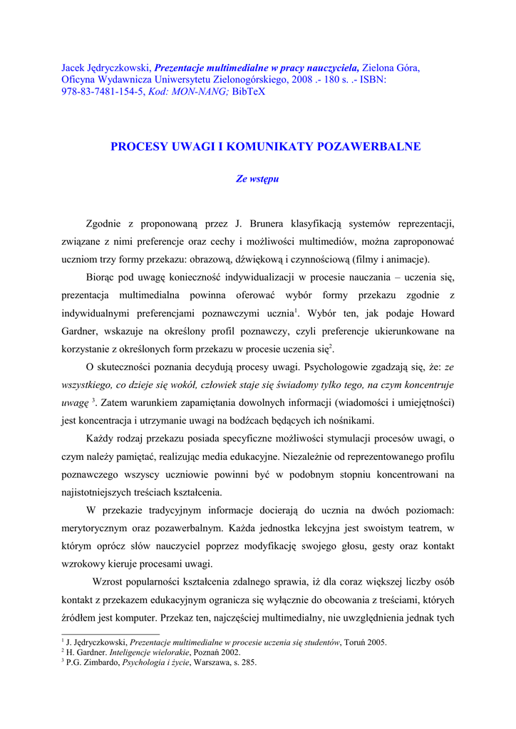 Jacek Jędryczkowski, Prezentacje multimedialne w pracy nauczyciela, Zielona Góra, Oficyna Wydawnicza Uniwersytetu Zielonogórskiego, 2008 .- 180 s. .- ISBN: 978-83-7481-154-5, Kod: MON-NANG; BibTeX PROCESY UWAGI I KOMUNIKATY POZAWERBALNE Ze wstępu Zgodnie z proponowaną przez J. Brunera klasyfikacją systemów reprezentacji, związane z nimi preferencje oraz cechy i możliwości multimediów, można zaproponować uczniom trzy formy przekazu: obrazową, dźwiękową i czynnościową (filmy i animacje). Biorąc pod uwagę konieczność indywidualizacji w procesie nauczania – uczenia się, prezentacja multimedialna powinna oferować wybór formy przekazu zgodnie z indywidualnymi preferencjami poznawczymi ucznia1. Wybór ten, jak podaje Howard Gardner, wskazuje na określony profil poznawczy, czyli preferencje ukierunkowane na korzystanie z określonych form przekazu w procesie uczenia się2. O skuteczności poznania decydują procesy uwagi. Psychologowie zgadzają się, że: ze wszystkiego, co dzieje się wokół, człowiek staje się świadomy tylko tego, na czym koncentruje uwagę 3. Zatem warunkiem zapamiętania dowolnych informacji (wiadomości i umiejętności) jest koncentracja i utrzymanie uwagi na bodźcach będących ich nośnikami. Każdy rodzaj przekazu posiada specyficzne możliwości stymulacji procesów uwagi, o czym należy pamiętać, realizując media edukacyjne. Niezależnie od reprezentowanego profilu poznawczego wszyscy uczniowie powinni być w podobnym stopniu koncentrowani na najistotniejszych treściach kształcenia. W przekazie tradycyjnym informacje docierają do ucznia na dwóch poziomach: merytorycznym oraz pozawerbalnym. Każda jednostka lekcyjna jest swoistym teatrem, w którym oprócz słów nauczyciel poprzez modyfikację swojego głosu, gesty oraz kontakt wzrokowy kieruje procesami uwagi. Wzrost popularności kształcenia zdalnego sprawia, iż dla coraz większej liczby osób kontakt z przekazem edukacyjnym ogranicza się wyłącznie do obcowania z treściami, których źródłem jest komputer. Przekaz ten, najczęściej multimedialny, nie uwzględnienia jednak tych 1 J. Jędryczkowski, Prezentacje multimedialne w procesie uczenia się studentów, Toruń 2005. H. Gardner. Inteligencje wielorakie, Poznań 2002. 3 P.G. Zimbardo, Psychologia i życie, Warszawa, s. 285. 2 stymulacji, które w sposób pozawerbalny zapewniał tradycyjny kontakt z nauczycielem. Jednym z celów niniejszego opracowania jest wskazanie możliwość odwzorowywania w komunikacie multimedialnym tego typu stymulacji. Sytuacja, w której uczeń wchodzi w interakcje z mediami elektronicznymi niesie ogromny potencjał. Odwzorowana jest idealna sytuacja, tj. w procesie edukacyjnym uczestniczy wyłącznie uczeń i mistrz. Stwarza to szansę na niespotykaną dotąd indywidualizację, szansę, której nie wolno zmarnować. PROCESY UWAGI I KOMUNIKATY POZAWERBALNE Z V ROZDZIAŁU: Koncentracja i utrzymanie uwagi w procesie uczenia się z zastosowaniem prezentacji multimedialnych O skuteczności poznania decydują procesy uwagi. Psychologowie zgadzają się, że: ze wszystkiego, co dzieje się wokół, człowiek staje się świadomy tylko tego, na czym koncentruje uwagę 4. Zatem warunkiem uczenia się (zapamiętania - kodowania) dowolnych informacji (wiadomości i umiejętności) jest koncentracja i utrzymanie uwagi na bodźcach będących ich nośnikami5. W przekazie tradycyjnym informacje docierają do ucznia na dwóch poziomach: merytorycznym oraz pozawerbalnym. Z punktu widzenia skuteczności oddziaływań w procesie nauczania - uczenia się najistotniejsza jest treść, ale to właśnie sygnały pozawerbalne koncentrują i utrzymują na niej uwagę. Niestety przekaz medialny bardzo często jest pozbawiony tego typu stymulacji. Na znaczenie podwójnej stymulacji procesów poznawczych wskazuje Edward T. Hall, przypisując każdemu człowiekowi pozawerbalny program komunikacyjny stanowiący najbardziej odporny na zmiany poziom zachowań akceptowany przez dany krąg kulturowy6. Każda zatem jednostka lekcyjna jest swoistym teatrem, w którym oprócz słów nauczyciel poprzez modyfikację swojego głosu, jego głośność oraz zabarwienie emocjonalne 4 P.G. Zimbardo, op.cit., s. 285 Por. Z. Włodarski, op.cit., s. 31-35.; L. S. Wygotski, Myślenie i mowa, Warszawa 1989, s.90.; P. G. Zimbardo, op.cit., s. 285. 6 E. T. Hall, Poza kulturą, Warszawa 2001. 5 akcentuje najistotniejsze treści przekazu. Temu celowi służy także wszelka gestykulacja, mimika, kontakt wzrokowy, pukanie w tablicę, podkreślanie fragmentów tekstu itp. Ze względu na dynamikę tych zachowań, stymulują one przede wszystkim uwagę mimowolną7. W przypadku komunikatu multimedialnego istnieje możliwość odwzorowania tego typu stymulacji w obszarze wszystkich form przekazu (rys.5.2). Rys. 5.2. Tradycyjny przekaz edukacyjny oferuje zawsze dwa równoległe nurty: pierwszy merytoryczny oraz drugi pozawerbalny – koncentrujący uwagę na najistotniejszych treściach przekazu. Konstruując media edukacyjne, należy podjąć próbę odwzorowania stymulacji, które odpowiadają oddziaływaniom pozawerbalnym Jerome S. Bruner twierdzi, że człowiek przechowuje dawne doświadczenia w formie modelu świata. Konstruowanie jego reprezentacji odbywa się za pomocą trzech metod: poprzez organizację wizualną, przedstawienia słowne i językowe oraz działanie8. Związek filmu i animacji z kształtowaniem się struktur reprezentacji czynnościowej można wyjaśnić, odwołując się do społecznej teorii uczenia się Alberta Bandury9. Biorąc pod uwagę proponowaną przez J. Brunera klasyfikację systemów reprezentacji, związane z nimi preferencje oraz możliwości współczesnych multimediów, osobom uczącym się można zaproponować trzy formy przekazu: obrazową z przewagą tekstu i grafiki, symboliczną (dźwiękową) z przewagą dźwięków i grafiki oraz czynnościową z przewagą udźwiękowionych filmów i animacji. Teori