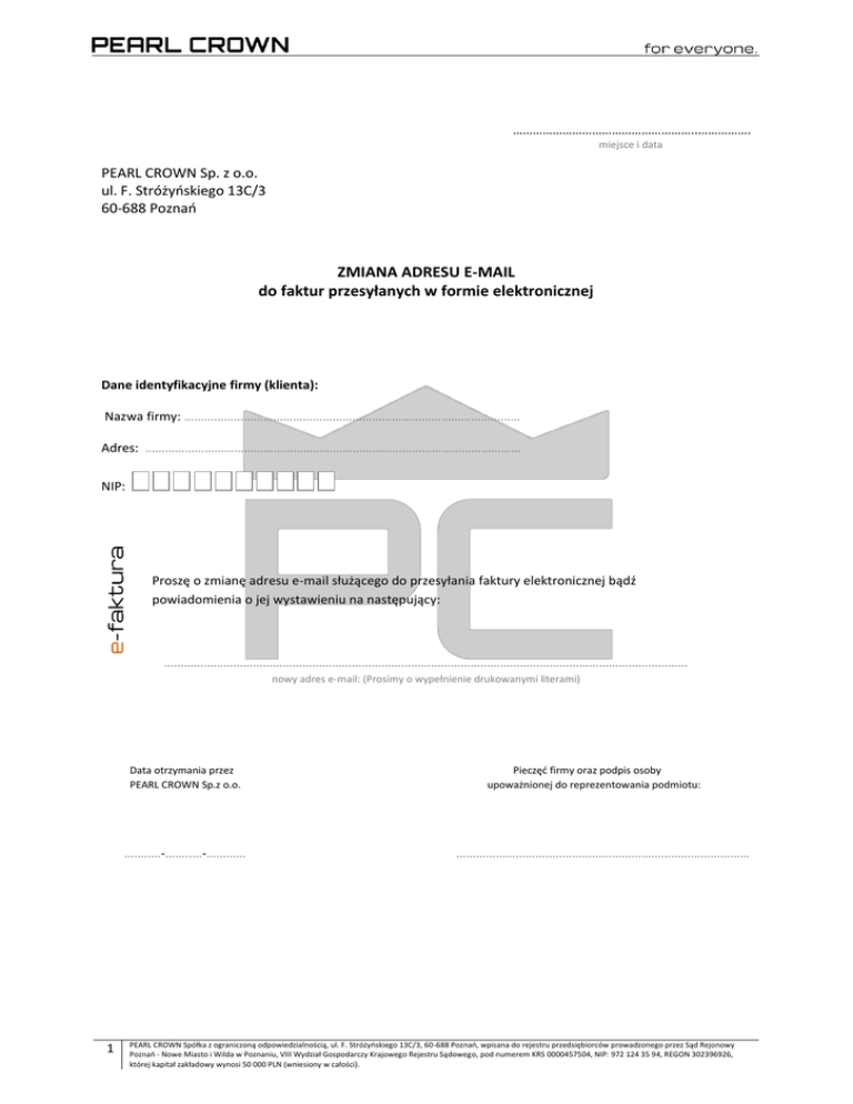 ………………………………………………..……………. miejsce i data PEARL CROWN Sp. z o.o. ul. F. Stróżyoskiego 13C/3 60-688 Poznao ZMIANA ADRESU E-MAIL do faktur przesyłanych w formie elektronicznej Dane identyfikacyjne firmy (klienta): Nazwa firmy: ………………………………………………………………………………………… Adres: …………………………………………………………………………………………………… NIP: Proszę o zmianę adresu e-mail służącego do przesyłania faktury elektronicznej bądź powiadomienia o jej wystawieniu na następujący: …………………………………………………………………………………………………………………………………………… nowy adres e-mail: (Prosimy o wypełnienie drukowanymi literami) Data otrzymania przez PEARL CROWN Sp.z o.o. ……..…-……..…-………… 1 Pieczęd firmy oraz podpis osoby upoważnionej do reprezentowania podmiotu: ………………………..…………………………………………………… PEARL CROWN Spółka z ograniczoną odpowiedzialnością, ul. F. Stróżyoskiego 13C/3, 60-688 Poznao, wpisana do rejestru przedsiębiorców prowadzonego przez Sąd Rejonowy Poznao - Nowe Miasto i Wilda w Poznaniu, VIII Wydział Gospodarczy Krajowego Rejestru Sądowego, pod numerem KRS 0000457504, NIP: 972 124 35 94, REGON 302396926, której kapitał zakładowy wynosi 50 000 PLN (wniesiony w całości).