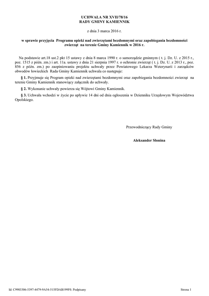 UCHWAŁA NR XVII/78/16 RADY GMINY KAMIENNIK z dnia 3 marca 2016 r. w sprawie przyjęcia Programu opieki nad zwierzętami bezdomnymi oraz zapobiegania bezdomności zwierząt na terenie Gminy Kamiennik w 2016 r. Na podstawie art.18 ust.2 pkt 15 ustawy z dnia 8 marca 1990 r. o samorządzie gminnym ( t. j. Dz. U. z 2015 r., poz. 1515 z późn. zm.) i art. 11a. ustawy z dnia 21 sierpnia 1997 r. o ochronie zwierząt ( t. j. Dz. U. z 2013 r., poz. 856 z późn. zm.) po zaopiniowaniu projektu uchwały przez Powiatowego Lekarza Weterynarii i zarządców obwodów łowieckich Rada Gminy Kamiennik uchwala co następuje: § 1. Przyjmuje się Program opieki nad zwierzętami bezdomnymi oraz zapobiegania bezdomności zwierząt na terenie Gminy Kamiennik stanowiący załącznik do uchwały. § 2. Wykonanie uchwały powierza się Wójtowi Gminy Kamiennik. § 3. Uchwała wchodzi w życie po upływie 14 dni od dnia ogłoszenia w Dzienniku Urzędowym Województwa Opolskiego. Przewodniczący Rady Gminy Aleksander Słonina Id: C9903306-5397-4479-9A54-515FDAB199F0. Podpisany Strona 1 Załącznik do Uchwały Nr XVII/78/16 Rady Gminy Kamiennik z dnia 3 marca 2016 r. Program opieki nad zwierzętami bezdomnymi oraz zapobiegania bezdomności zwierząt na terenie Gminy Kamiennik w 2016 roku. Rozdział 1 POSTANOWIAENIA OGÓLNE 1. Ilekroć w uchwale jest mowa o: 1) zwierzętach bezdomnych, należy przez to rozumieć zwierzęta domowe lub gospodarskie, które uciekły, zabłąkały się lub zostały porzucone przez człowieka, a nie ma możliwości ustalenia ich właściciela lub innej osoby, pod której opieką trwale dotąd pozostawały; 2) zwierzętach domowych, należy przez to rozumieć zwierzęta tradycyjnie przebywające wraz z człowiekiem w jego domu lub odpowiednim pomieszczeniu, utrzymywane przez człowieka w charakterze jego towarzysza; 3) zwierzętach gospodarskich, należy przez to rozumieć zwierzęta gospodarskie w rozumieniu przepisów o hodowli i rozrodzie zwierząt gospodarskich, 4) kotach wolno żyjących, należy przez to rozumieć koty urodzone lub żyjące na wolności ( żyjące w otoczeniu człowieka w stanie dzikim) 5) przytulisku, należy przez to rozumieć miejsce czasowego pobytu zwierząt przed oddaniem ich do schroniska lub adopcji, 6) Programie, należy przez to rozumieć Program opieki nad zwierzętami bezdomnymi orazzapobiegania bezdomności zwierząt na terenie gminy Kamiennik. 2. Koordynatorem Programu jest Wójt Gminy Kamiennik za pośrednictwem pracownika Urzędu Gminy współpracującym w tym zakresie z Powiatową Inspekcją Weterynaryjną w Nysie 3. Wykonawcami programu są: 1) Gmina; 2) Schroniska dla zwierząt w miejscowościach Szczyty , Paryż, SOS dla zwierząt w Chorzowie, 3) policja i straż pożarna , 4) dzierżawcy obwodów łowieckich na terenie gminy Kamiennik, 5) organizacje pozarządowe, których statutowym celem jest ochrona zwierząt współpracujące z urzędem gminy, Rozdział 2 CEL WPROWADZENIA PROGRAMU Celem Programu jest zapobieganie bezdomności zwierząt oraz opieka nad zwierzętami bezdomnymi przez: 1. Zapewnienie opieki bezdomnym zwierzętom z terenu Gminy Kamiennik oraz zwierzętom miejsca w schronisku dla zwierząt. 2. Sprawowanie opieki nad kotami wolno żyjącymi w tym ich dokarmianie. 3. Ograniczenie populacji zwierząt bezdomnych poprzez sterylizację, kastrację i usypianie ślepych miotów. 4. Zapewnienie całodobowej opieki weterynaryjnej w przypadkach zdarzeń drogowych z udziałem zwierząt. 5. Opieka nad zwierzętami gospodarskimi pozbawionymi właściwej opieki. Id: C9903306-5397-4479-9A54-515FDAB199F0. Podpisany Strona 1 6. Edukacja mieszkańców Gminy Kamiennik w zakresie opieki nad zwierzętami i humanitarnego traktowania zwierząt. Rozdział 3 REALIZACJA ZAŁOŻONYCH CELÓW 1. Zapewnienie opieki bezdomnym zwierzętom z terenu Gminy Kamiennik oraz zwierzętom miejsca w schronisku dla zwierząt. 1.1. Odławianie bezdomnych zwierząt z terenu Gminy Kamiennik i zapewnienie im należytej opieki poprzez: 1. odławianie zwierząt za pomocą specjalistycznego sprzętu , który nie będzie stwarzał zagrożenia dla zdrowia i życia wyłapywanych zwierząt oraz nie będzie zadawał im cierpienia, transport, opieka nad bezdomnymi zwierzętami realizowane są przez firmę P.U.P.H.W „GABI” Gabriela Bartoszek, ul. Dworcowa 24, 47-120 Żędowice, 2. umieszczanie bezdomnych zwierząt w schronisku zgodnie z podpisaną umową tj. 1) Szczyty ul. Wieluńska 108 2) Paryż 7a 3) SOS dla zwierząt w Chorzowie 1.2. Zapewnienie opieki weterynaryjnej, schronienia i wyżywienia bezdomnym zwierzętom, do czasu przekazania ich do schroniska lub zainteresowanym nowym właścicielom poprzez: 1) współpracę z Gabinetem Kamiennik, Weterynaryjnym lek. wet. Stanisław Skowron ul. T. Kościuszki 6c, 48-388 2) zakup przez Gminę pożywienia dla bezdomnych zwierząt, 3) współpracę z organizacjami pozarządowymi oraz podmiotami i osobami fizycznymi, 4) zapewnienie tymczasowego schronienia w przytulisku dla odłowionych zwierząt do czasu przekazania ich do schroniska lub nowym właścicielom, 2. Sprawowanie opieki nad kotami wolno żyjącymi w tym ich dokarmianie. 2.1. Zakup karmy dla wolno żyjących kotów. 2.2. Koty wolno żyjące, bytują głownie w piwnicach budynków mieszkalnych, budynkach gospodarczych, są elementem ekosystemu, a ich obecność zapobiega rozprzestrzenianiu się gryzoni ( myszy i szczurów). Sprawowanie opieki nad kotami wolno żyjącymi w tym ich dokarmianie sprawowane będzie w miejscach ich przebywania każdorazowo po zgłoszeniu takiej potrzeby przez sołtysów poszczególnych sołectw, oraz współpracę w tym zakresie podmiotami społecznymi w tym osobami fizycznymi i organizacjami pozarządowymi. 3. Ograniczenie miotów. populacji zwierząt bezdomnych poprzez sterylizację, kastrację i usypianie ślepych 3. 1. Ograniczenie populacji bezdomnych zwierząt poprzez sterylizację i kastrację psów i kotów, realizowane jest przez gminę i sc
