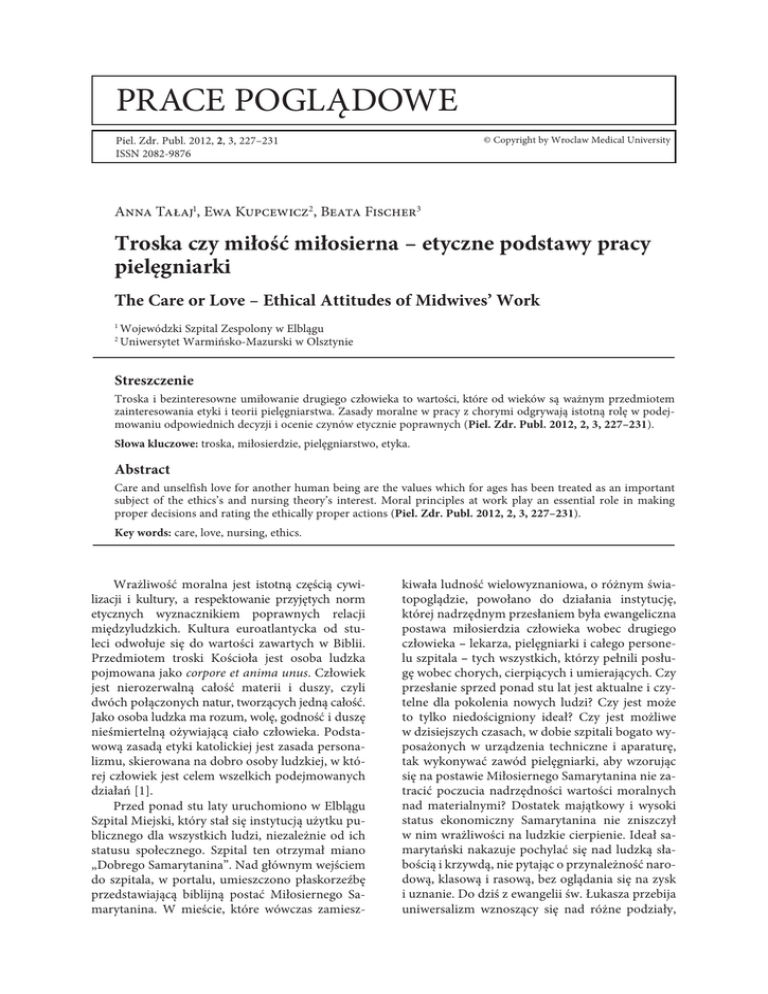prace poglądowe Piel. Zdr. Publ. 2012, 2, 3, 227–231 ISSN 2082-9876 © Copyright by Wroclaw Medical University Anna Tałaj1, Ewa Kupcewicz2, Beata Fischer3 Troska czy miłość miłosierna – etyczne podstawy pracy pielęgniarki The Care or Love – Ethical Attitudes of Midwives’ Work 1 2 Wojewódzki Szpital Zespolony w Elblągu Uniwersytet Warmińsko-Mazurski w Olsztynie Streszczenie Troska i bezinteresowne umiłowanie drugiego człowieka to wartości, które od wieków są ważnym przedmiotem zainteresowania etyki i teorii pielęgniarstwa. Zasady moralne w pracy z chorymi odgrywają istotną rolę w podejmowaniu odpowiednich decyzji i ocenie czynów etycznie poprawnych (Piel. Zdr. Publ. 2012, 2, 3, 227–231). Słowa kluczowe: troska, miłosierdzie, pielęgniarstwo, etyka. Abstract Care and unselfish love for another human being are the values which for ages has been treated as an important subject of the ethics’s and nursing theory’s interest. Moral principles at work play an essential role in making proper decisions and rating the ethically proper actions (Piel. Zdr. Publ. 2012, 2, 3, 227–231). Key words: care, love, nursing, ethics. Wrażliwość moralna jest istotną częścią cywilizacji i kultury, a respektowanie przyjętych norm etycznych wyznacznikiem poprawnych relacji międzyludzkich. Kultura euroatlantycka od stuleci odwołuje się do wartości zawartych w Biblii. Przedmiotem troski Kościoła jest osoba ludzka pojmowana jako corpore et anima unus. Człowiek jest nierozerwalną całość materii i duszy, czyli dwóch połączonych natur, tworzących jedną całość. Jako osoba ludzka ma rozum, wolę, godność i duszę nieśmiertelną ożywiającą ciało człowieka. Podstawową zasadą etyki katolickiej jest zasada personalizmu, skierowana na dobro osoby ludzkiej, w której człowiek jest celem wszelkich podejmowanych działań [1]. Przed ponad stu laty uruchomiono w Elblągu Szpital Miejski, który stał się instytucją użytku publicznego dla wszystkich ludzi, niezależnie od ich statusu społecznego. Szpital ten otrzymał miano „Dobrego Samarytanina”. Nad głównym wejściem do szpitala, w portalu, umieszczono płaskorzeźbę przedstawiającą biblijną postać Miłosiernego Samarytanina. W mieście, które wówczas zamiesz- kiwała ludność wielowyznaniowa, o różnym światopoglądzie, powołano do działania instytucję, której nadrzędnym przesłaniem była ewangeliczna postawa miłosierdzia człowieka wobec drugiego człowieka – lekarza, pielęgniarki i całego personelu szpitala – tych wszystkich, którzy pełnili posługę wobec chorych, cierpiących i umierających. Czy przesłanie sprzed ponad stu lat jest aktualne i czytelne dla pokolenia nowych ludzi? Czy jest może to tylko niedościgniony ideał? Czy jest możliwe w dzisiejszych czasach, w dobie szpitali bogato wyposażonych w urządzenia techniczne i aparaturę, tak wykonywać zawód pielęgniarki, aby wzorując się na postawie Miłosiernego Samarytanina nie zatracić poczucia nadrzędności wartości moralnych nad materialnymi? Dostatek majątkowy i wysoki status ekonomiczny Samarytanina nie zniszczył w nim wrażliwości na ludzkie cierpienie. Ideał samarytański nakazuje pochylać się nad ludzką słabością i krzywdą, nie pytając o przynależność narodową, klasową i rasową, bez oglądania się na zysk i uznanie. Do dziś z ewangelii św. Łukasza przebija uniwersalizm wznoszący się nad różne podziały, 228 również konfesyjne i światopoglądowe, a sam tekst może fascynować ludzi oddanych posłudze wobec potrzebujących pomocy. Nadal poruszają słowa: „Pewien człowiek schodził z Jerozolimy do Jerycha i wpadł w ręce zbójców. Ci nie tylko, że go obdarli, lecz jeszcze rany mu zadali i zostawiwszy na pół umarłego, odeszli. Przypadkiem przechodził tą drogą pewien kapłan; zobaczył go i minął. Tak samo lewita, gdy przyszedł na to miejsce i zobaczył go, minął. Pewien zaś Samarytanin, będąc w podróży, przechodził również obok niego. Gdy go zobaczył, wzruszył się głęboko: podszedł do niego i opatrzył mu rany, zalewając je oliwą i winem; potem wsadził go na swoje bydlę, zawiózł do gospody i pielęgnował go. Następnego zaś dnia wyjął dwa denary, dał gospodarzowi i rzekł: Miej o nim staranie, a jeśli co więcej wydasz, ja oddam tobie, gdy będę wracał” (Łk 10, 30–35) [2]. Sens rozwoju medycyny, nauki i wartości ekonomicznych tkwi w służbie człowiekowi, nadrzędnej wartości wszelkich działań. Najbardziej doskonałe warunki społeczne i ekonomiczne nie zastąpią ludzkiej wrażliwości, bliskiego kontaktu, solidarności i odruchu serca. Personel medyczny opiekując się chorymi i niosąc im ulgę musi pamiętać, że cierpienia duszy nie można rozdzielać od bólu fizycznego. Człowiekowi oczekującemu pomocy jest potrzebne „wsłuchiwanie się” w niego, bliskość i zrozumienie, a modelową postawą jest „odruch serca”. W pracy pielęgniarki nie sama pomoc choremu, wynikająca z obowiązku wykonywanego zawodu, ale sumienie i wewnętrzne przekonanie powinny wyznaczać normy działania. Wybór i wykonywanie zawodu pielęgniarki nie mogą być przypadkowe. Postawy pielęgniarek, ich stosunek do ludzi chorych i cierpiących świadczą o poziomie kultury nie tylko tej grupy zawodowej, ale całego społeczeństwa. Niezależnie od reprezentowanego światopoglądu nie sposób mówić o etyce w medycynie bez wskazania na jej chrześcijańskie korzenie, szczególnie, jeśli chodzi o dookreślające ją miłosierdzie i współczucie [3]. Etyka jako nauka zajmuje się problematyką dotyczącą moralności, powinnościami człowieka wobec innych ludzi. Podstawy etyki biorą się z obszarów filozofii, a filozoficzna koncepcja człowieka z teorii wartości i idei humanizmu [4]. Rolą etyki pielęgniarskiej jest określenie obowiązków tej grupy personelu medycznego wobec chorych, ludzi niepełnosprawnych, cierpią