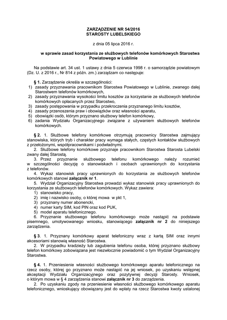 ZARZĄDZENIE NR 54/2016 STAROSTY LUBELSKIEGO z dnia 05 lipca 2016 r. w sprawie zasad korzystania ze słuŜbowych telefonów komórkowych Starostwa Powiatowego w Lublinie Na podstawie art. 34 ust. 1 ustawy z dnia 5 czerwca 1998 r. o samorządzie powiatowym (Dz. U. z 2016 r., Nr 814 z późn. zm.) zarządzam co następuje: § 1. Zarządzenie określa w szczególności: 1) zasady przyznawania pracownikom Starostwa Powiatowego w Lublinie, zwanego dalej Starostwem telefonów komórkowych, 2) zasady przyznawania wysokości limitu kosztów za korzystanie ze słuŜbowych telefonów komórkowych opłacanych przez Starostwo, 3) zasady postępowania w przypadku przekroczenia przyznanego limitu kosztów, 4) zasady przenoszenia praw i obowiązków oraz własności aparatu, 5) obowiązki osób, którym przyznano słuŜbowy telefon komórkowy, 6) zadania Wydziału Organizacyjnego związane z uŜywaniem słuŜbowych telefonów komórkowych. § 2. 1. SłuŜbowe telefony komórkowe otrzymują pracownicy Starostwa zajmujący stanowiska, których tryb i charakter pracy wymaga stałych, częstych kontaktów słuŜbowych z przełoŜonymi, współpracownikami i podwładnymi. 2. SłuŜbowe telefony komórkowe przyznaje pracownikom Starostwa Starosta Lubelski zwany dalej Starostą. 3. Przez przyznanie słuŜbowego telefonu komórkowego naleŜy rozumieć w szczególności decyzję o stanowiskach i osobach uprawnionych do korzystania z telefonów. 4. Wykaz stanowisk pracy uprawnionych do korzystania ze słuŜbowych telefonów komórkowych stanowi załącznik nr 1. 5. Wydział Organizacyjny Starostwa prowadzi wykaz stanowisk pracy uprawnionych do korzystania ze słuŜbowych telefonów komórkowych. Wykaz zawiera: 1) stanowisko pracy, 2) imię i nazwisko osoby, o której mowa w pkt 1, 3) przyznany numer abonencki, 4) numer karty SIM, kod PIN oraz kod PUK, 5) model aparatu telefonicznego. 6. Przyznanie słuŜbowego telefonu komórkowego moŜe nastąpić na podstawie pisemnego, umotywowanego wniosku, stanowiącego załącznik nr 2 do niniejszego zarządzenia. § 3. 1. Przyznany komórkowy aparat telefoniczny wraz z kartą SIM oraz innymi akcesoriami stanowią własność Starostwa. 2. W przypadku kradzieŜy lub zagubienia telefonu osoba, której przyznano słuŜbowy telefon komórkowy zobowiązana jest niezwłocznie powiadomić o tym Wydział Organizacyjny Starostwa. § 4. 1. Przeniesienie własności słuŜbowego komórkowego aparatu telefonicznego na rzecz osoby, której go przyznano moŜe nastąpić na jej wniosek, po uzyskaniu wstępnej akceptacji Wydziału Organizacyjnego oraz pozytywnej decyzji Starosty. Wniosek, o którym mowa w § 4 zarządzenia stanowi załącznik nr 3 do zarządzenia. 2. Po uzyskaniu zgody na przeniesienie własności słuŜbowego komórkowego aparatu telefonicznego, wnioskujący obowiązany jest do wpłaty na rzecz Starostwa kwoty ustalonej przez stałą komisję do oceny przydatności składników rzeczowych majątku ruchomego, stanowiących własność Starostwa Powiatowego w Lublinie. Po dokonaniu wpłaty komórkowy aparat telefoniczny staje się własnością osoby wnioskującej. W sprawach nieuregulowanych stosuje się obowiązujące w danym czasie w Starostwie zasady gospodarowania składnikami majątkowymi. 3. Przeniesienie numeru telefonu komórkowego na rzecz osoby, której go przyznano moŜe nastąpić w wyjątkowych sytuacjach na jej wniosek, po uzyskaniu wstępnej akceptacji Wydziału Organizacyjnego oraz pozytywnej decyzji Starosty. Wniosek, o którym mowa w § 4 zarządzenia stanowi załącznik nr 3 do zarządzenia. § 5. 1. Starostwo pokrywa miesięczny koszt brutto uŜywania słuŜbowego telefonu komórkowego. 2. Pracownicy, którym zostały przyznane słuŜbowe telefony komórkowe otrzymują do dyspozycji plany taryfowe bez limitu minut i SMS/MMS-ów w ruchu krajowym. 3. Brak limitu w ruchu krajowym nie dotyczy wysłanych/odebranych wiadomości SMS/MMS Premium oraz połączeń z numerami o podwyŜszonej opłacie. 4. W przypadku słuŜbowych podróŜy zagranicznych kaŜdorazowo przed wyjazdem pracownik zwraca się do Starosty z wnioskiem określonym w załączniku nr 4 o ustalenie indywidualnego limitu kosztów wykonanych/odebranych połączeń głosowych oraz wysłanych SMS-ów w Roamingu. 5. Podpisany przez Starostę wniosek z ustalonym limitem, o którym mowa w ust. 4 pracownik przekazuje do referatu Or-ISI. 6. W przypadku przekroczenia przez pracownika limitu, o którym mowa w ust. 5 pracownik zobowiązany jest do uiszczenia na rzecz Starostwa róŜnicy pomiędzy wysokością naliczonych przez operatora kosztów zrealizowanych połączeń głosowych i wysłanych SMSów w Roamingu dla danego numeru a przyznanym przez Starostę limitem. Brak dostarczonego do referatu Or-ISI podpisanego przez Starostę wniosku skutkuje obciąŜeniem pracownika kosztami zrealizowanych połączeń głosowych i wysłanych SMS-ów w Roamingu. 7. Naliczone przez operatora opłaty za transmisję danych w Roamingu, wysłane/odebrane wiadomości SMS/MMS Premium oraz wykonane połączenia z numerami o podwyŜszonej opłacie zarówno w ruch krajowym jak i Roamingu w całości obciąŜają pracownika. § 6. Osoba, której przyznano telefon komórkowy: 1) podpisuje: a) w dwóch egzemplarzach protokół zdawczo – odbiorczy słuŜbowego telefonu komórkowego wraz z kartą SIM, numerem abonenckim, kodem PIN oraz PUK, akcesoriami oraz określonym miesięcznym limitem kosztów abonamentu, wzór protokołu stanowi załącznik nr 5 do zarządzenia, b) oświadczenie o: − odpowiedzialności materialnej za powierzony składnik majątkowy Starostwa, − wyraŜeniu zgody na potrącanie z wynagrodzenia za pracę albo zobowiązaniu się do wpłaty na konto Starostwa naleŜności za przekroczenie limitu na zasadach określonych w § 5, − zapoznaniu się z niniejszym zarządzeniem, wzór oświadczenia stanowi załącznik nr 6 do zarządzenia. 2) zobowiązana jest w szczególności do: a) przestrzegania niniejsze
