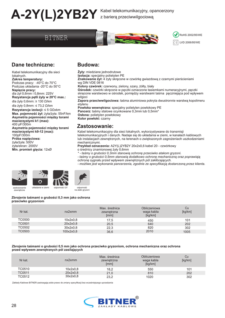 A-2Y(L)2YB2Y Kabel telekomunikacyjny, opancerzony z barierą przeciwwilgociową BITNERBITNER RoHS RoHS 2002/95/WE LVD 2006/95/WE Dane techniczne: Budowa: Kabel telekomunikacyjny dla sieci lokalnych. Zakres temperatury: Podczas pracy: -40°C do 70°C Podczas układania -20°C do 50°C Napięcie pracy: dla żył 0,6mm i 0,8mm: 225V Rezystancja pętli żyły w 20°C max.: dla żyły 0,6mm: ≥ 130 Ω/km dla żyły 0,8mm: ≤ 73,2 Ω/km Rezystancja izolacji: ≤ 5 GΩxkm Max. pojemność żył: żyła/żyła: 55nF/km Asymetria pojemności między torami macierzystymi k1 (max): 400 pF/300m Asymetria pojemności między torami macierzystymi k9-12 (max): 100pF/300m Próba napięciowa: żyła/żyła: 500V żyła/ekran: 2000V Min. promień gięcia: 12xØ Żyły: miedziane jednodrutowe Izolacja: specjalny polietylen PE Znakowanie żył: 4 żyły skręcone w czwórkę gwiazdową z czarnymi pierścieniami wg DIN VDE 0816 Kolory czwórek: czerwony, zielony, szary, żółty, biały Ośrodek: czwórki skręcone w pęczki oznaczone tasiemkami numeracyjnymi, pęczki skręcone warstwowo w ośrodek, pomiędzy warstwami taśma pęczniejąca pod wpływem wilgoci Zapora przeciwwilgociowa: taśma aluminiowa pokryta dwustronnie warstwą kopolimeru etylenu Powłoka wewnętrzna: specjalny polietylen powłokowy PE Pancerz: taśmy stalowe ocynkowane 0,3mm lub 0,5mm* Osłona: polietylen powłokowy Kolor powłoki: czarny Zastosowanie: Kabel telekomunikacyjny dla sieci lokalnych, wykorzystywane do transmisji telekomunikacyjnych i danych. Nadaje się do układania w ziemi, w kanałach kablowych lub instalacjach zewnętrznych, na terenach o zwiększonych zagrożeniach uszkodzeniami mechanicznymi. Przykład oznaczenia: A2Y(L)2YB2Y 20x2x0,6 kabel 20 - czwórkowy o średnicy znamionowej żyły 0,6mm * - taśmy o grubości 0,3mm stanowią ochronę przeciwko atakom gryzoni. - taśmy o grubości 0,5mm stanowią dodatkowo ochronę mechaniczną oraz poprawiają ochronę sygnału przed wpływem zewnętrznych pól zakłócających. - możliwe jest wykonanie pancerzenia, zgodnie ze specyfikacją dostarczoną przez klienta. UV zastosowanie zewnętrzne układanie w ziemi odporność UV odporność na ataki gryzoni Zbrojenie taśmami o grubości 0,3 mm jako ochrona przeciwko gryzoniom Nr kat. nx2xmm Max. średnica zewnętrzna [mm] TC0500 TC0501 TC0502 TC0503 10x2x0,8 20x2x0,8 30x2x0,8 100x2x0,8 17,5 20,5 22,3 36,6 Obliczeniowa waga kabla [kg/km] 450 640 820 2010 Cu [kg/km] 101 202 302 1005 Zbrojenie taśmami o grubości 0,5 mm jako ochrona przeciwko gryzoniom, ochrona mechaniczna oraz ochrona przed wpływem zewnętrznych pól zasilających Nr kat. TC0510 TC0511 TC0512 nx2xmm 10x2x0,8 20x2x0,8 30x2x0,8 Max. średnica zewnętrzna [mm] Obliczeniowa waga kabla [kg/km] 18,2 21,0 23,2 550 810 1020 Zakłady Kablowe BITNER zastrzegają sobie prawo do zmiany specyfikacji bez wcześniejszego uprzedzenia ® 28 Cu [kg/km] 101 202 302