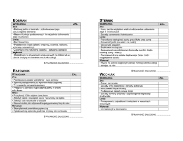 BOSMAN STERNIK WYMAGANIA ZAL. Zna: • Budowę jachtu z laminatu i potrafi nazwać jego poszczególne elementy • Nazwy i funkcje podstawowych lin na jachcie (olinowanie stałe i ruchome) Umie: • Buchtować liny • Podstawowe węzły (płaski, knagowy, ósemka, rożkowy, wybrany cumowniczy) • Zakończyć linę naturalną (opaska) i sztuczną (zatopić) Wykonał: • Uczestniczył w pływaniach szkoleniowych na Odrze lub w obozie drużyny w charakterze członka załogi SPRAWNOŚĆ ZALICZONO ..................... RATOWNIK WYMAGANIA ZAL. Zna: • Kursy jachtu względem wiatru i odpowiednie ustawienie żagli w tych kursach • Zasady cumowania i kotwiczenia Umie: • Prawidłowo obsługiwać szoty grota i foka oraz cumę • Prowadzić jacht (na wiatr i na punkt) • Wiosłować pagajem • Śrubkować na bączku • Zareagować na podstawowe komendy (na ster, żagle, kotwicę, cumy i miecz) • Rozpoznać stronę szlaku żeglownego (boje, tyki) i rozgałęzienie szlaku Wykonał: • Pływał na jachcie żaglowym pełniąc funkcję członka załogi i sterując na nim SPRAWNOŚĆ ZALICZONO ..................... WYMAGANIA Zna: ZAL. • Podstawowe zasady udzielania 1-szej pomocy • Sposób postępowania po wywrotce łodzi żaglowej • Trzy sposoby wzywania pomocy • Przepisy w zakresie wyposażenia jachtu w środki ratunkowe Umie: • Przepłynąć 100m stylem dowolnym • Założyć kapok i zawiązać węzeł ratowniczy na lądzie • Założyć koło ratunkowe w wodzie • Rzucać rzutką lub odpowiednio przygotowaną liną do celu Wykonał: • Skompletował prawidłową apteczkę • Opiekował się apteczką podczas imprezy lub na biwaku SPRAWNOŚĆ ZALICZONO ..................... WODNIAK WYMAGANIA ZAL. Zna: • Prawo harcerskie • Zasady etyki żeglarskiej i etykiety jachtowej • Wrocławski Węzeł Wodny • Podstawowe zasady prawa drogi • Zasady ochrony przyrody i zapobiegania degradacji środowiska Umie: • Postępować z odpadkami i śmieciami w warunkach obozowych Wykonał: • Uczestniczył w śluzowaniu SPRAWNOŚĆ ZALICZONO ..................... NAWIGATOR SZKUTNIK WYMAGANIA ZAL. Zna: • Rodzaje map • Podstawowe szkice terenowe • Sposoby określania stron świata Umie: • Posługiwać się kompasem • Zorientować mapę • Sprawnie posługiwać się mapą • Wyznaczyć azymut Wykonał: • Uczestniczył w marszu na azymut ZAL. Zna: • Zasady zimowej konserwacji jachtu z laminatu • Zastosowanie narzędzi stosowanych do remontu jachtu Wykonał: • Dokonał samodzielnie drobnej naprawy osprzętu • Brał czynny udział w remoncie jachtu SPRAWNOŚĆ ZALICZONO ..................... SZYPER SPRAWNOŚĆ ZALICZONO ..................... METEOROLOG WYMAGANIA WYMAGANIA ZAL. Zna: • Skalę Beauforta Umie: • Nazwać widoczne na niebie chmury i powiedzieć skąd się wzięły i co zwiastują • Odebrać i prawidłowo zinterpretować prognozę pogody • Powiedzieć dlaczego wieje wiatr i jaki wpływ mają na to różne zjawiska meteorologiczne Wykonał: • Na planie akwenu szkoleniowego zaznaczył(a) lokalne, specyficzne obszary wiatrowe SPRAWNOŚĆ ZALICZONO ..................... WYMAGANIA ZAL. Zna: • Zasady działania miecza i steru • Komendy żeglarskie • Zasady bezpieczeństwa podczas rejsu Umie: • Powiedzieć jakie różnice są między jachtem balastowym a mieczowym • Przepłynąć na wstecznym minimum 50 metrów • Opłynąć na żaglach boję tak, aby nie oddalić się od niej na więcej niż dwie długości jachtu. • Stanąć jachtem na kotwicy Wykonał: • Brał(a) udział w kilku wielodniowych rejsach/biwakach żeglarskich • Proste i złożone manewry jachtem mieczowym • Przygotował jacht do pływania i dokonał klaru po zajęciach SPRAWNOŚĆ ZALICZONO ..................... Opracowano: HOW Stanica, Wrocław, 1 lipca 2007