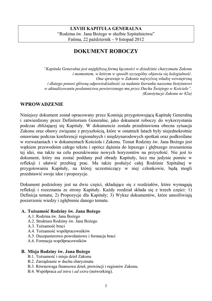 LXVIII KAPITUŁA GENERALNA “Rodzina św. Jana Bożego w służbie Szpitalnictwu” Fatima, 22 październik – 9 listopad 2012 DOKUMENT ROBOCZY “Kapituła Generalna jest najgłębszą formą łączności w dziedzinie charyzmatu Zakonu i momentem, w którym w sposób szczególny objawia się kolegialność. Ona sprawuje w Zakonie najwyższą władzę wewnętrzną i dlatego ponosi główną odpowiedzialność za nadanie kierunku naszemu Instytutowi w aktualizowaniu posłannictwa powierzonego mu przez Ducha Świętego w Kościele”. (Konstytucje Zakonu nr 82a) WPROWADZENIE Niniejszy dokument został opracowany przez Komisję przygotowującą Kapitułę Generalną i zatwierdzony przez Definitorium Generalne, jako dokument roboczy do wykorzystania podczas zbliżającej się Kapituły. W dokumencie została przedstawiona obecna sytuacja Zakonu oraz obawy związane z przyszłością, które w ostatnich latach były niejednokrotnie omawiane podczas konferencji regionalnych i międzynarodowych spotkań oraz podkreślane w rozważaniach i w dokumentach Kościoła i Zakonu. Temat Rodziny św. Jana Bożego jest wątkiem przewodnim całego tekstu i oprócz dążenia do lepszego i głębszego zrozumienia tej idei, ma także na celu poszukiwanie nowych horyzontów na przyszłość. Nie jest to dokument, który ma zostać poddany pod obrady Kapituły, lecz ma jedynie pomóc w refleksji i ułatwić przebieg prac. Ma także posłużyć całej Rodzinie Szpitalnej w przygotowaniu Kapituły, na której uczestniczący w niej członkowie, będą mogli przedstawić swoje idee i propozycje. Dokument podzielony jest na dwie części, składające się z rozdziałów, które wymagają refleksji i rozeznania ze strony Kapituły. Każdy rozdział składa się z trzech części: 1) Definicja tematu; 2) Propozycje dla Kapituły; 3) Wykaz dokumentów, które umożliwiają poszerzenie wiedzy i zgłębienie danego tematu. A. Tożsamość Rodziny św. Jana Bożego A.1. Rodzina św. Jana Bożego A.2. Struktura Rodziny św. Jana Bożego A.3. Tożsamość braci A.4. Tożsamość współpracowników A.5. Duszpasterstwo powołaniowe i formacja braci A.6. Formacja współpracowników B. Misja Rodziny św. Jana Bożego B.1. Tożsamość i misja dzieł Zakonu B.2. Zarządzanie w duchu charyzmatu B.3. Równowaga finansowa dzieł, prowincji i regionów Zakonu. B.4. Współpraca ad intra i ad extra (networking). 1 A TOŻSAMOŚĆ RODZINY ŚW. JANA BOŻEGO A.1. RODZINA ŚW. JANA BOŻEGO I. Definicja Dzieło św. Jana Bożego, w całej swej historii, realizowane było przez braci i współpracowników, oczywiście w różnym stopniu, w zależności od sytuacji danej epoki. Wszyscy doskonale wiemy, że w przeciągu ostatnich 40 lat uczestnictwo współpracowników w misji Zakonu znacznie wzrosło, dlatego też dzisiaj mówimy o braciach i współpracownikach zjednoczonych w misji. Sprawiło to, że w sposób nieformalny, na początku sporadycznie, zaczęliśmy mówić między sobą o nas, jako o Rodzinie. Niemniej jednak, w ostatnich latach, koncepcja ta przyjęła inne znaczenie w Zakonie, a nawet stopniowo znalazła swoje miejsce także w naszych dokumentach. Po raz pierwszy definicja Rodziny Szpitalnej św. Jana Bożego została sformułowana w Statutach Generalnych w 2009 r., i przewiduje ona różne stopnie przynależności: “Propagujemy wizję Zakonu jako “Rodziny Szpitalnej św. Jana Bożego” i przyjmujemy, jako dar Ducha dla naszych czasów, możliwość dzielenia naszego charyzmatu, duchowości i misji ze współpracownikami, uznając ich przymioty i talenty (SG 20) ... wiedząc, że ci współpracownicy mogą być związani z Rodziną Szpitalniczą w jednym lub kilku następujących wymiarach: poprzez dobrze wykonywaną własną pracę zawodową; poprzez włączenie się w misję Zakonu, kierując się swymi wartościami ludzkimi i/lub przekonaniami religijnymi; poprzez zaangażowania motywowane wiarą katolicką” (por. SG 22). Dziś nie istnieje już tylko jeden, wyłączny model rodziny, ani na poziomie kulturowym, ani społecznym, ani też prawnym. Odwołując się do słów Jana Pawła II, moglibyśmy powiedzieć, że Rodzina św. Jana Bożego jest wspólnotą, opierającą się na zaufaniu i wzajemnym wsparciu, hojności, otwarciu, prawdziwym szacunku, szpitalnictwie, w której wszyscy są współodpowiedzialni za misję. To, co jest naszą tożsamością i co nas jednoczy, jako Rodzinę, w realizacji jednej misji jest centralne miejsce, które zajmuje św. Jan Boży i charyzmat Szpitalnictwa, który nasz Założyciel otrzymał w darze od Boga i który przekazał swoim naśladowcom. Jan doświadczył przemiany życia, aby naśladować Boga Szpitalnictwa, Dobrego Samarytanina, ucieleśniając w sobie Szpitalnictwo. Bracia, w tej Rodzinie zajmują fundamentalne miejsce, jako osoby, które w radykalny sposób poświęciły swoje życie służbie Szpitalnictwu i przyjęły na siebie szczególny obowiązek pielęgnowania i rozwijania otrzymanego daru i przekazywania go współpracownikom. 2 Poprzez koncepcję “Rodziny św. Jana Bożego” chcemy promować otwarcie na współpracowników, aby dzielić z nimi nasz charyzmat, duchowość i naszą misję, zgodnie ze stylem św. Jana Bożego. Wierzymy, że jest to najbardziej aktualny i skuteczny sposób, aby w przyszłości kontynuować i rozwijać, poprzez szpitalnictwo, misję Kościoła, zgodnie z nauką Ewangelii i przykładem Jezusa oraz charyzmatem założycielskim św. Jana Bożego, nauczaniem papieży, Soboru Watykańskiego II, jak również zgodnie z zaleceniami naszych kapituł generalnych, naszych wyższych przełożonych oraz naszym własnym doświadczeniem. Obecnie Zakon prowadzi misję o większym niż kiedykolwiek zasięgu dzięki uczestnictwu i zaangażowaniu całej Rodziny Szpitalnej, co doceniamy i z czego bardzo się cieszymy, dziękując Panu za to, że dar Szpitalnictwa zainicjowany przez św. Jana Bożego pozostaje wciąż żywy. W tej perspekt