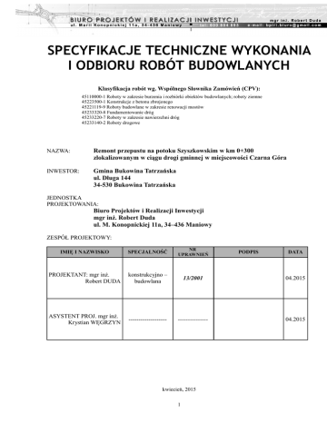 SPECYFIKACJE TECHNICZNE WYKONANIA I ODBIORU ROBÓT BUDOWLANYCH Klasyfikacja robót wg. Wspólnego Słownika Zamówień (CPV): 45110000-1 Roboty w zakresie burzenia i rozbiórki obiektów budowlanych; roboty ziemne 45223500-1 Konstrukcje z betonu zbrojonego 45221119-9 Roboty budowlane w zakresie renowacji mostów 45233320-8 Fundamentowanie dróg 45233220-7 Roboty w zakresie nawierzchni dróg 45233140-2 Roboty drogowe NAZWA: Remont przepustu na potoku Szyszkowskim w km 0+300 zlokalizowanym w ciągu drogi gminnej w miejscowości Czarna Góra INWESTOR: Gmina Bukowina Tatrzańska ul. Długa 144 34-530 Bukowina Tatrzańska JEDNOSTKA PROJEKTOWANIA: Biuro Projektów i Realizacji Inwestycji mgr inż. Robert Duda ul. M. Konopnickiej 11a, 34–436 Maniowy ZESPÓŁ PROJEKTOWY: IMIĘ I NAZWISKO SPECJALNOŚĆ NR UPRAWNIEŃ PROJEKTANT: mgr inż. Robert DUDA konstrukcyjno – budowlana 13/2001 04.2015 ASYSTENT PROJ. mgr inż. Krystian WĘGRZYN ------------------- --------------- 04.2015 kwiecień, 2015 1 PODPIS DATA Wymagania ogólne D-M-00.00.00........................................................................3 Roboty przygotowawcze D–01.00.00.................................................................11 Wytyczenie trasy i punktów wysokościowych D–01.01.01...............................................11 Rozbiórka elementów dróg D–01.02.04........................................................................13 Roboty ziemne D–02.00.00................................................................................15 Roboty ziemne – Wymagania ogólne D–02.00.01...........................................................15 Wykonanie wykopów w gruntach nieskalistych D–02.01.01.............................................19 Wykonanie nasypów D–02.03.01.................................................................................21 Przepusty pod koroną drogi D–03.01.00............................................................26 Przepusty pod koroną drogi D-03.01.01........................................................................26 Stal zbrojeniowa M–12.01.01......................................................................................31 Beton konstrukcyjny M–13.01.01.................................................................................35 Podbudowy D–04.00.00.....................................................................................48 Koryto wraz z profilowaniem i zagęszczeniem podłoża D–04.01.01...................................48 Warstwa odcinająca (separująca) D–04.02.01...............................................................51 Warstwa mrozoochronna D–04.02.02...........................................................................53 Oczyszczenie i skropienie warstw konstrukcyjnych D–04.03.01........................................56 Podbudowa z kruszyw. Wymagania ogólne D–04.04.00..................................................58 Podbudowa z kruszywa naturalnego zagęszczonego mechanicznie D–04.04.01..................62 Podbudowa z kruszywa łamanego zagęszczonego mechanicznie D–04.04.02.....................64 Nawierzchnie D–05.00.00..................................................................................66 Nawierzchnia z betonu asfaltowego D–05.03.05............................................................66 Nawierzchnia z kostki brukowej betonowej D–05.03.23..................................................76 Urządzenia bezpieczeństwa ruchu D-07.00.00...................................................80 Bariery ochronne na obiektach mostowych M-19.01.03..................................................80 Elementy ulic D–08.00.00...................................................................................83 Krawężniki betonowe D–08.01.01................................................................................83 Krawężniki kamienne M–19.01.01................................................................................87 Betonowe obrzeża chodnikowe D–08.03.01...................................................................89 2 Wymagania ogólne D-M-00.00.00 1. WSTĘP 1.1. Przedmiot SST Przedmiotem niniejszej szczegółowej specyfikacji technicznej (skrót: SST) są wymagania ogólne dotyczące wykonawstwa i odbioru robót w ramach inwestycji obejmującej remont przepustu na potoku Szyszkowskim w m. Czarna Góra. 1.2. Zakres stosowania SST SST jest stosowana jako dokument przetargowy i kontraktowy przy wykonaniu robót wymienionych w pkt 1.1 niniejszej SST. 1.3. Zakres robót ujętych w SST Ustalenia zawarte w niniejszej specyfikacji obejmują wymagania ogólne, wspólne dla robót objętych szczegółowymi specyfikacjami technicznymi na poszczególne asortymenty i należy je rozumieć i oraz stosować w powiązaniu z nimi. 1.4. Określenia stosowane w SST niezdefiniowane w materiałach ogólnodostępnych 1.4.1. Inspektor Nadzoru Inwestorskiego – osoba wyznaczona przez Zamawiającego (o której wyznaczeniu poinformowany jest Wykonawca), odpowiedzialna za nadzorowanie robót. Ilekroć w SST występuje słowo „Inspektor” oznacza Inspektora Nadzoru Inwestorskiego. 1.4.2. Polecenie Inspektora – wszelkie polecenia przekazane Wykonawcy przez Inspektora w formie pisemnej lub ustnej, dotyczące sposobu realizacji robót lub innych spraw związanych z prowadzeniem budowy. 1.5. Ogólne wymagania dotyczące robót Wykonawca jest odpowiedzialny za jakość wykonanych robót, bezpieczeństwo wszelkich czynności na terenie budowy, metody użyte przy budowie oraz za ich zgodność z dokumentacją projektową, SST i poleceniami Inspektora. 1.5.1. Przekazanie terenu budowy Zamawiający przekaże Wykonawcy teren budowy wraz ze wszystkimi wymaganymi uzgodnieniami prawnymi i administracyjnymi, dziennik budowy oraz określoną w specyfikacji przetargowej ilość egzemplarzy dokumentacji projektowej oraz kompletów SST. Na Wykonawcy spoczywa odpowiedzia